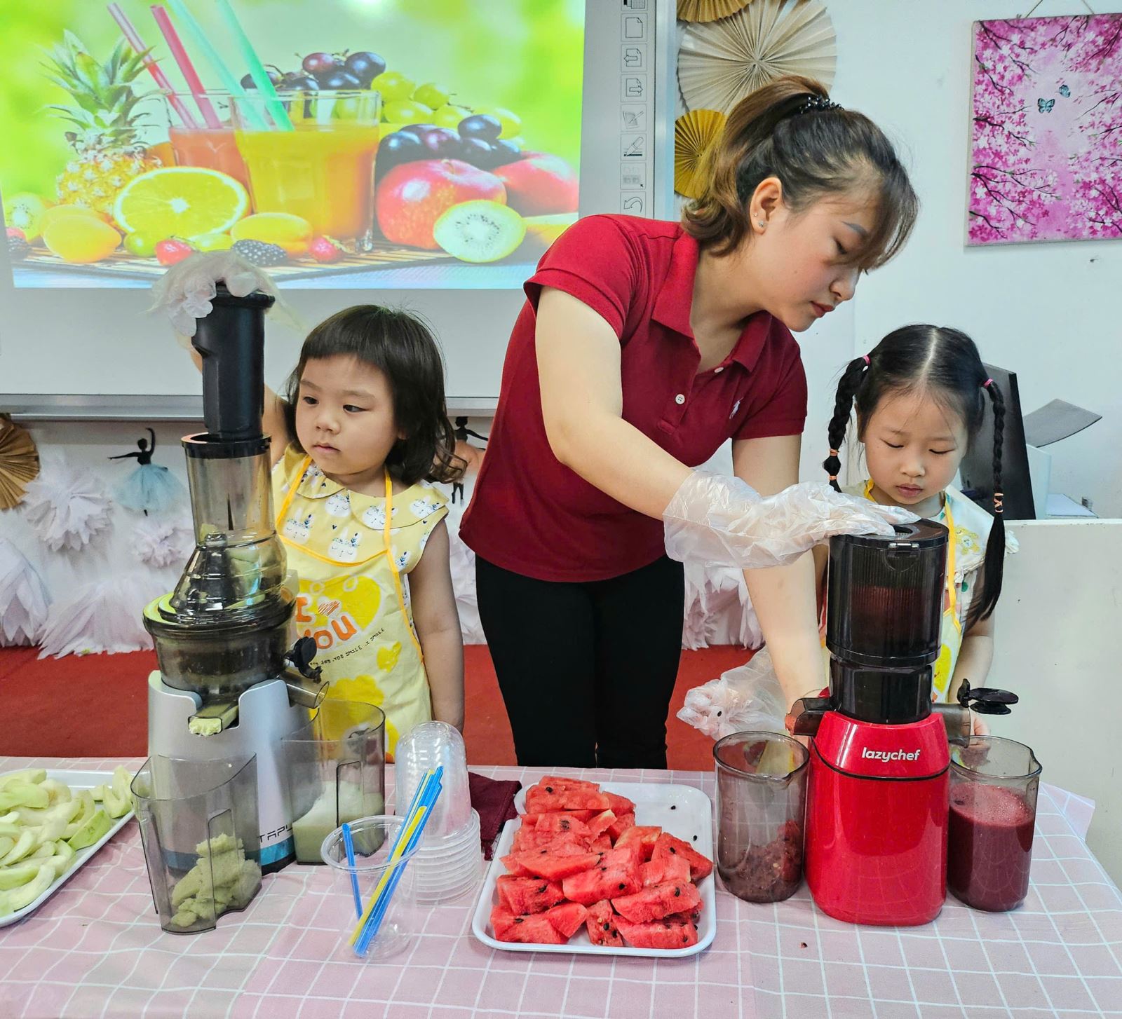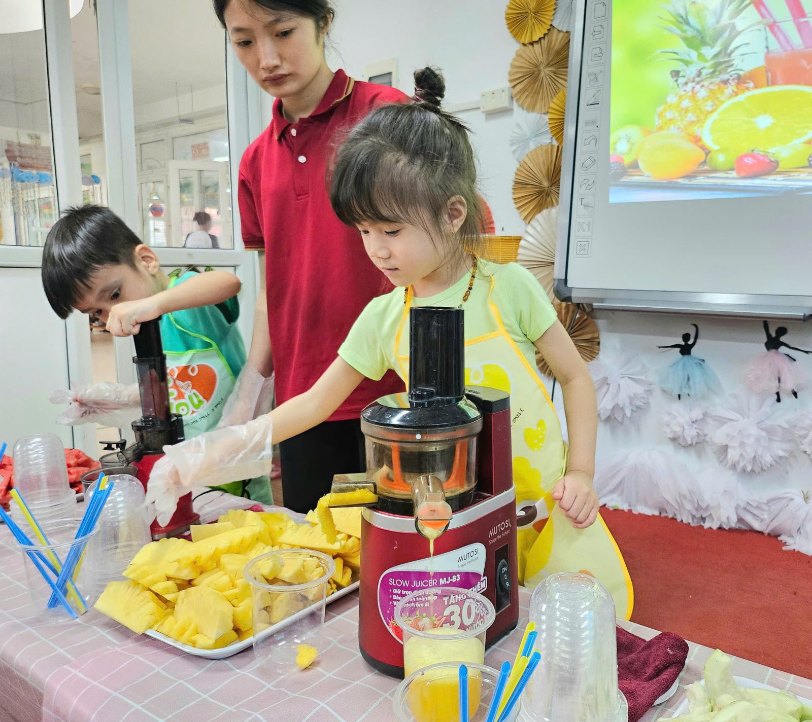 Trong hoạt động, các con rất tò mò và thích thú trước những loại trái cây đầy màu sắc như dứa, dưa hấu, ổi,… Tự tay ép từng lát trái cây, chờ đợi thành phẩm và reo lên thích thú khi ly nước ép đầu tiên hoàn thành. Bé nào cũng muốn tự tay rót ra ly, mời bạn bè và cô giáo cùng thưởng thức.