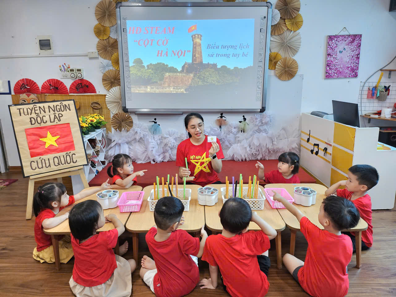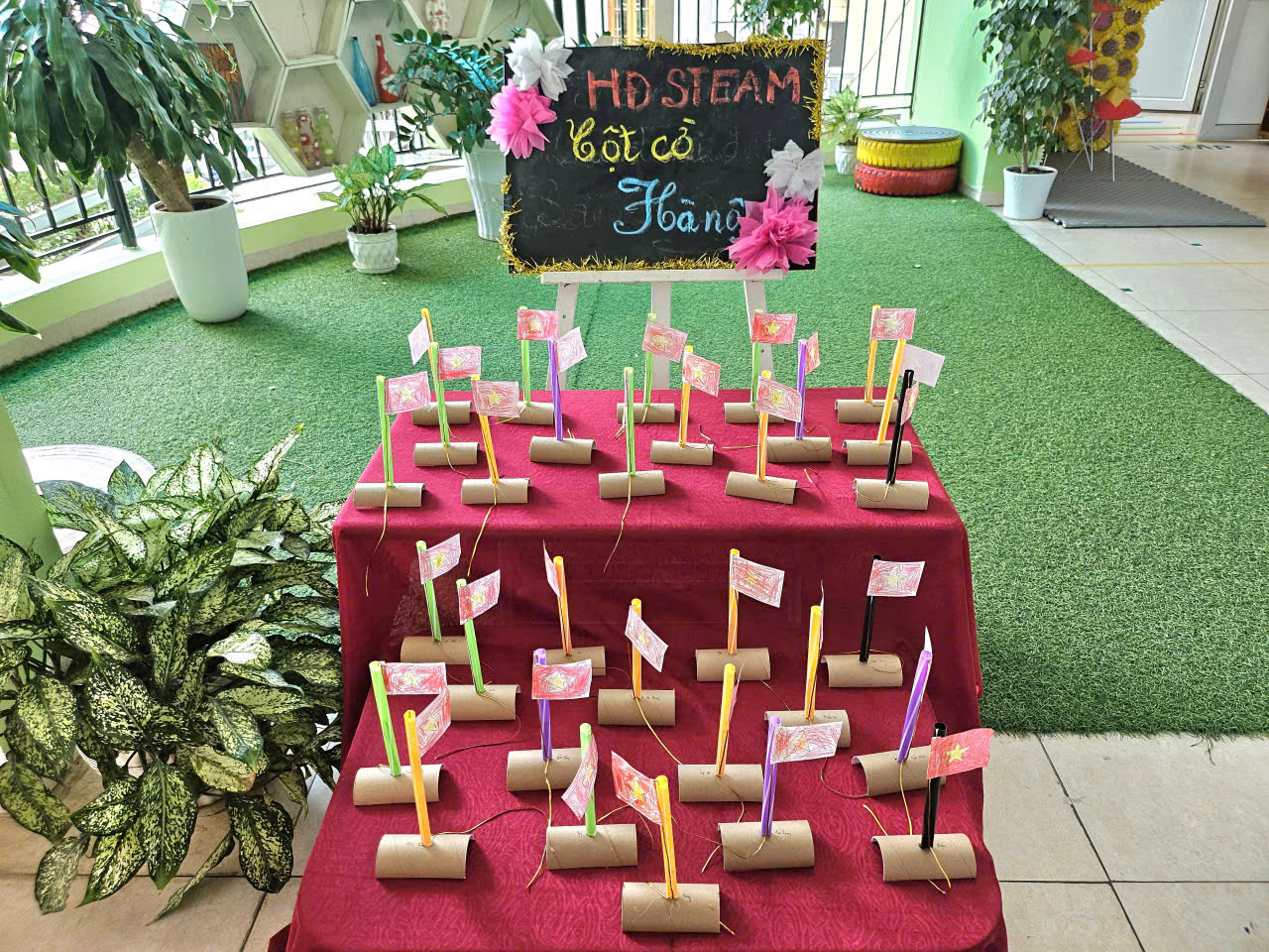 Bằng sự khéo léo và sáng tạo, các bé đã tự tay tạo nên những mô hình cột cờ đầy màu sắc với hoạt động STEAM “Làm cột cờ Hà Nội”