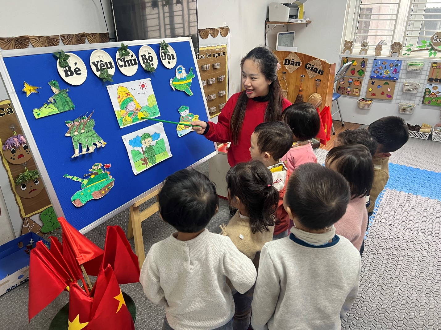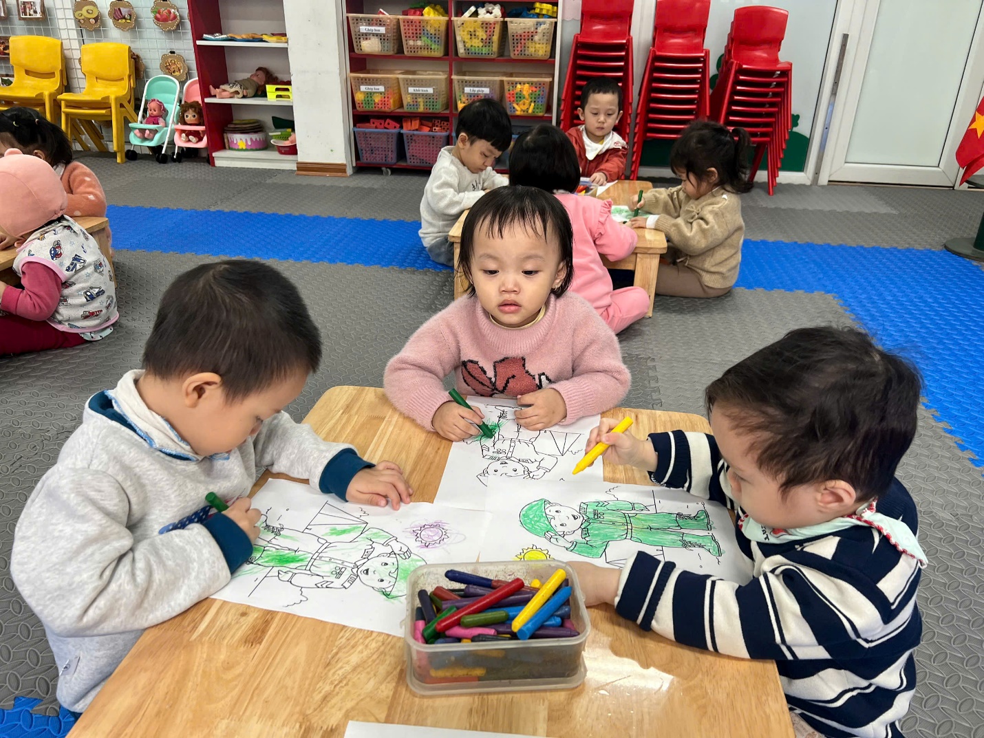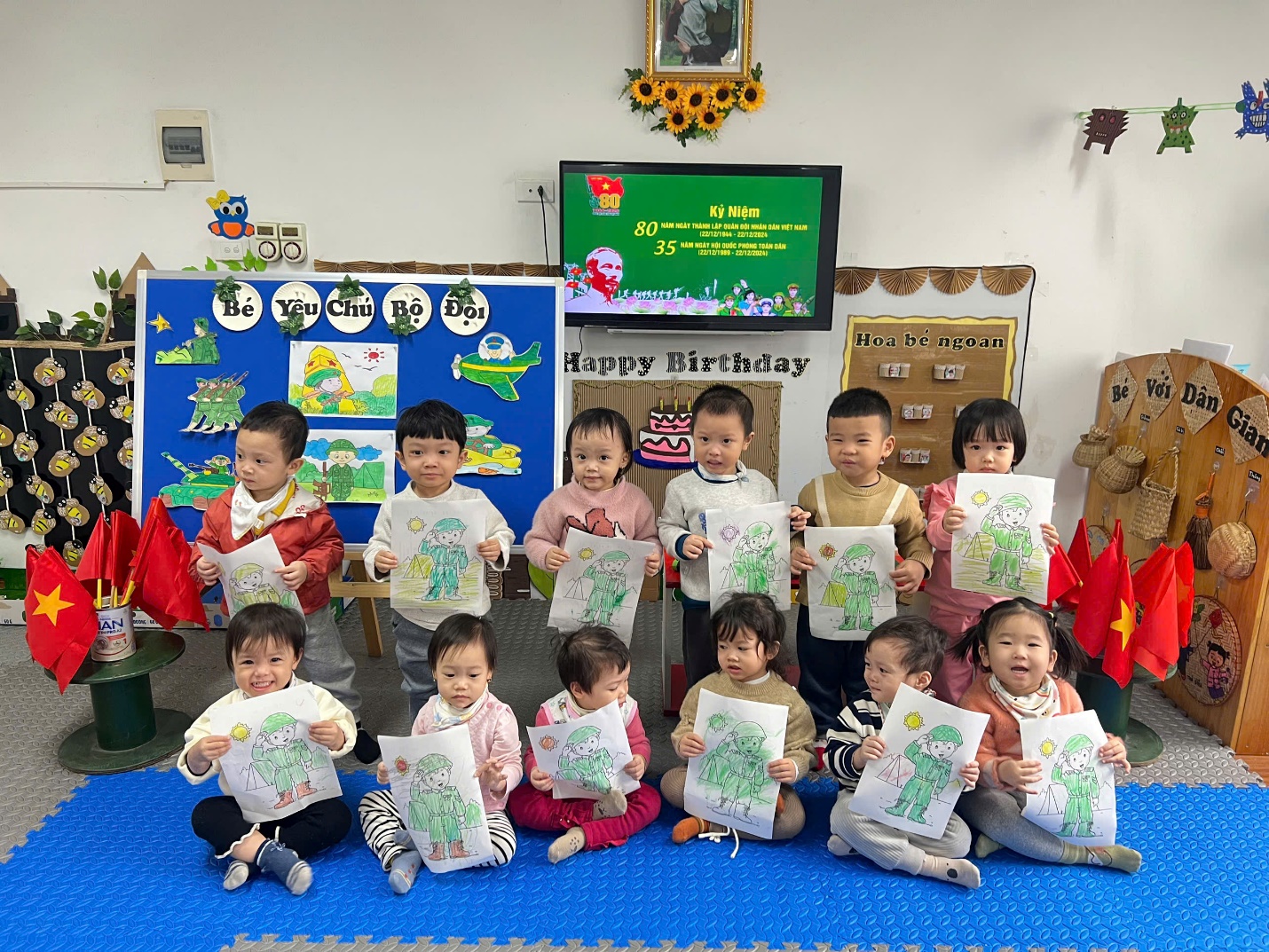 Dưới đây là một số hình ảnh của các bạn nhỏ lớp nhà trẻ D2 sáng tạo tranh về chú bộ đội: