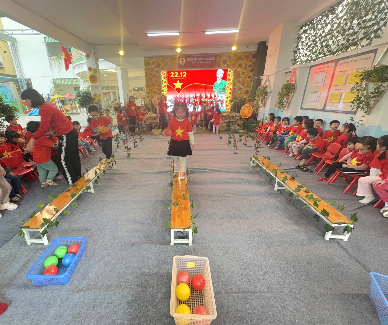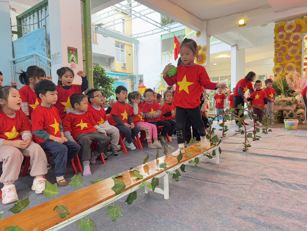 Các bé được chia thành từng đội nhỏ, mặc trang phục áo cờ đỏ sao vàng cùng nhau vượt qua các thử thách đầy thú vị. Thử thách được thiết kế phù hợp với lứa tuổi mầm non, giúp trẻ phát triển thể lực, sự nhanh nhẹn và khả năng cân bằng cơ thể.