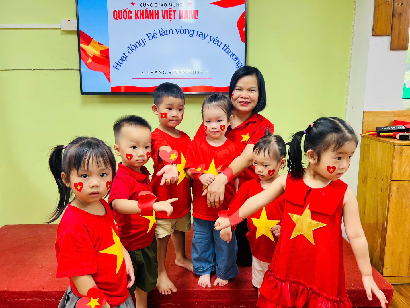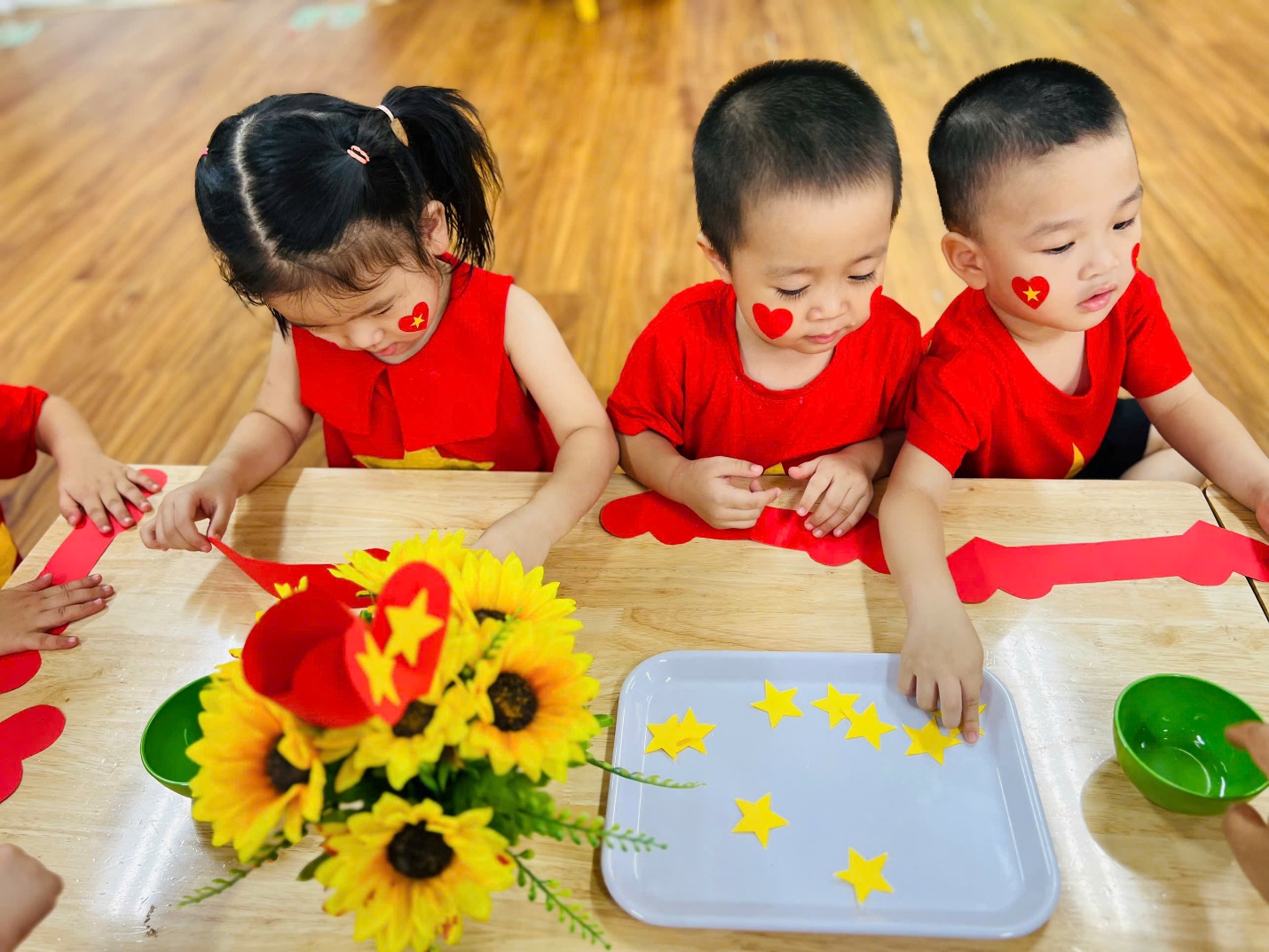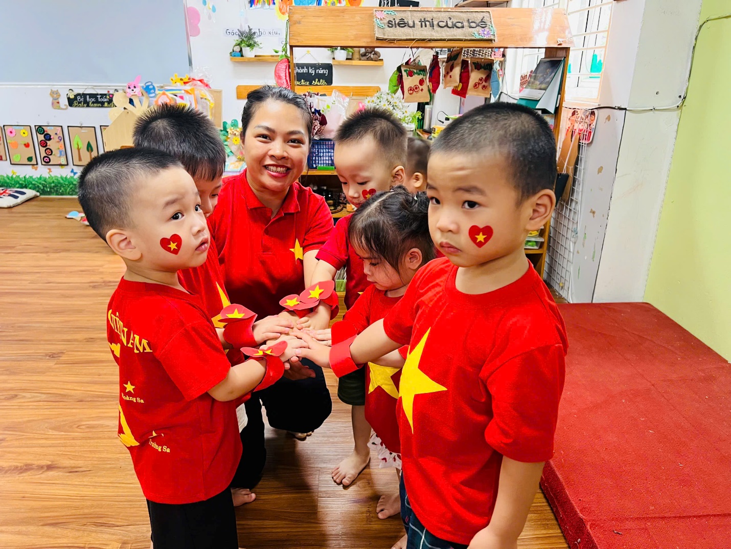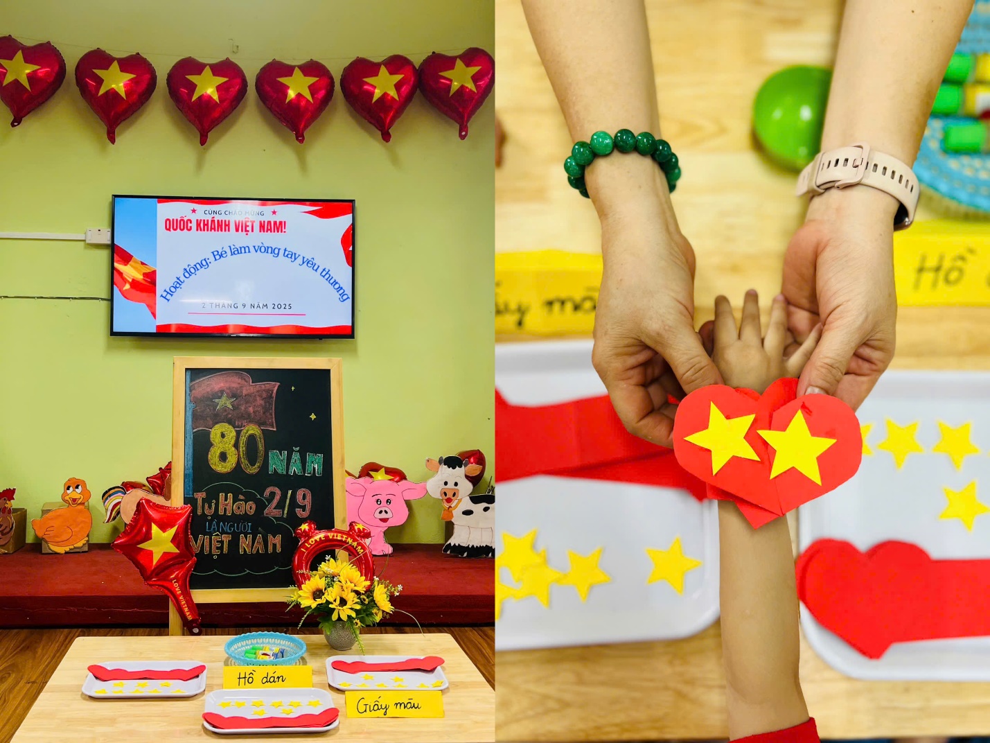 Đặc biệt, các con đã tự tay làm nên những “vòng tay yêu thương” gắn ngôi sao năm cánh vàng rực – biểu tượng của niềm tin, khát vọng và tình yêu Tổ quốc. Những chiếc vòng nhỏ xinh kết nối tình bạn, gắn kết các bé trong vòng tay đoàn kết, cùng nhau hướng về một ngày lễ trọng đại của dân tộc.