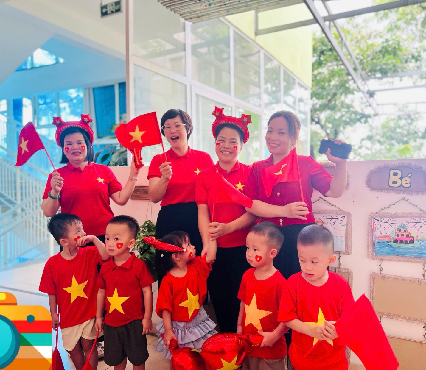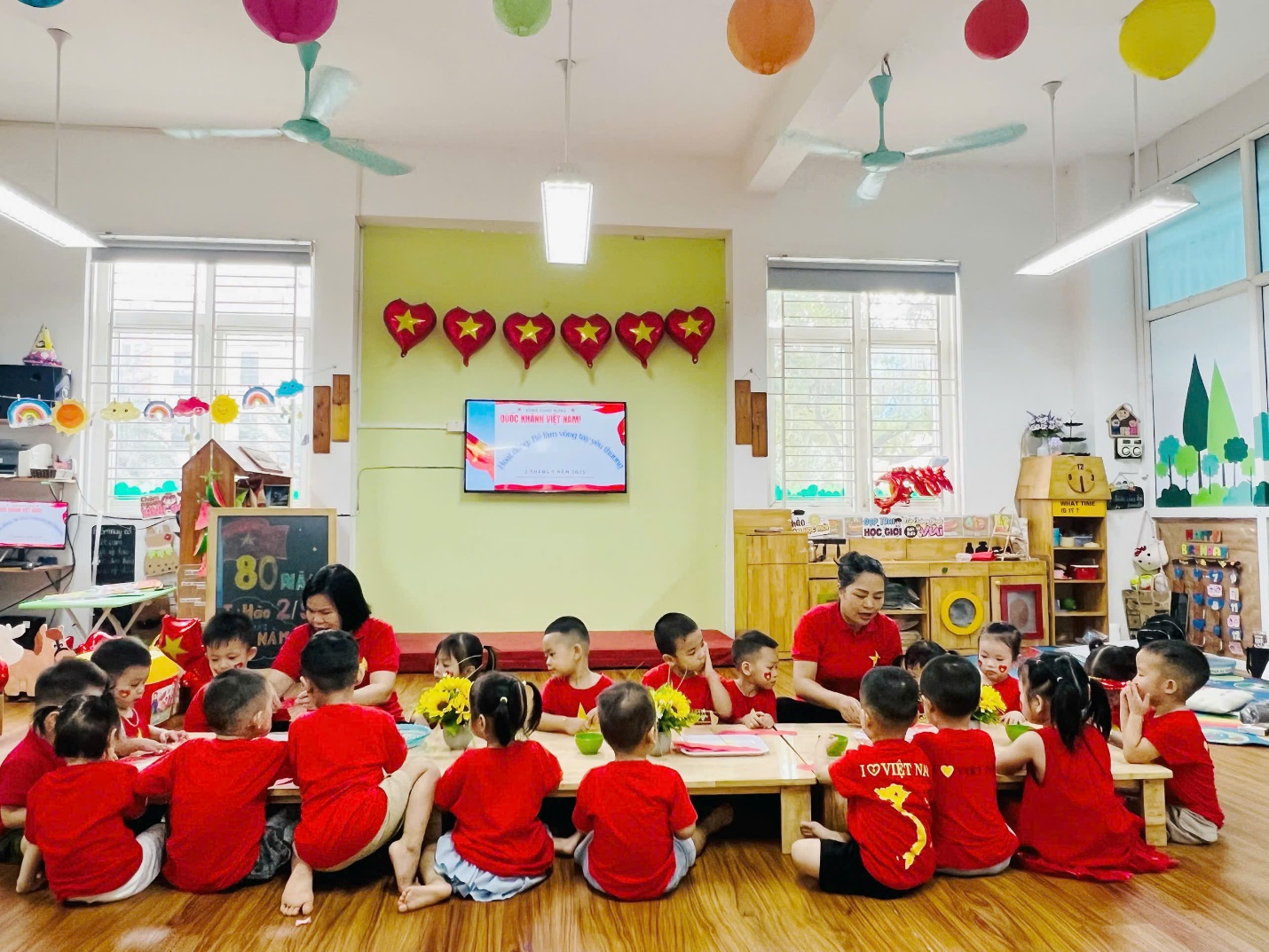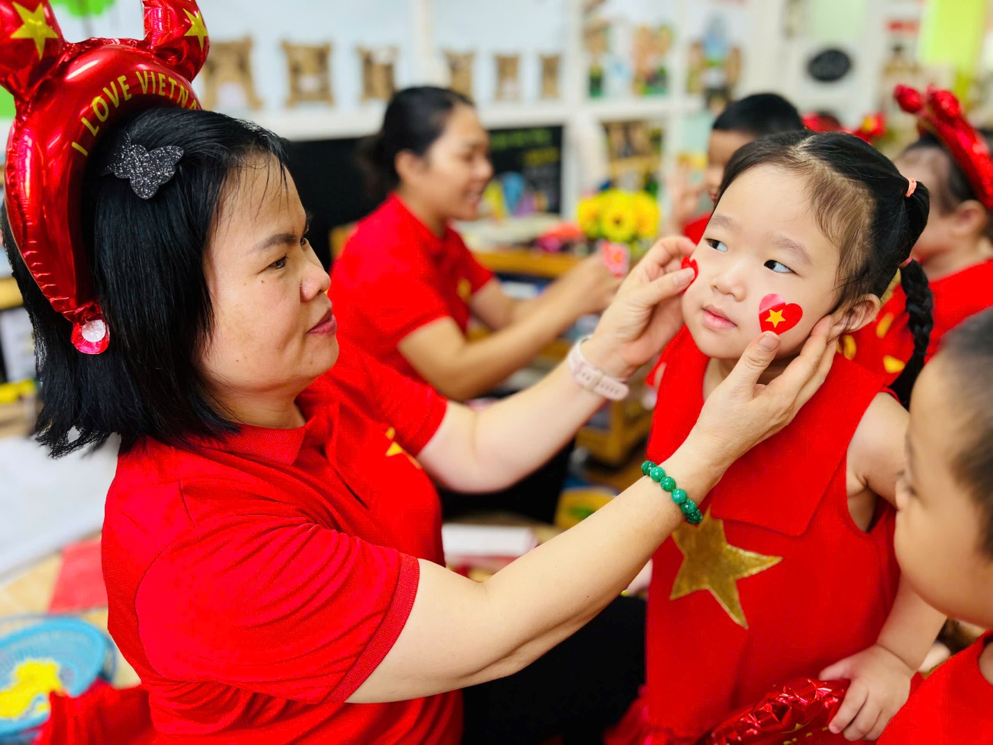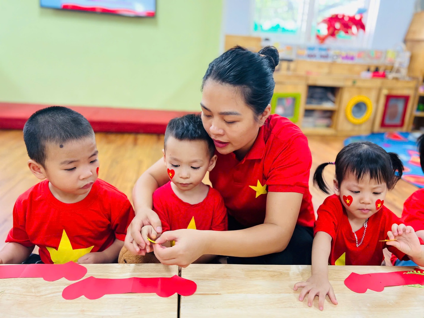 Đặc biệt, các con đã tự tay làm nên những “vòng tay yêu thương” gắn ngôi sao năm cánh vàng rực – biểu tượng của niềm tin, khát vọng và tình yêu Tổ quốc. Những chiếc vòng nhỏ xinh kết nối tình bạn, gắn kết các bé trong vòng tay đoàn kết, cùng nhau hướng về một ngày lễ trọng đại của dân tộc.
