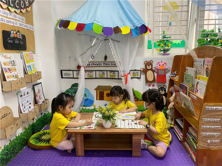 Dưới sự hướng dẫn của các cô giáo, các bé được lật mở từng trang truyện cổ tích, truyện tranh dễ hiểu và sinh động. Qua hoạt động này, trẻ học cách lắng nghe, tưởng tượng và bước đầu cảm nhận được vẻ đẹp của ngôn ngữ, nội dung sách.