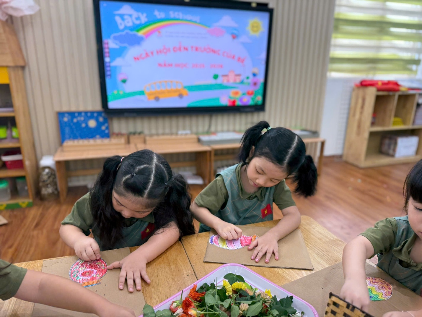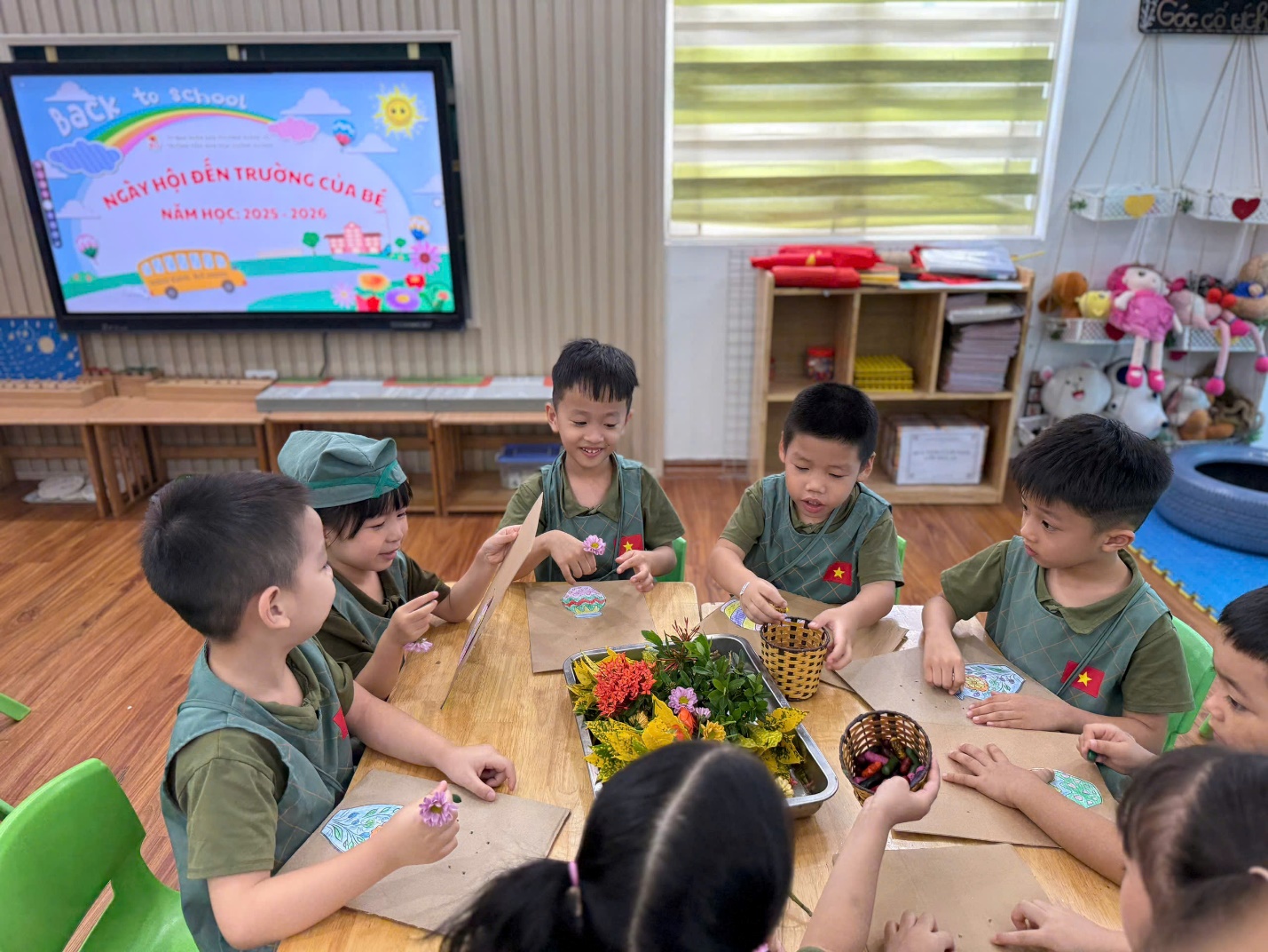 Buổi chiều, các bạn nhỏ lớp A2 đã vô cùng hào hứng khi được tự tay cắt, tô màu và chọn những bông hoa xinh xắn. Bạn thì chọn hoa hồng, bạn khác lại chọn ra những bông hoa cúc daisy nhiều màu. Dưới sự hướng dẫn của cô, các bé cẩn thận gắn từng bông hoa lên sản phẩm của mình. Ngày đầu năm học mới 2025 – 2026 đã thực sự trở thành “Ngày hội đến trường” ấn tượng của các bé.