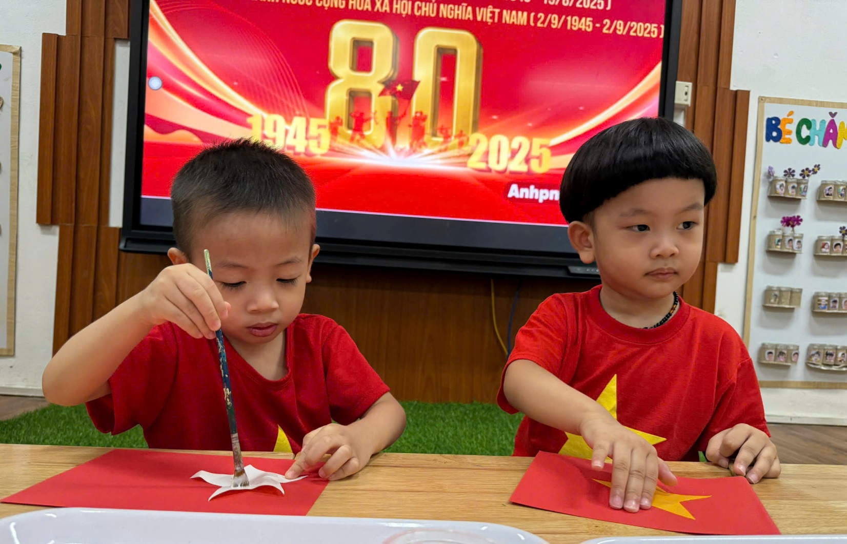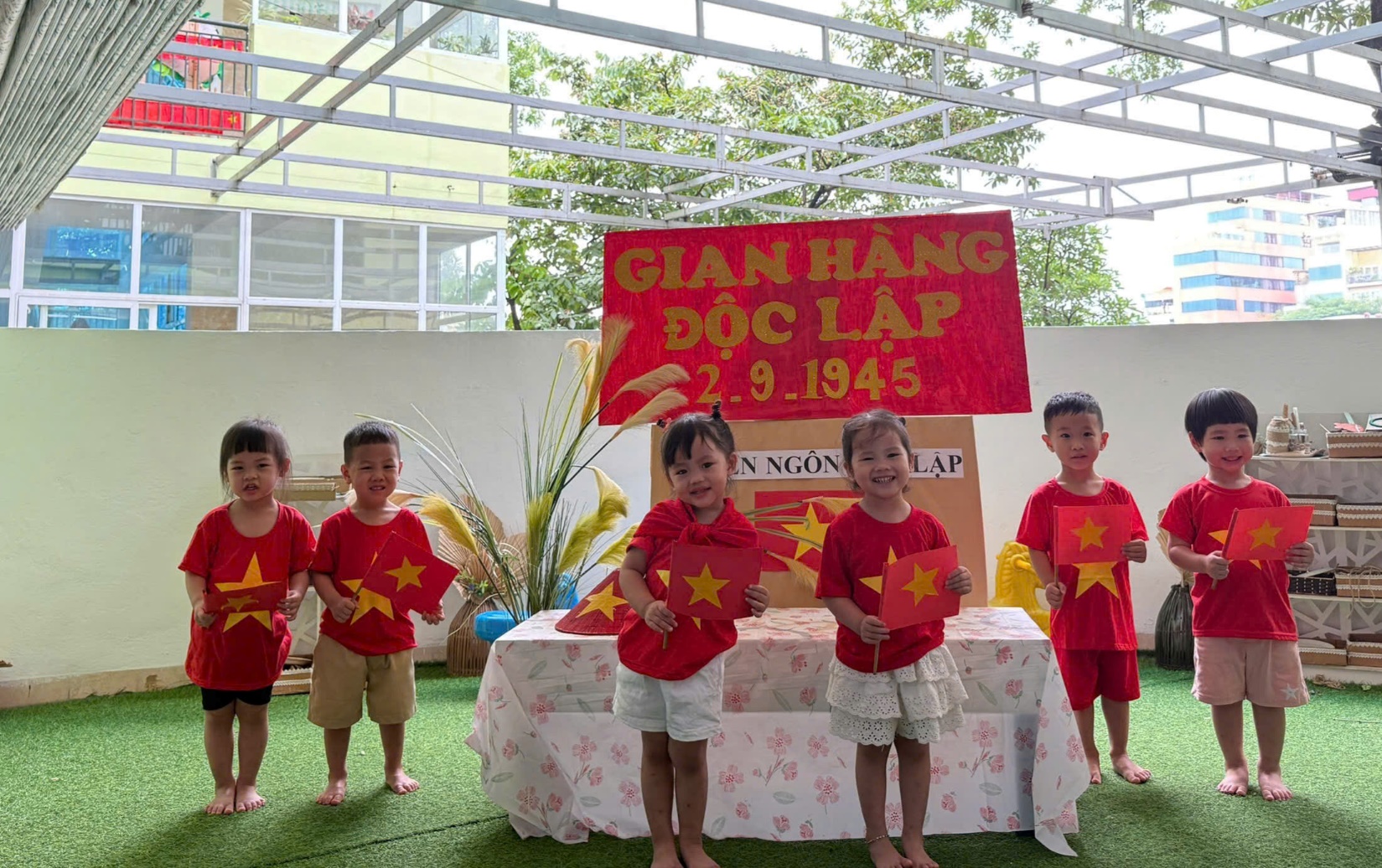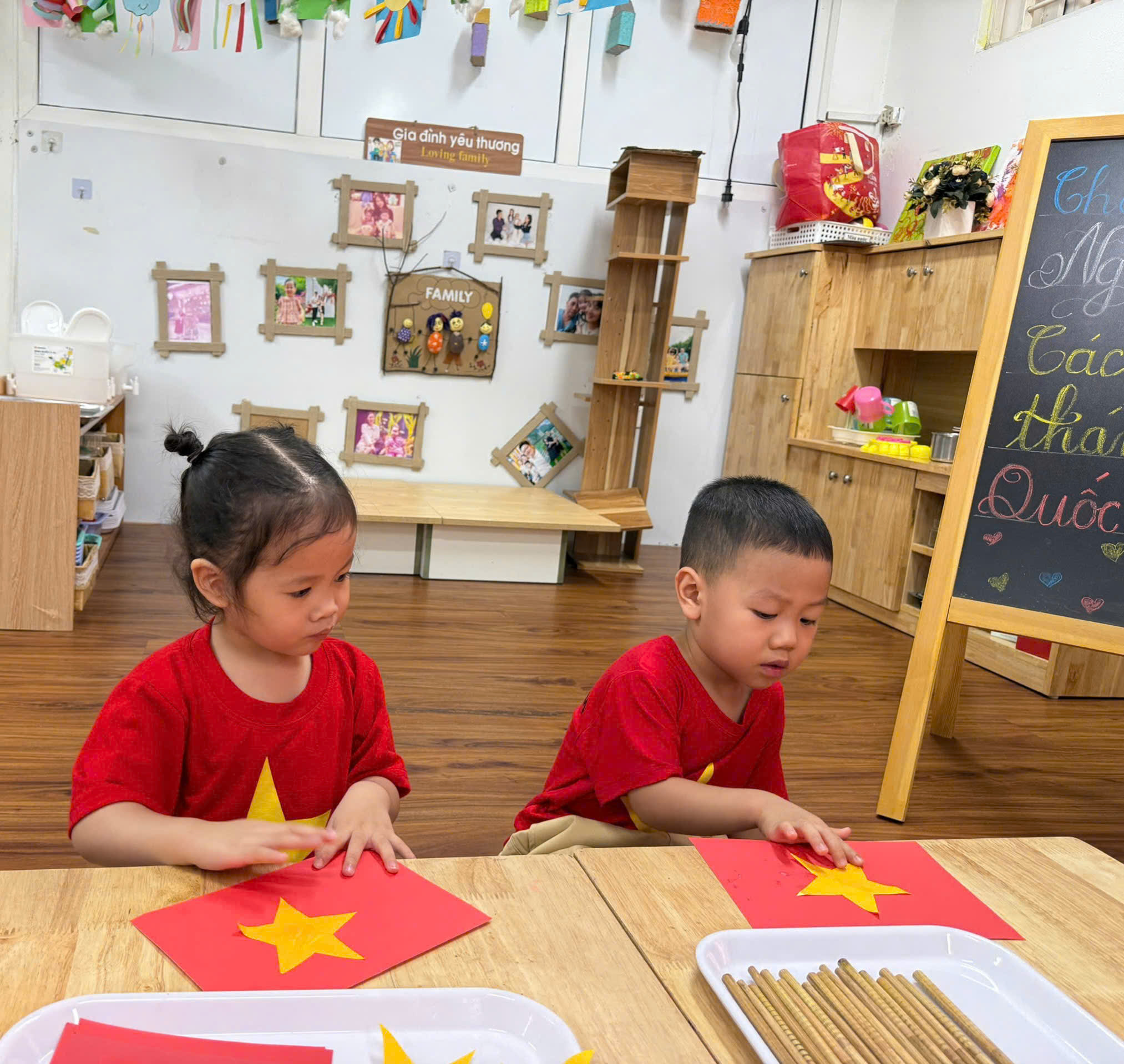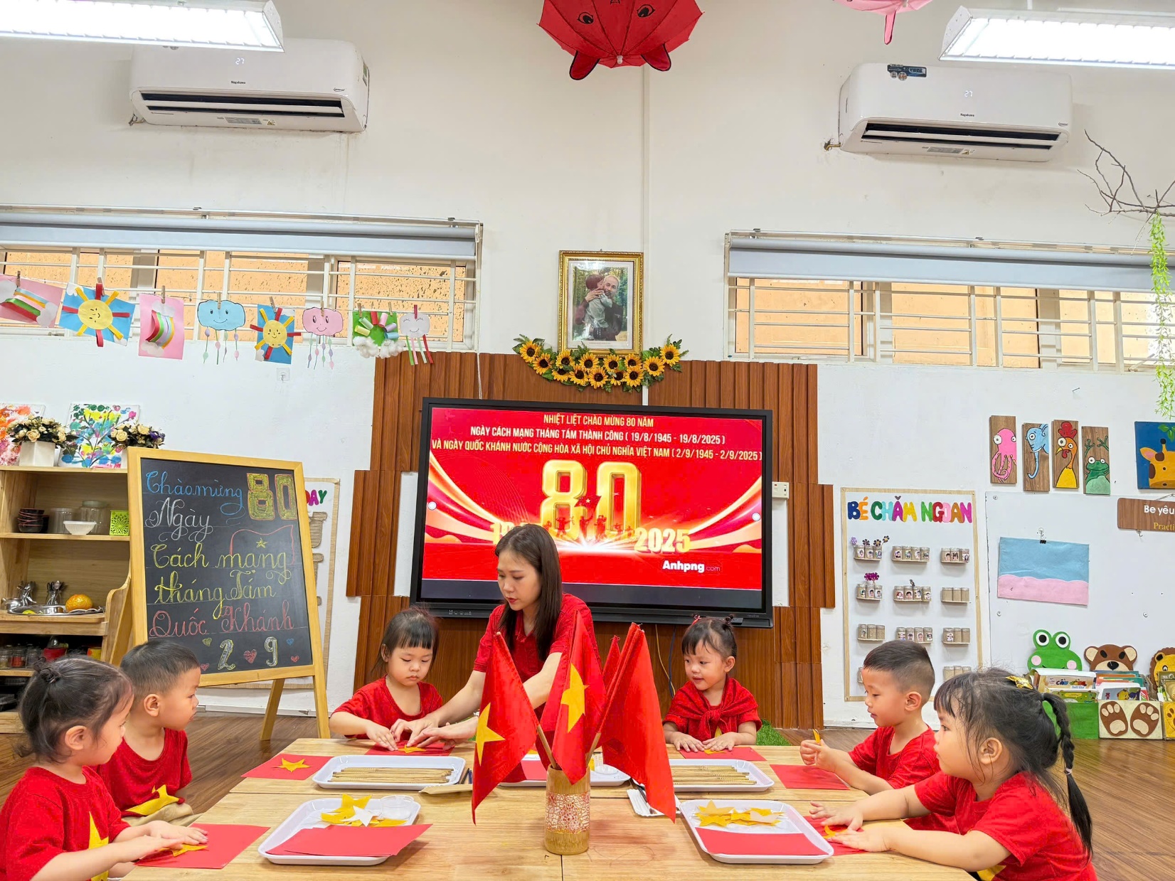 Để chuẩn bị cho ngày lễ trọng đại của dân tộc, cô giáo đã hướng dẫn các bé lớp C3 thực hiện hoạt động "Lan tỏa niềm tự hào lá cờ Tổ quốc". Với những nguyên vật liệu đơn giản như giấy màu và hồ dán, các con đã được tự tay cắt, dán và hoàn thành tác phẩm của mình. Từng ánh mắt tập trung, từng thao tác cẩn thận của các bé khi cắt ngôi sao vàng hay phết keo dán lên nền cờ đỏ cho thấy sự háo hức và nghiêm túc của các con khi tham gia hoạt động..