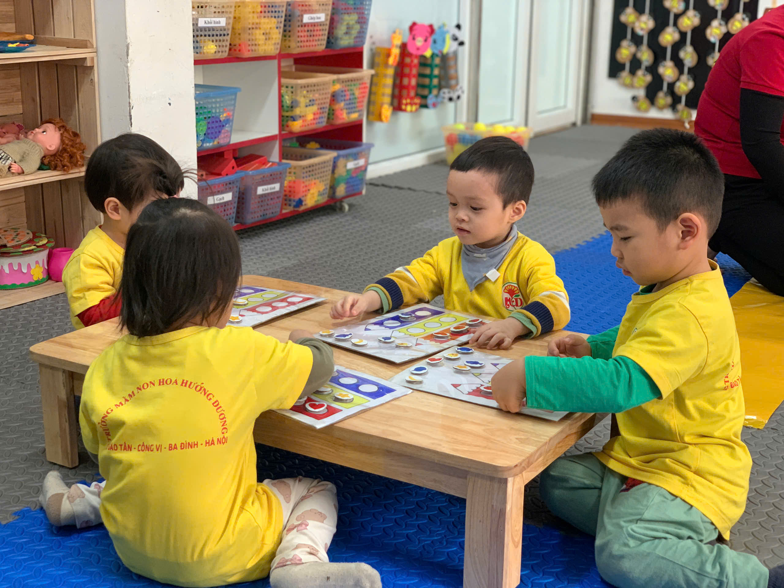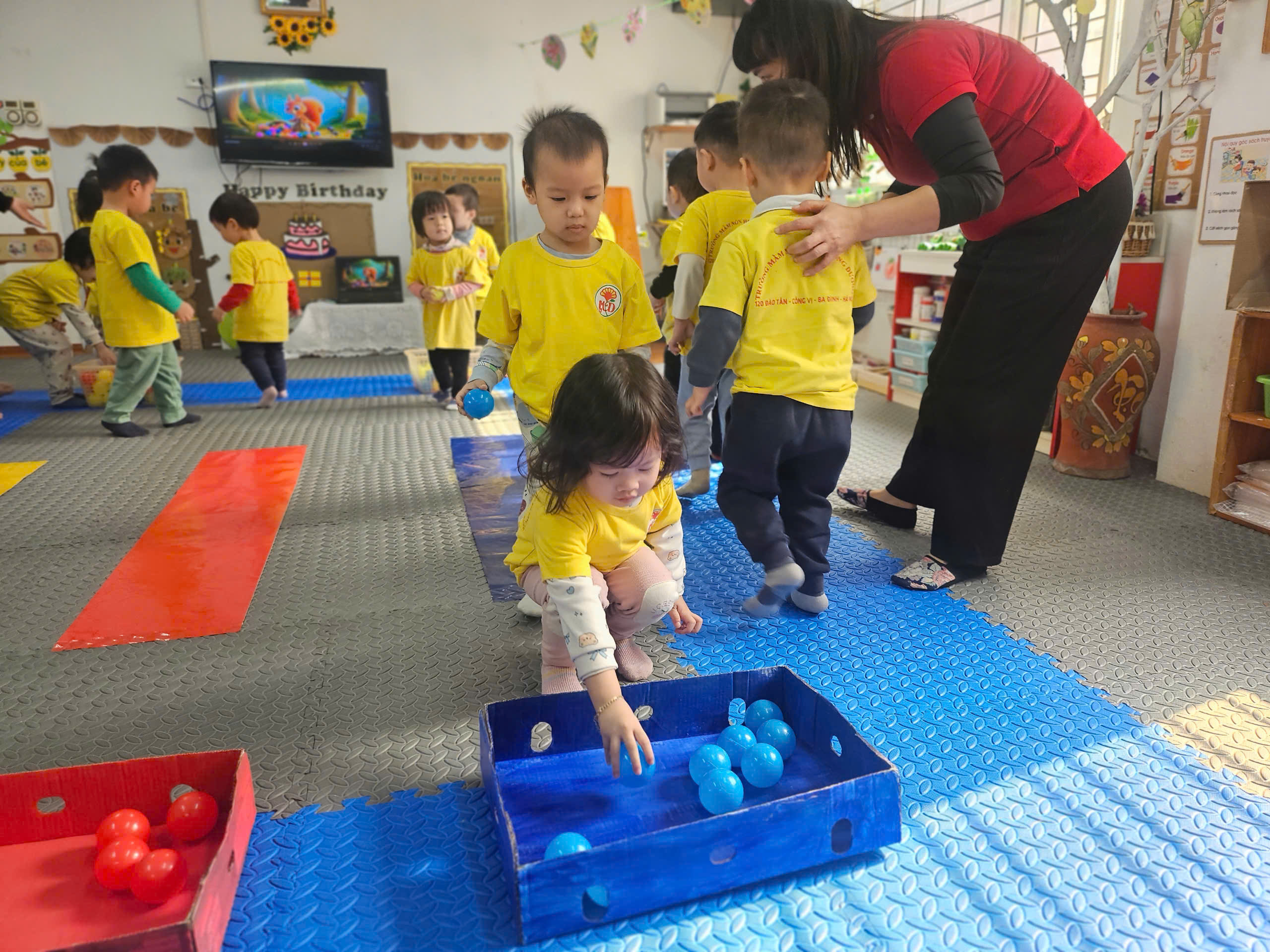 Các bé được khám phá những quả bóng có ba màu xanh, đỏ, vàng và thả chúng vào đúng rổ màu tương ứng.