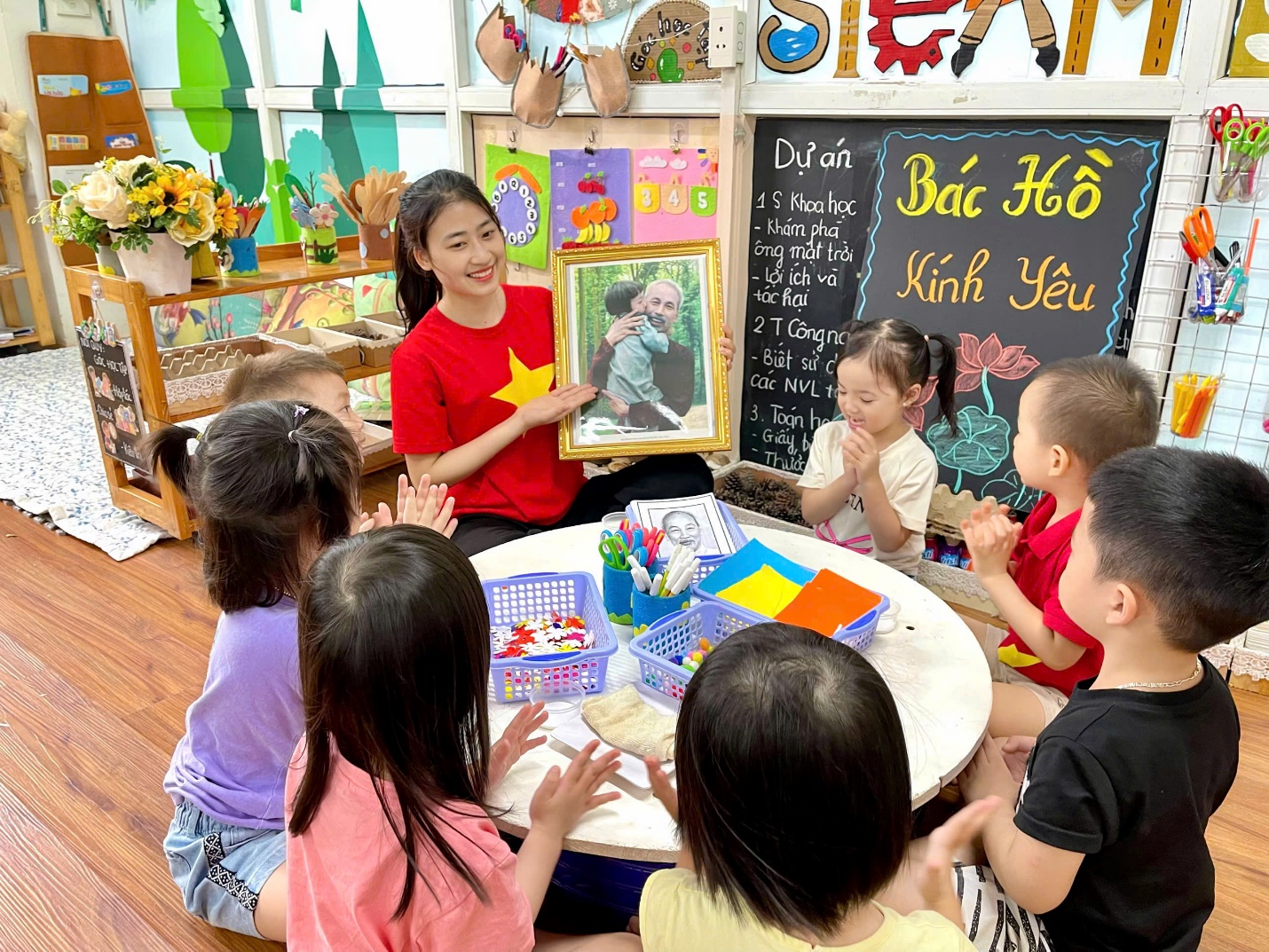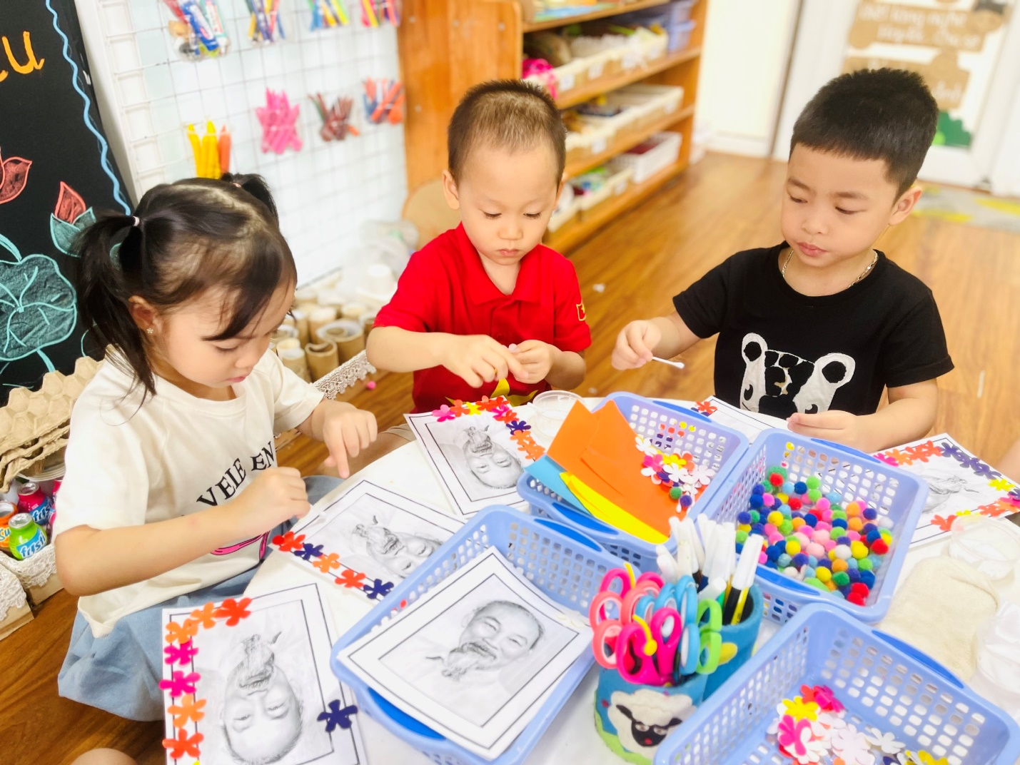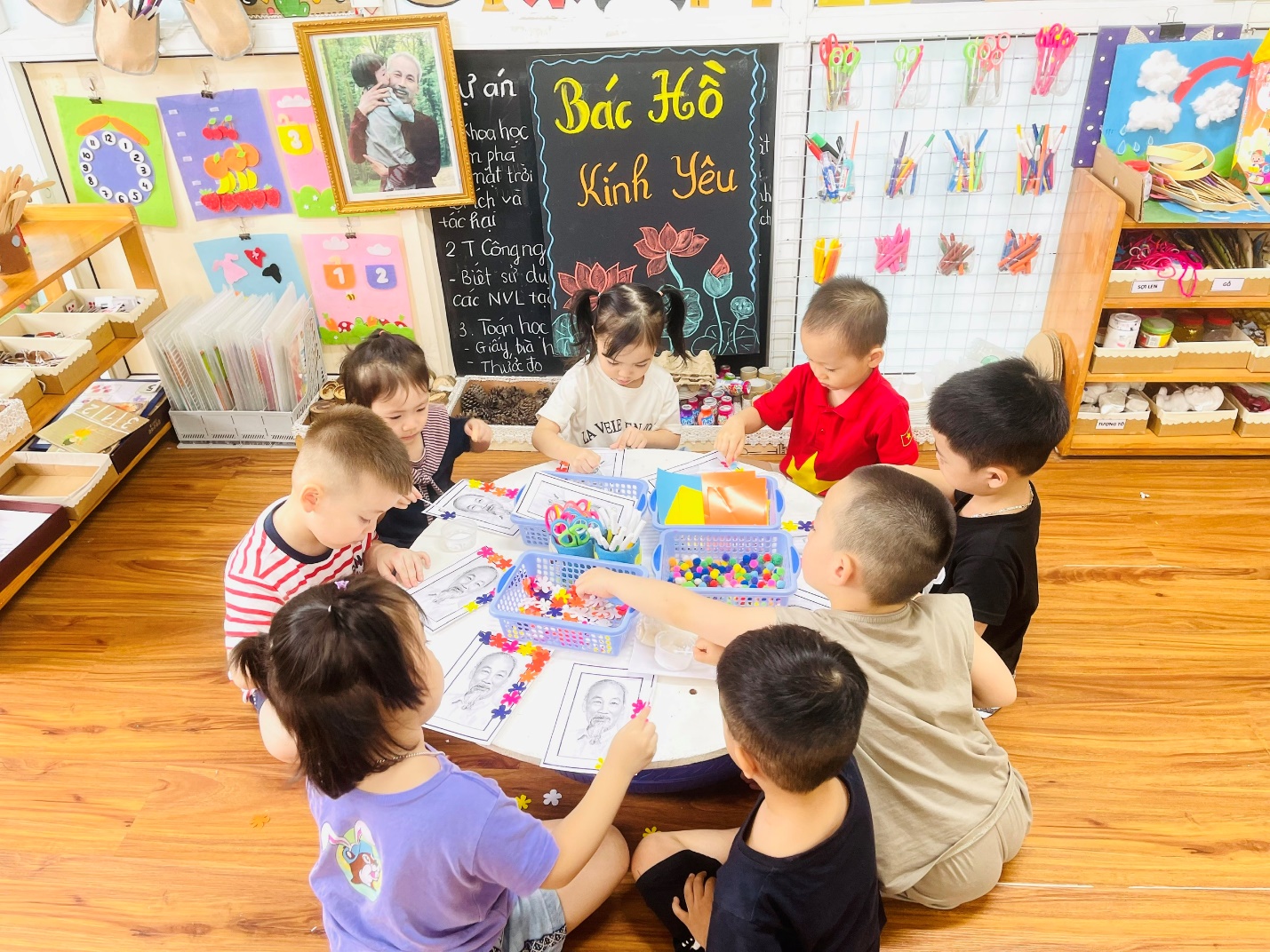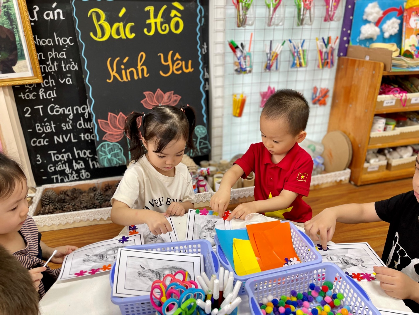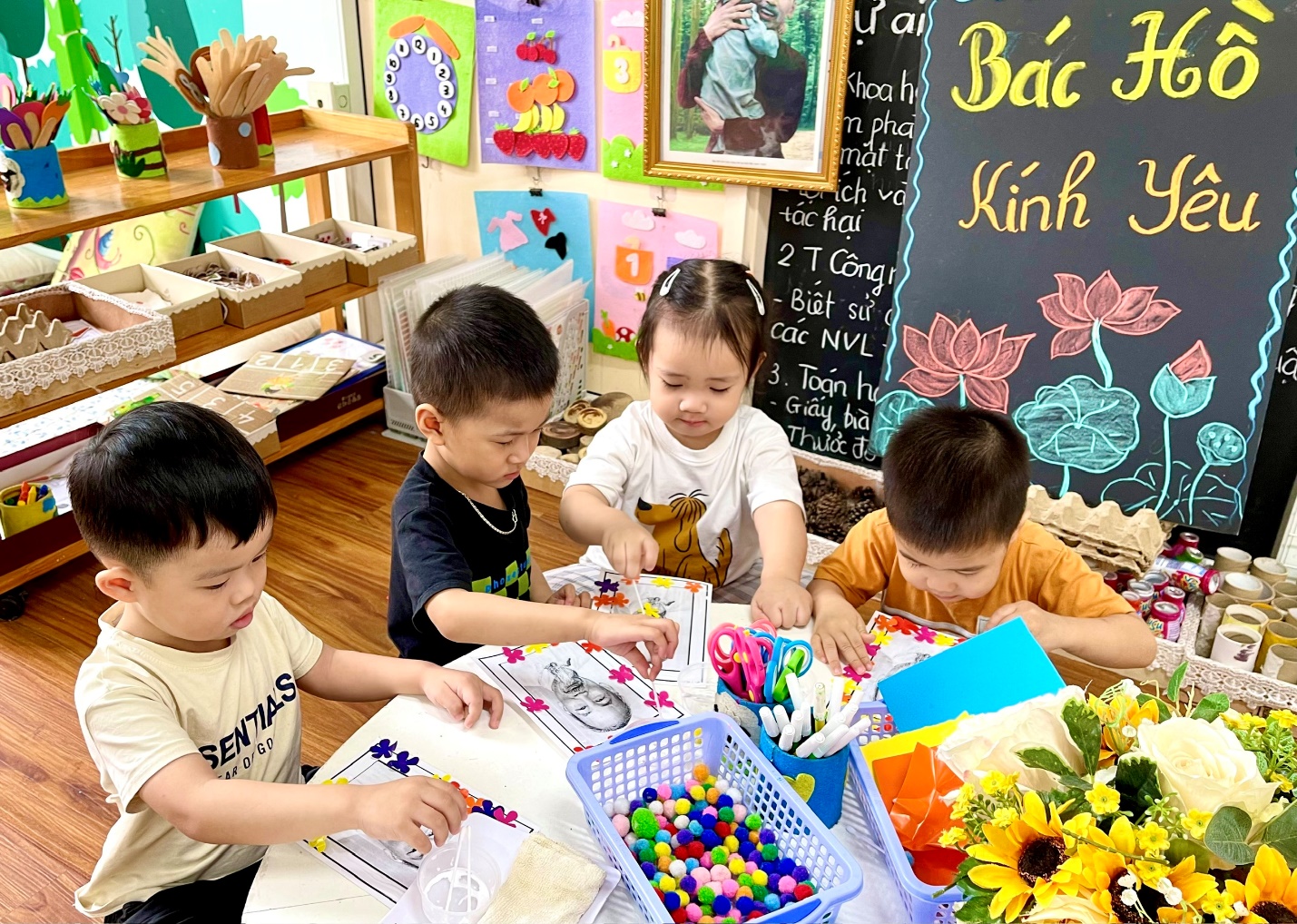 Dưới sự hướng dẫn tận tình của cô giáo, các bé đã tỉ mỉ dùng hồ dán, giấy màu, hoa vải, quả bông… để trang trí khung ảnh Bác. Dù còn nhỏ tuổi, nhưng trong từng ánh mắt chăm chú, từng đôi tay bé xinh đang dán từng chi tiết, ta có thể cảm nhận được sự háo hức, sự trân trọng và tình cảm chân thành mà các bé gửi gắm.