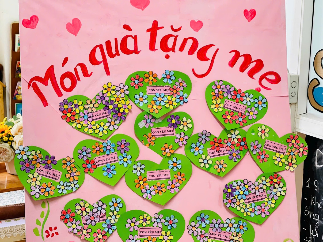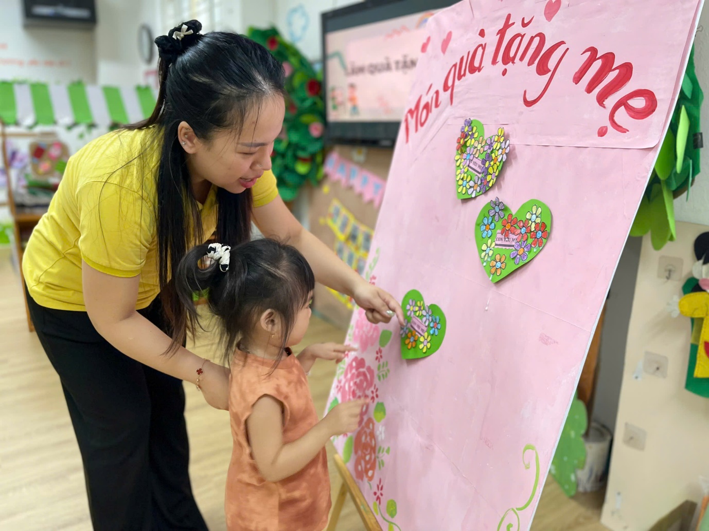 Sau khi lắng nghe câu chuyện, các con háo hức bước vào hoạt động tạo hình “Bé làm thiệp handmade tặng mẹ”. Những bàn tay nhỏ nhắn thoăn thoắt cắt, dán, phối màu, trang trí hoa lá rực rỡ. Có bé chọn màu hồng cho tấm thiệp, có bé vẽ thêm hình trái tim và nắn nót dòng chữ “Con yêu mẹ nhiều lắm!”. Mỗi sản phẩm là một lời chúc hồn nhiên, giản dị mà sâu sắc.