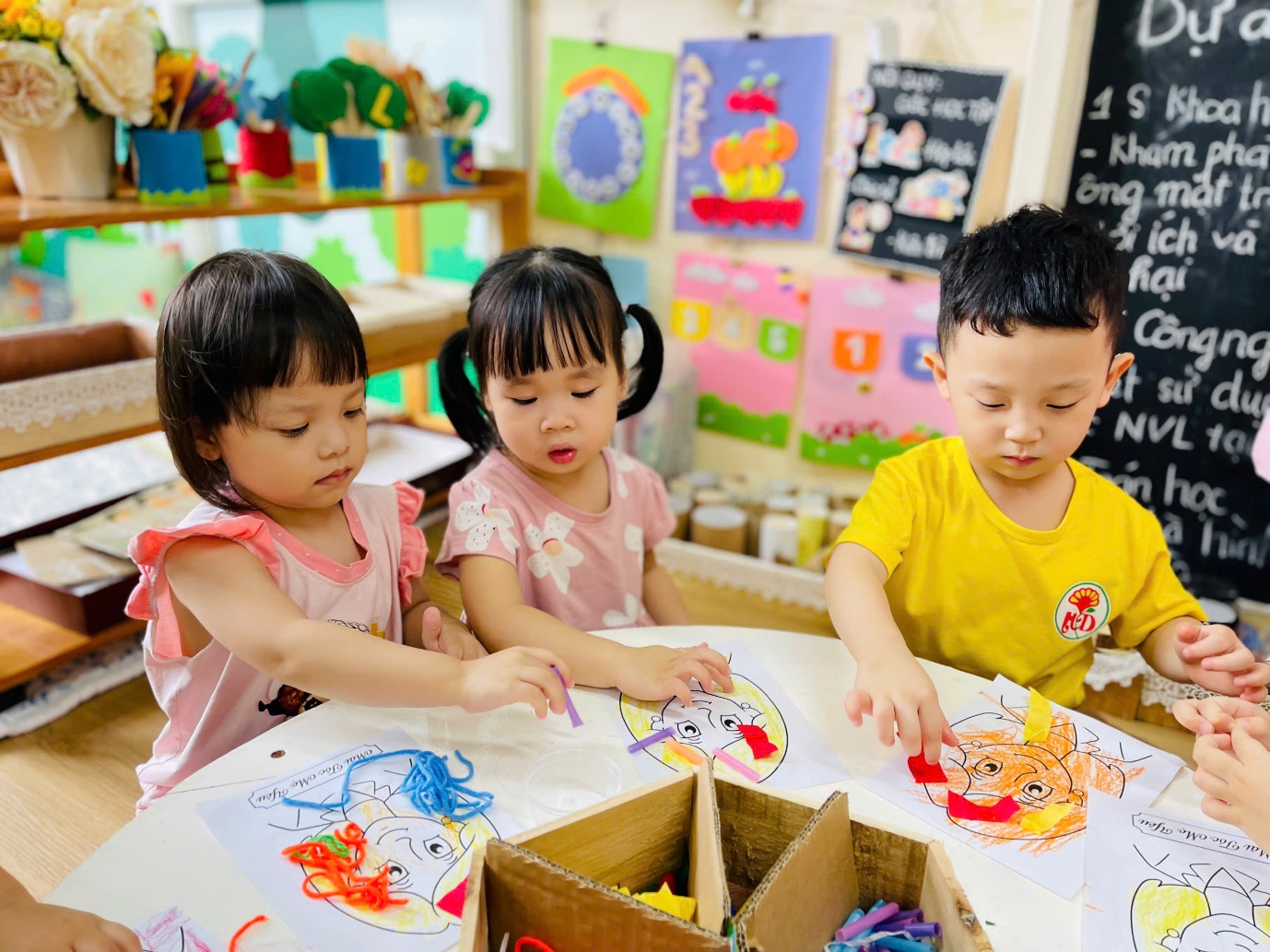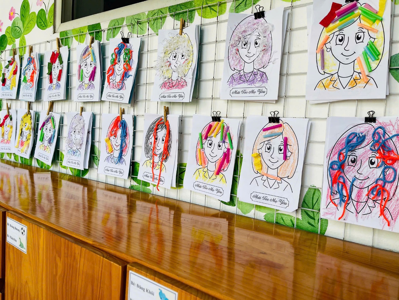 Tiếp nối niềm vui ấy, cô và trò cùng nhau thực hiện hoạt động sáng tạo “Mái tóc mẹ yêu”, sử dụng len sợi, giấy màu, ống hút để tạo nên những bức tranh ngộ nghĩnh và nhiều sắc màu. Những đôi mắt long lanh, những nụ cười hồn nhiên như gửi gắm cả tình yêu bé nhỏ dành cho mẹ và cô.