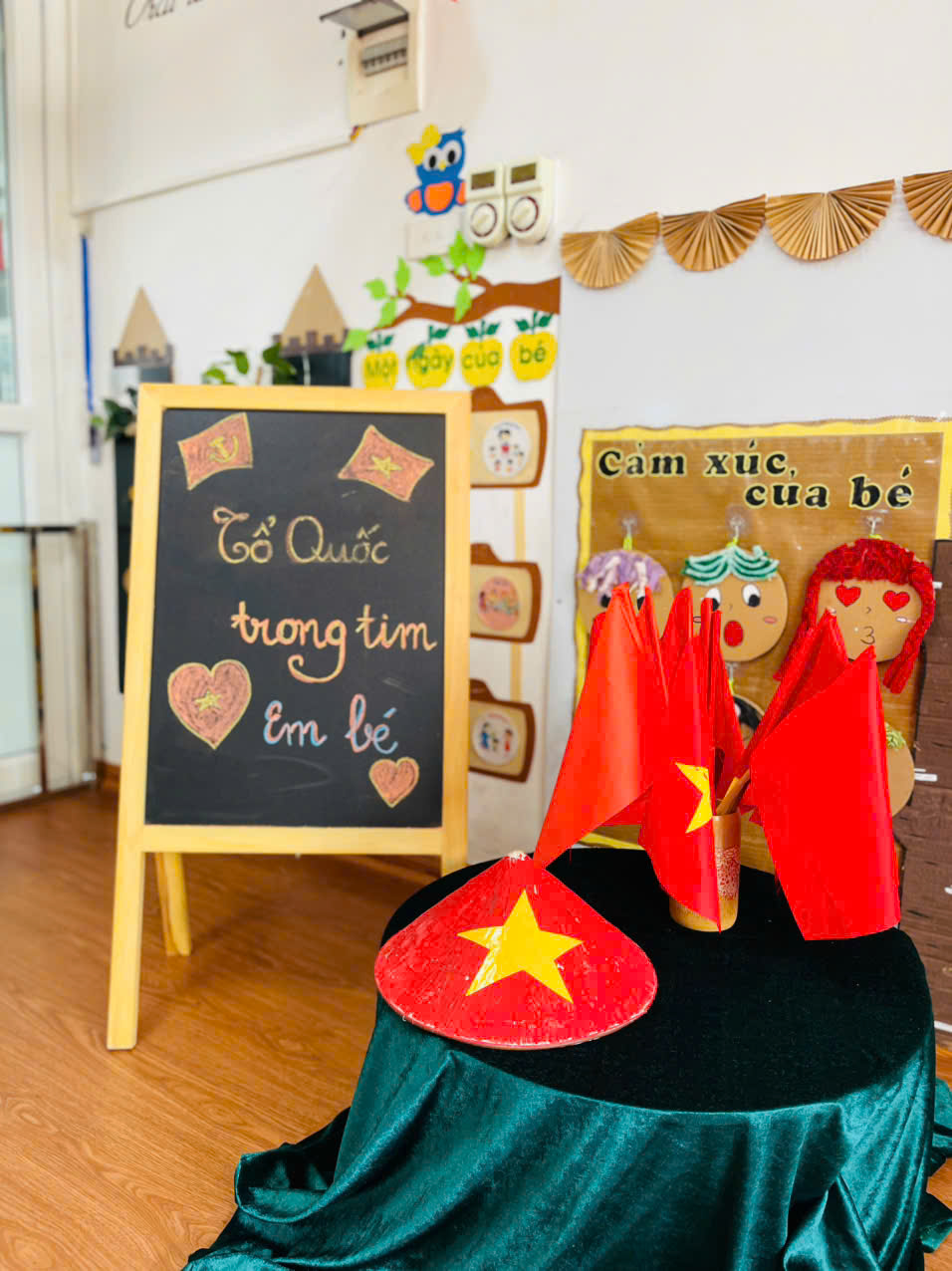 Hoà chung cùng không khí tưng bừng của cả nước hướng về ngày hội non sông, mỗi góc nhỏ của lớp được trang trí cờ hoa tạo nên không khí vừa trang nghiêm vừa gần gũi giúp các con cảm nhận rõ không khí đặc biệt của ngày hội non sông.