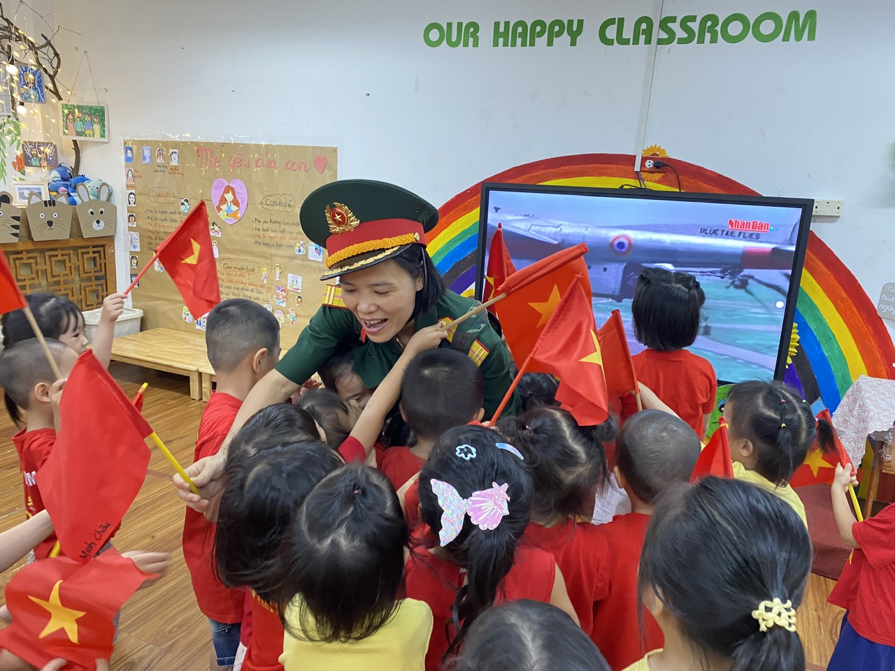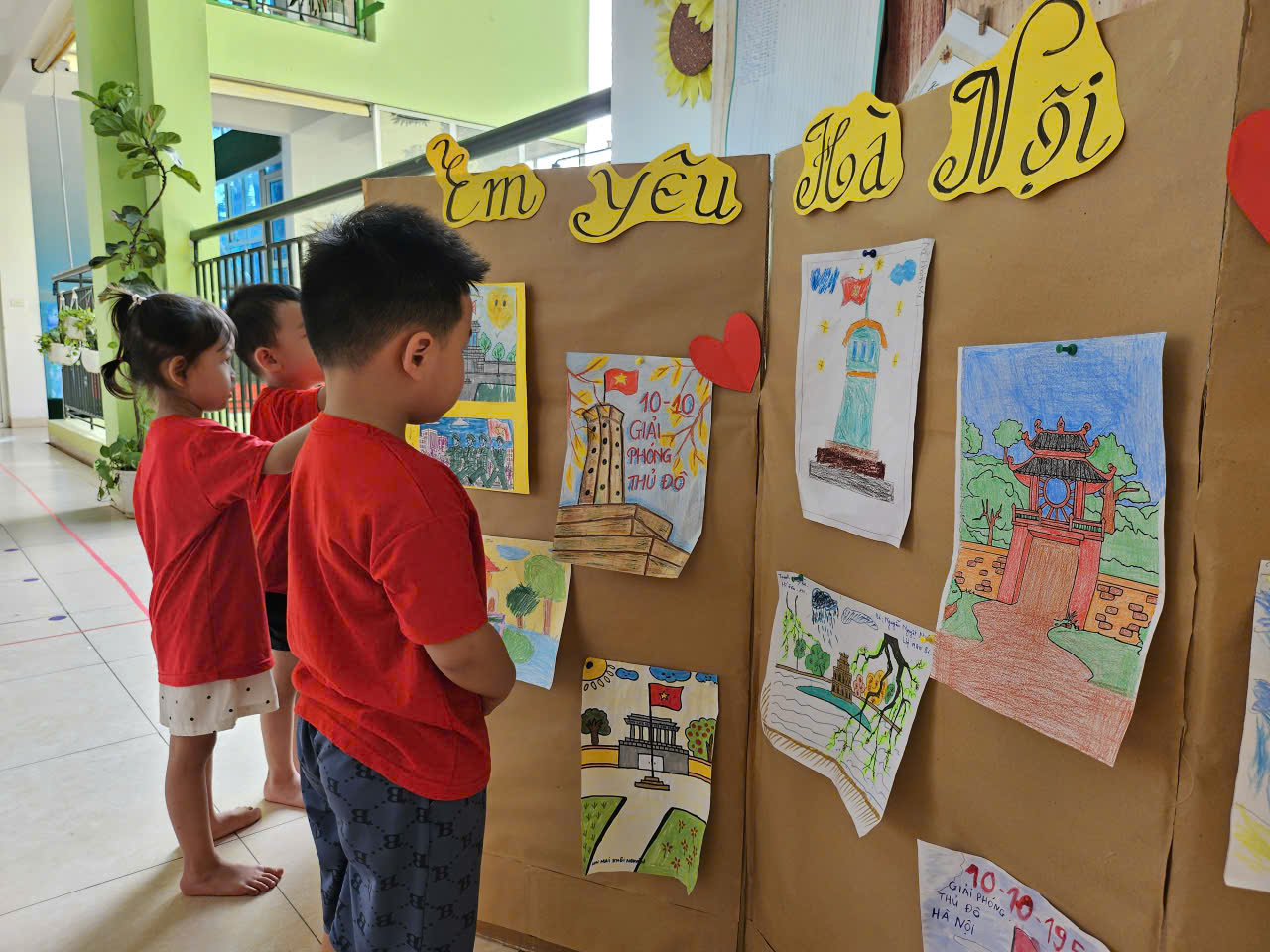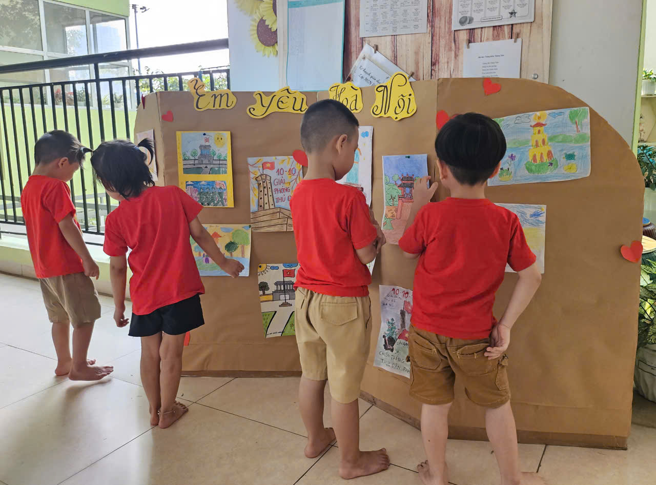 Bằng đôi bàn tay khéo léo và trí tưởng tượng phong phú, các bé cùng cô giáo tạo nên những bức tranh, tờ bích báo đầy sắc màu – với cờ Tổ quốc, hoa, phố cổ, chú bộ đội, em bé Hà Nội.