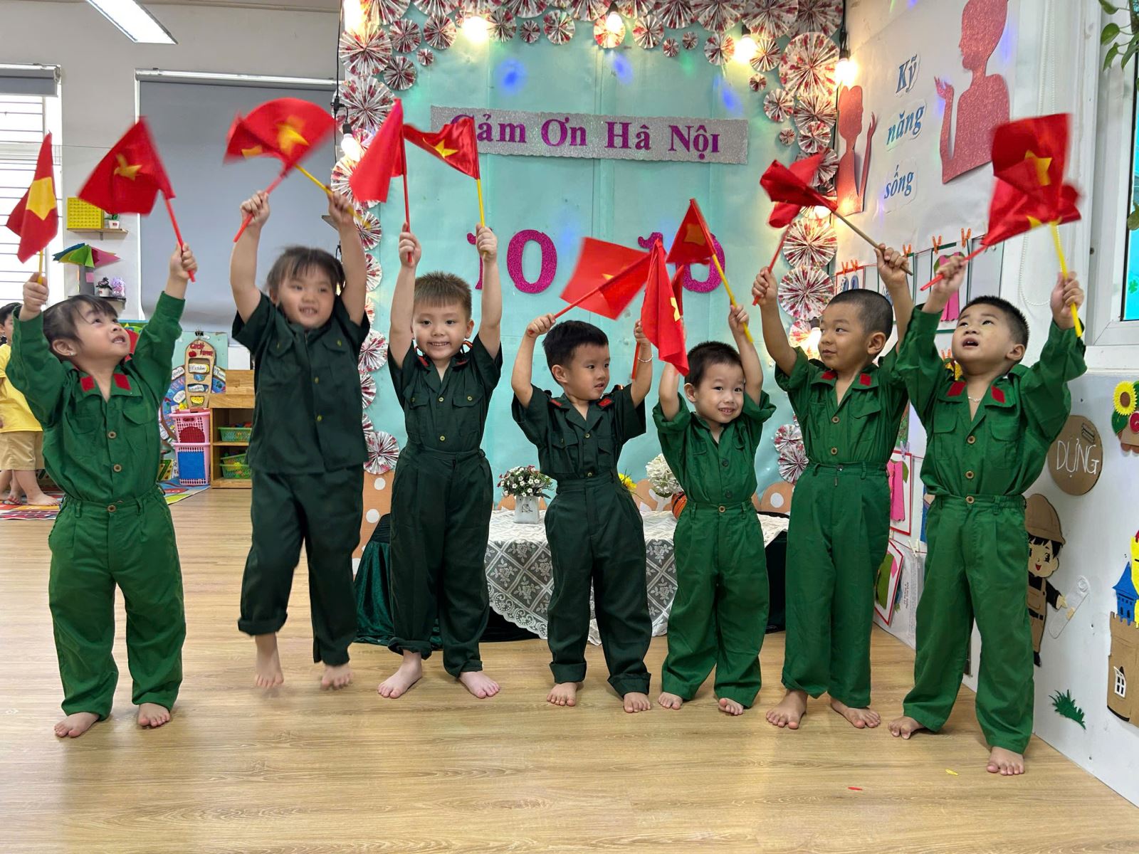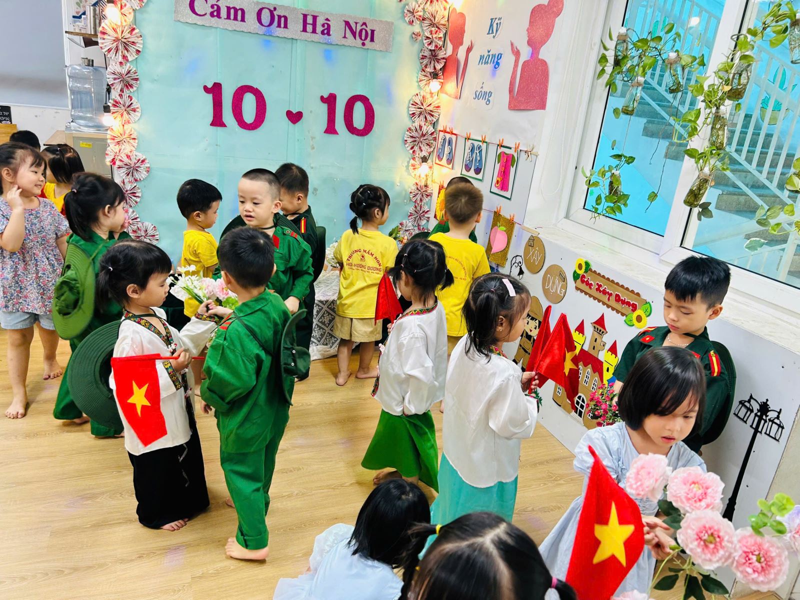 Bằng sự hồn nhiên, tự tin và sáng tạo, các bé hóa thân thành người dân Thủ đô trong ngày vui 10/10 – cờ đỏ sao vàng tung bay rợp trời, tiếng trống, tiếng hát vang khắp phố phường.