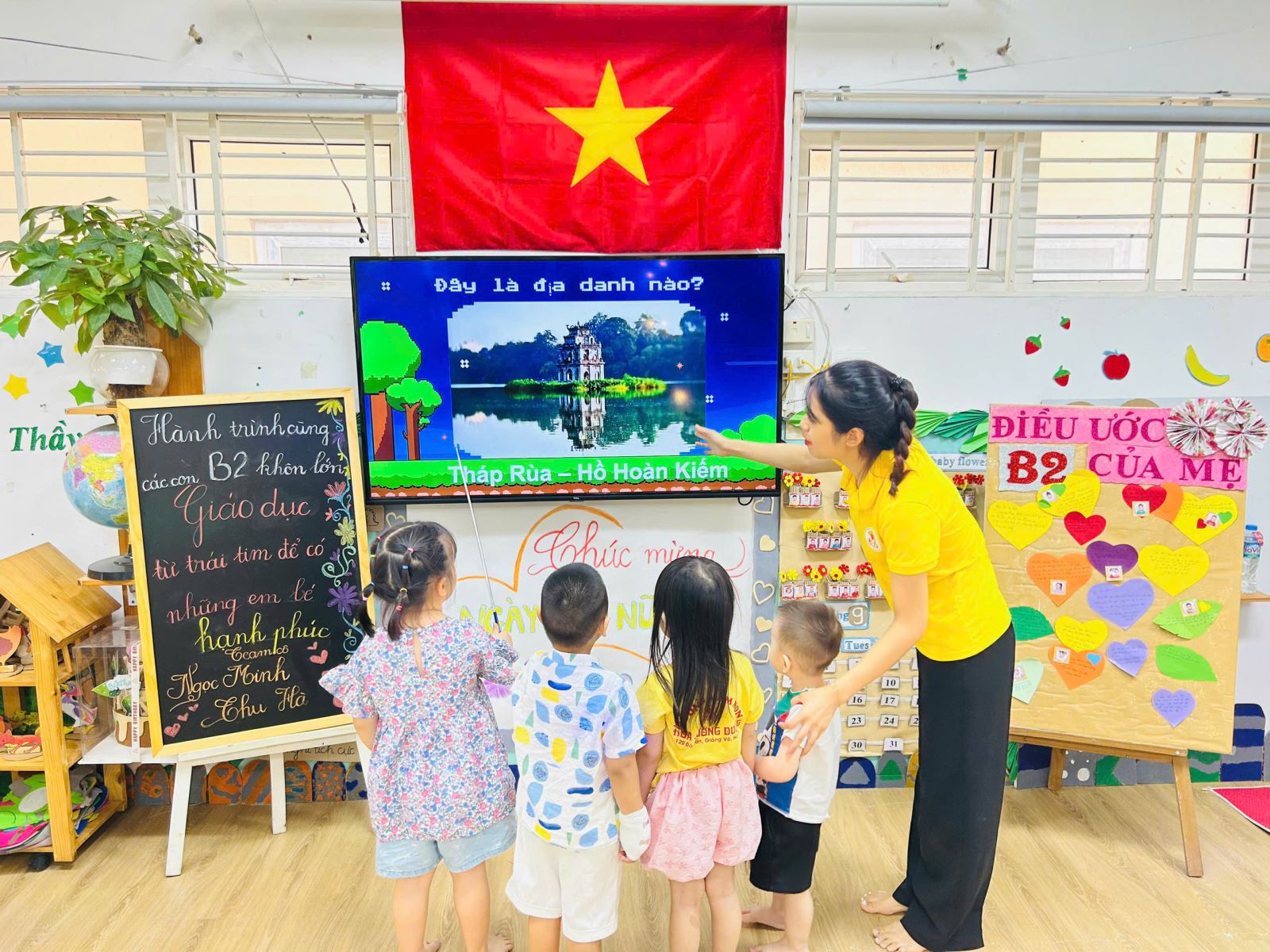 Không chỉ học mà còn chơi thật vui! Qua những hình ảnh gợi mở – Hồ Gươm, Cột cờ Hà Nội, Văn Miếu – Quốc Tử Giám, Cầu Long Biên... – các bé cùng nhau đoán tên địa danh, chia sẻ điều mình biết.