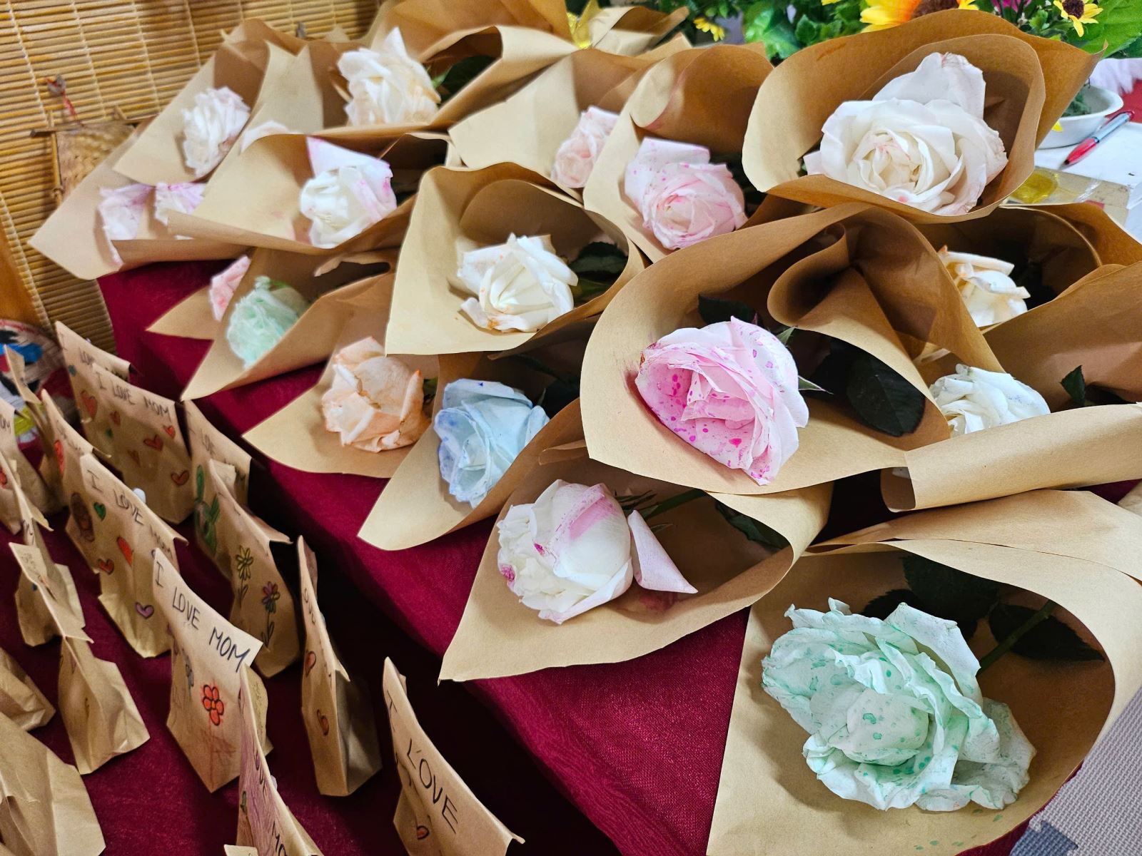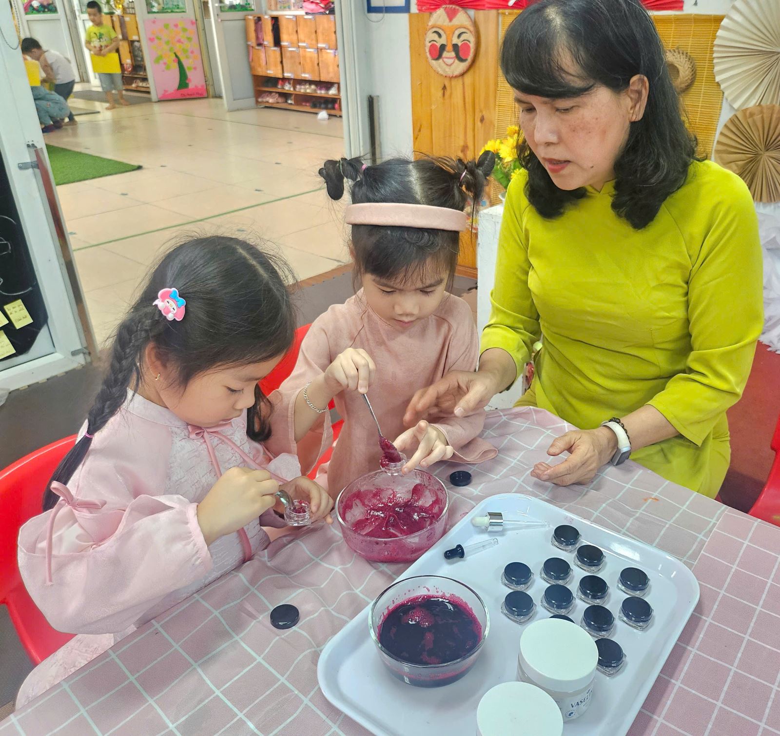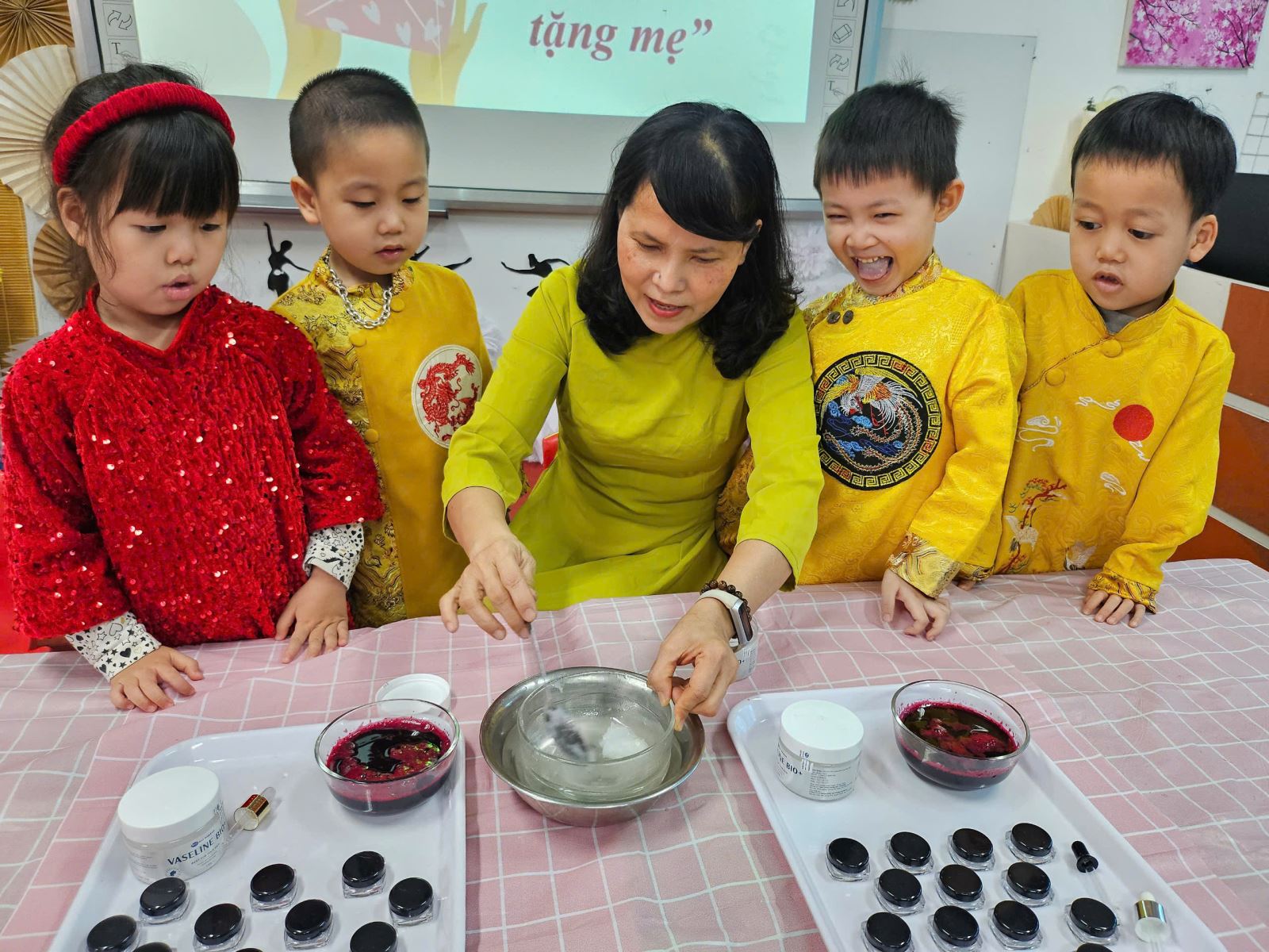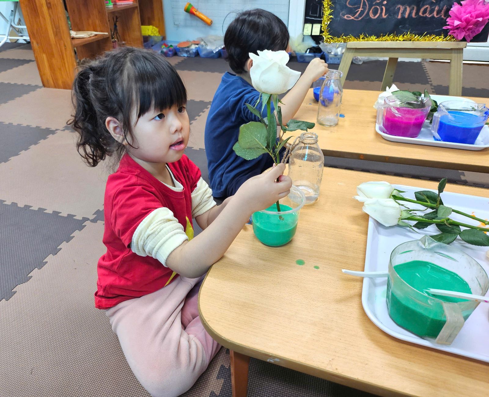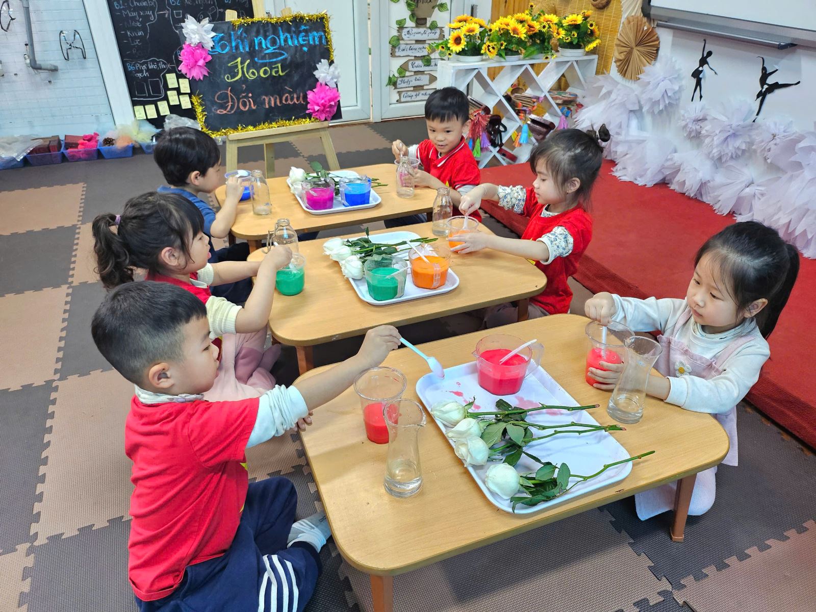Trong từng đôi bàn tay nhỏ nhắn, các bé háo hức khi tự tay pha màu, thực hành thí nghiệm “Hoa đổi màu” để chuẩn bị từng bông hoa trong gói quà của mình. Mỗi sản phẩm không chỉ là một món quà đơn thuần mà còn chứa đựng tất cả sự yêu thương, cố gắng và niềm tự hào của các con dành cho mẹ.