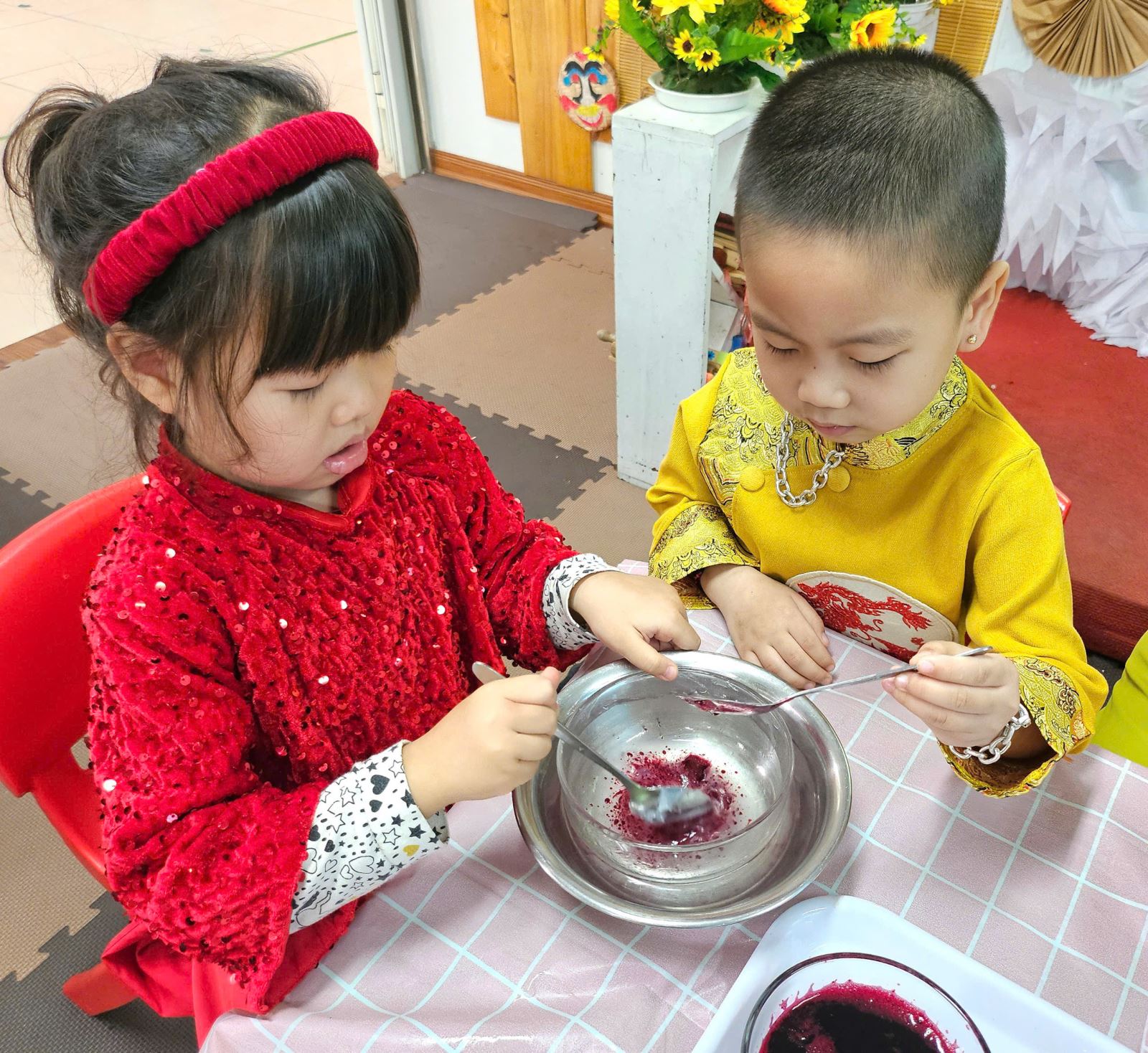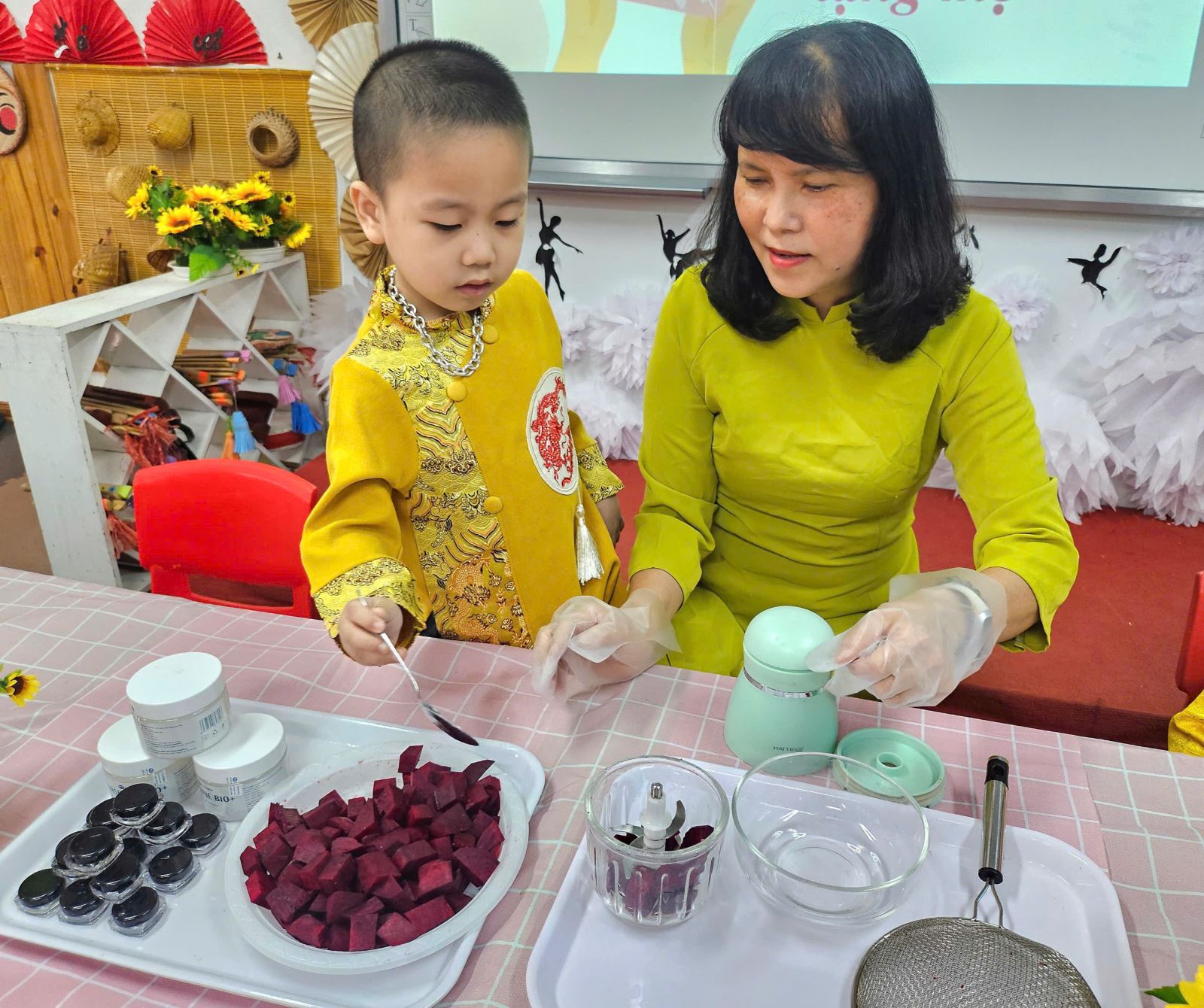 Từ sáng sớm, các con vô cùng háo hức và thích thú khi được quan sát củ dền – một nguyên liệu tự nhiên quen thuộc, nhưng lại có thể tạo ra một món quà đặc biệt. Từ việc khám phá màu sắc, mùi hương của củ dền đến việc cùng cô giáo khuấy trộn hỗn hợp son, mỗi khoảnh khắc đều mang lại niềm vui và sự tò mò.