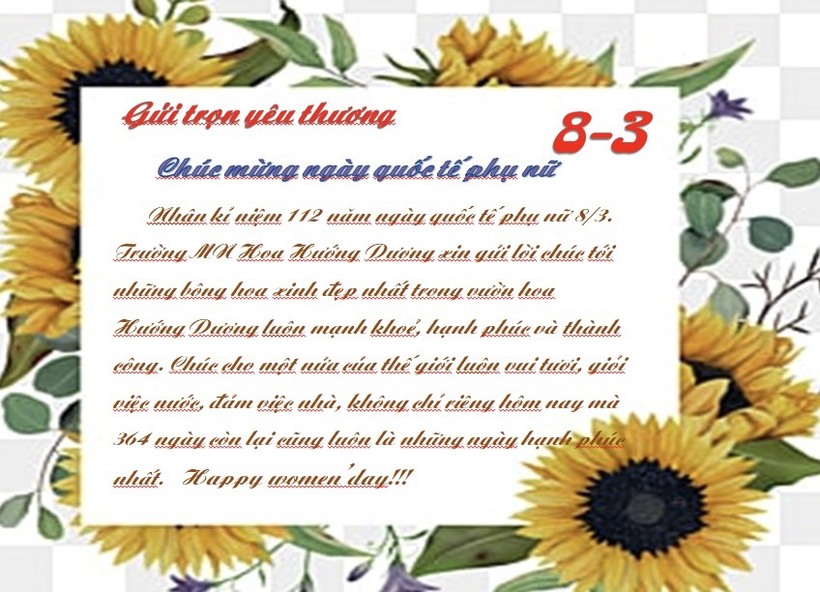 Nhân ngày Quốc tế phụ nữ 8/3/ 2022 Trường Mầm non Hoa Hướng Dương xin gửi tới các nữ cán bộ, giáo viên, nhân viên nhà trường lời chúc mừng sức khỏe, hạnh phúc và thành công, chúc cho mỗi CBGVNV nhà trường luôn là những bông hoa đẹp đầy hương sắc, tô điểm cho cuộc sống tươi vui của đại gia đình trường Mầm non Hoa Hướng Dương .
