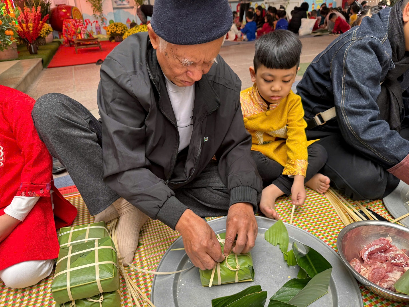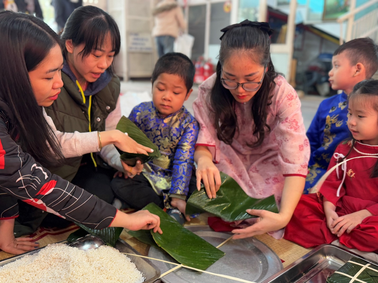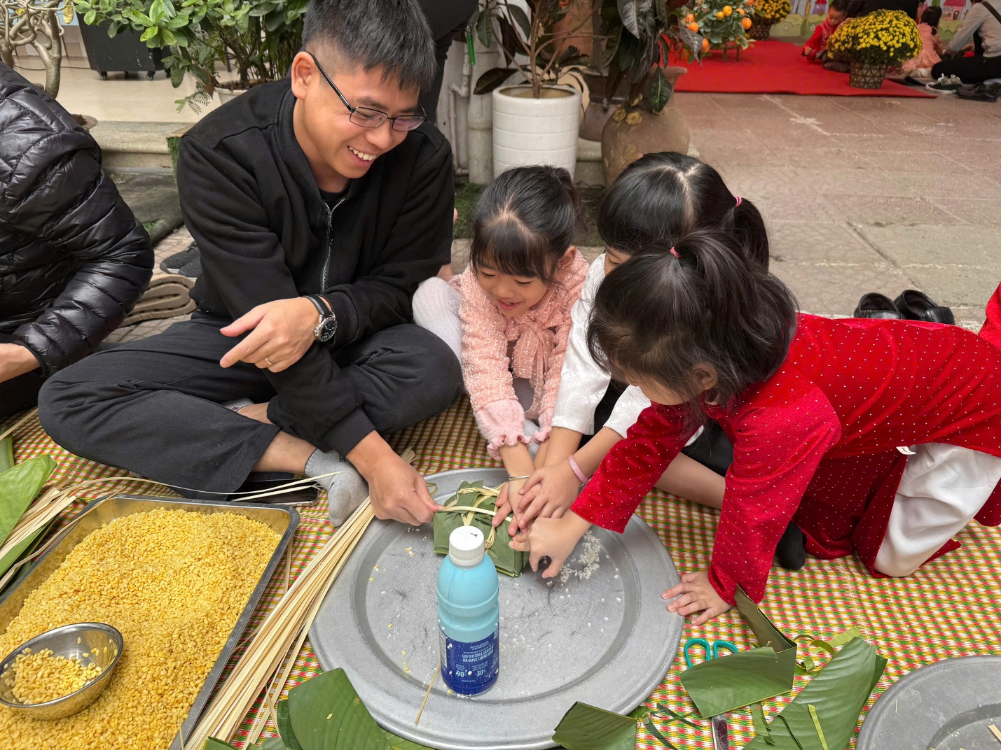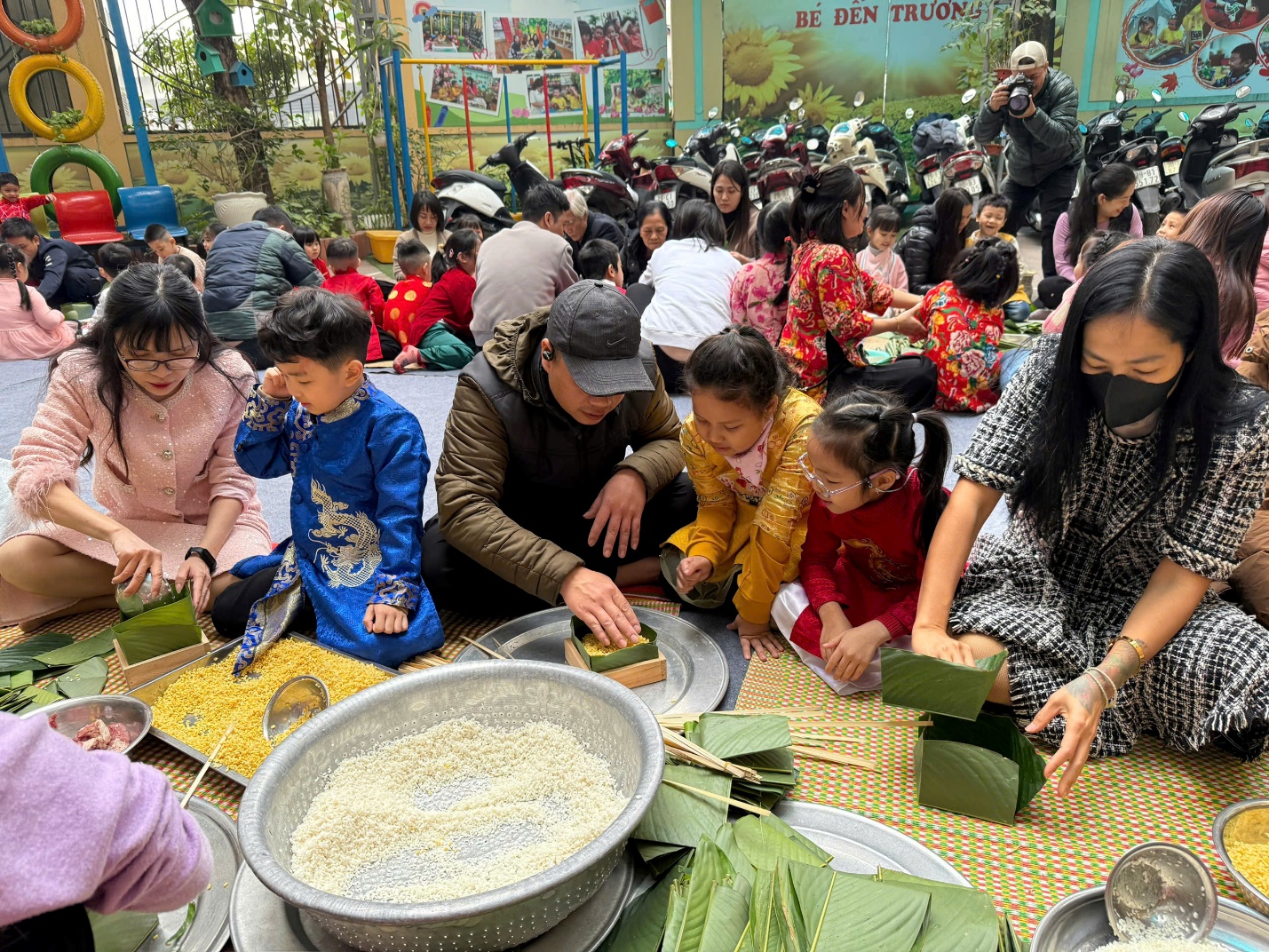 Dưới sự hướng dẫn tận tình của bố mẹ và cô giáo, các bé được tự tay thực hiện các công đoạn gói bánh: từ việc lau lá dong, vo gạo... đến việc xếp nhân thịt và gói bánh. Những đôi bàn tay nhỏ xíu tạo nên những chiếc bánh chưng xinh xắn, vuông vắn. Không khí tại Lễ hội trở nên vô cùng sôi động và ấm áp.