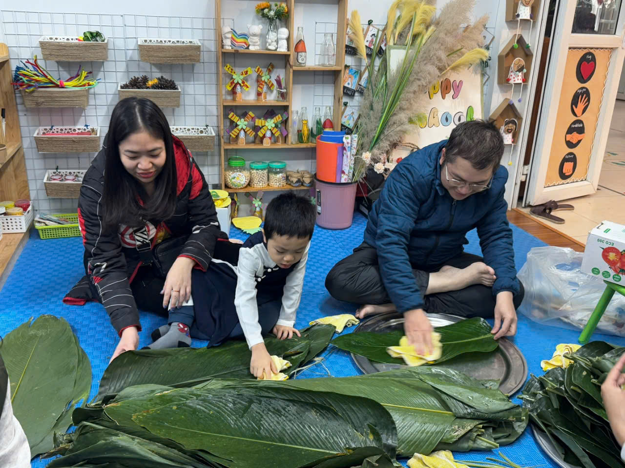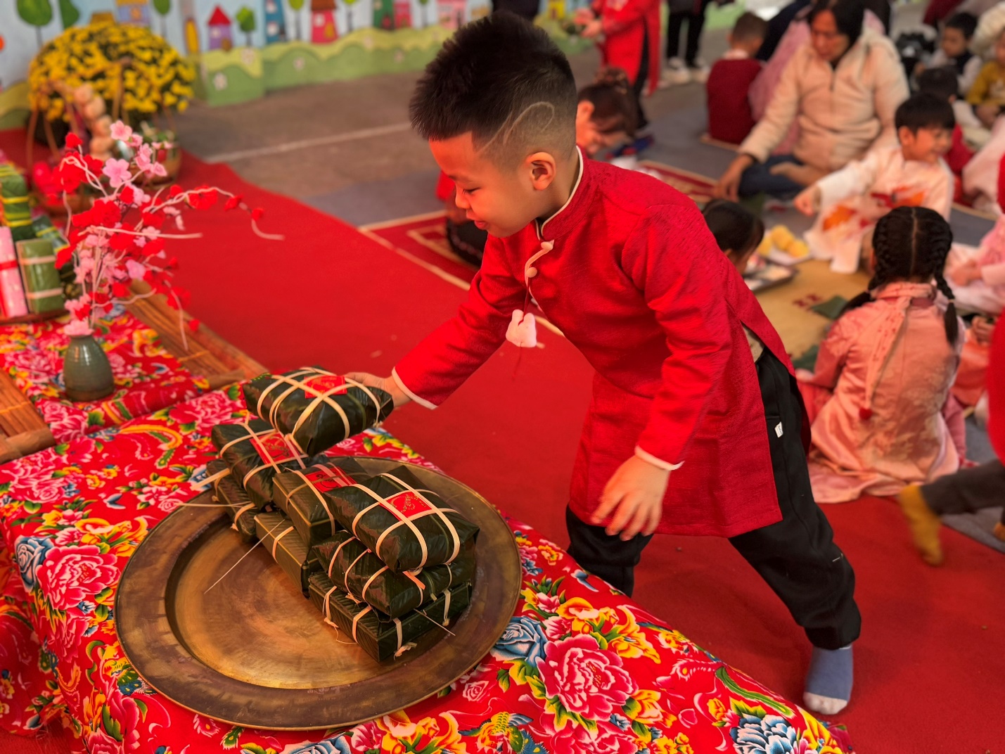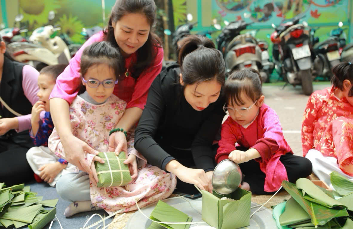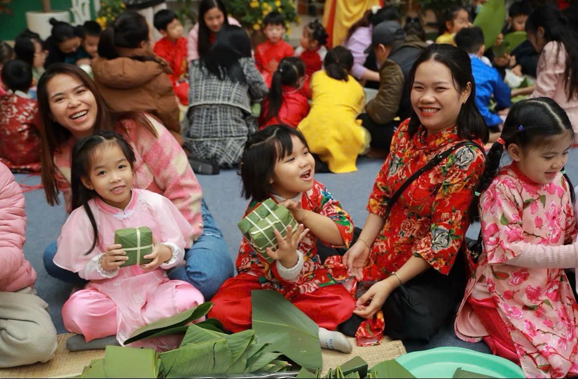 Dưới sự hướng dẫn tận tình của bố mẹ và cô giáo, các bé được tự tay thực hiện các công đoạn gói bánh: từ việc lau lá dong, vo gạo... đến việc xếp nhân thịt và gói bánh. Những đôi bàn tay nhỏ xíu tạo nên những chiếc bánh chưng xinh xắn, vuông vắn. Không khí tại Lễ hội trở nên vô cùng sôi động và ấm áp.