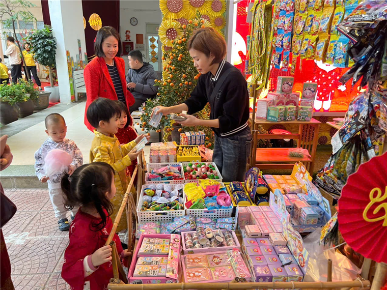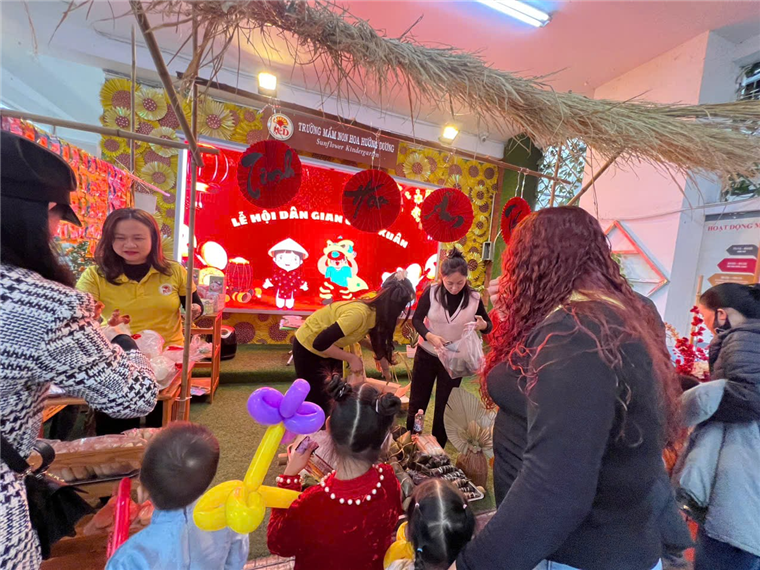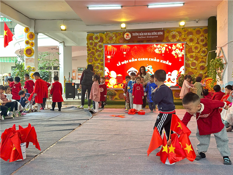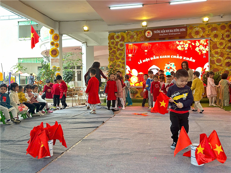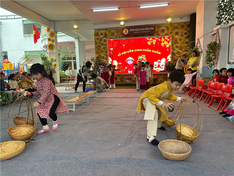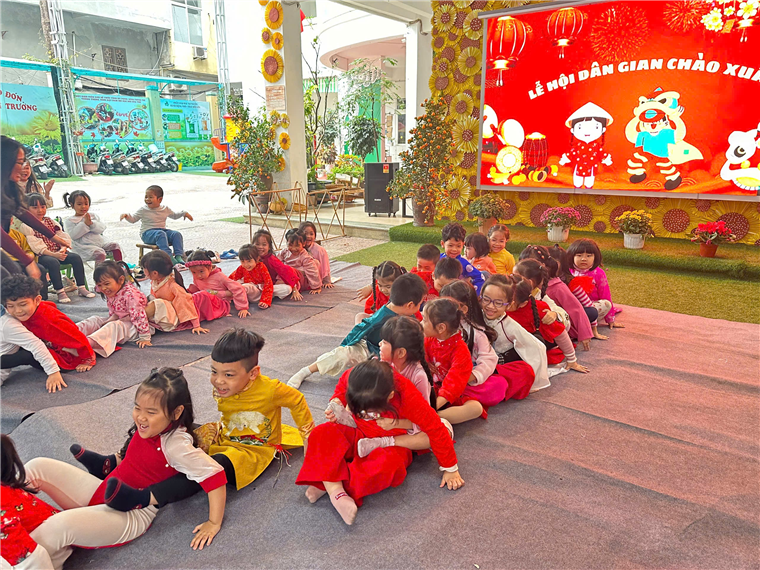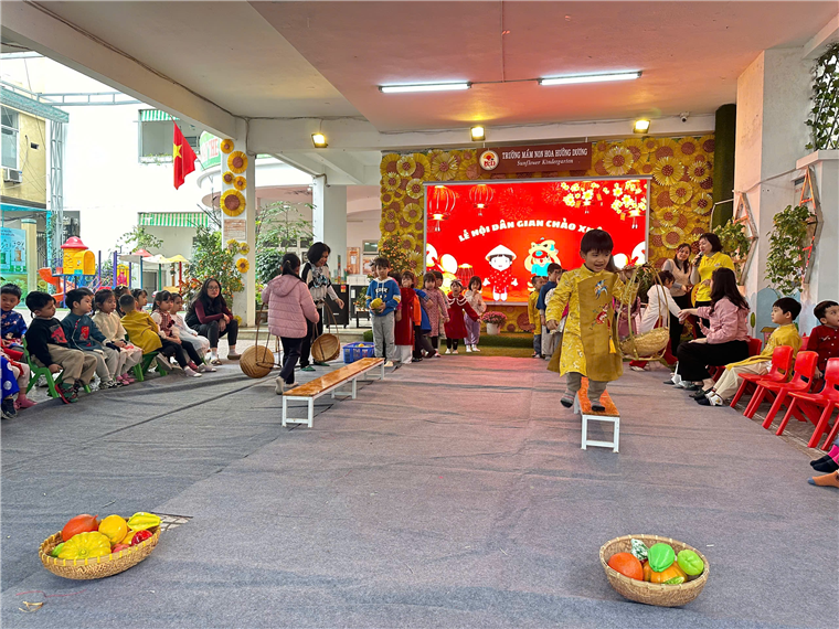 Trong ngày hội này sân trường được trang hoàng rực rỡ, tràn ngập sắc hoa. Chương trình “Lễ hội mùa xuân” diễn ra với nhiều hoạt động phong phú, hấp dẫn, mang đậm bản sắc dân tộc. Tại đây, các bé đã được biểu diễn những tiết mục văn nghệ vui tươi, đặc sắc với chủ đề Tết và mùa xuân. Tiếp đó, Phụ huynh và trẻ còn được tham gia các trò chơi dân gian như: đi cầu khỉ gánh hoa quả, đua vịt, cướp cờ.. Phụ huynh và các bé tham dự hội chợ xuân phối hợp và thể hiện sự năng động, khéo léo, mạnh dạn, tự tin của bản thân.