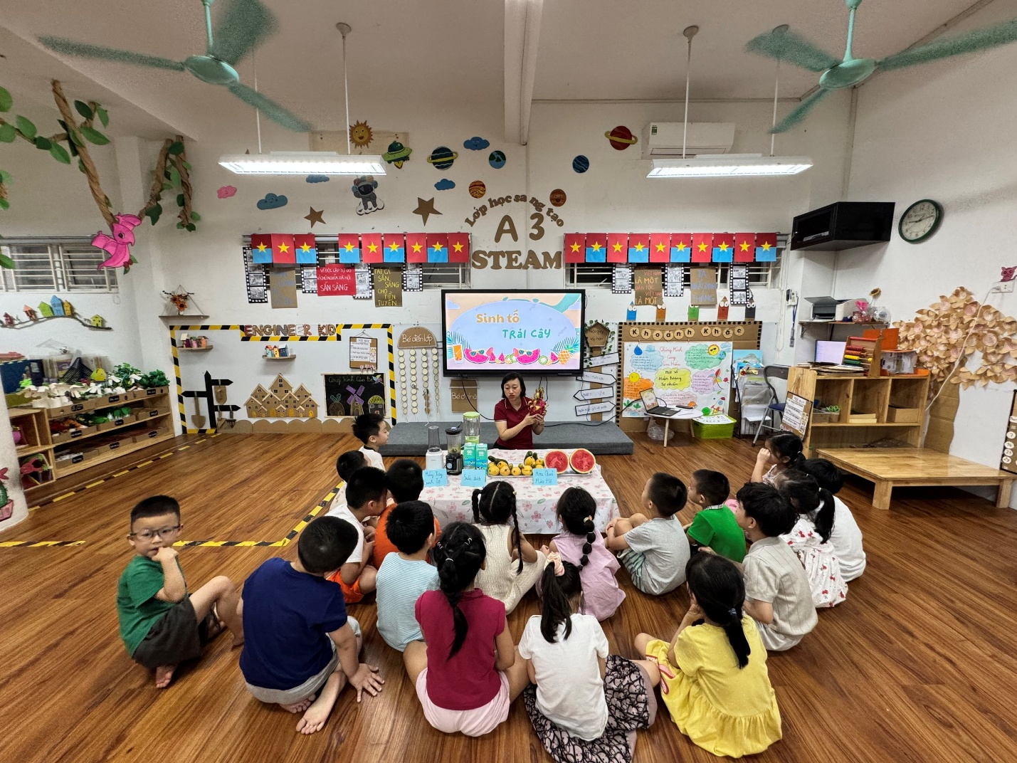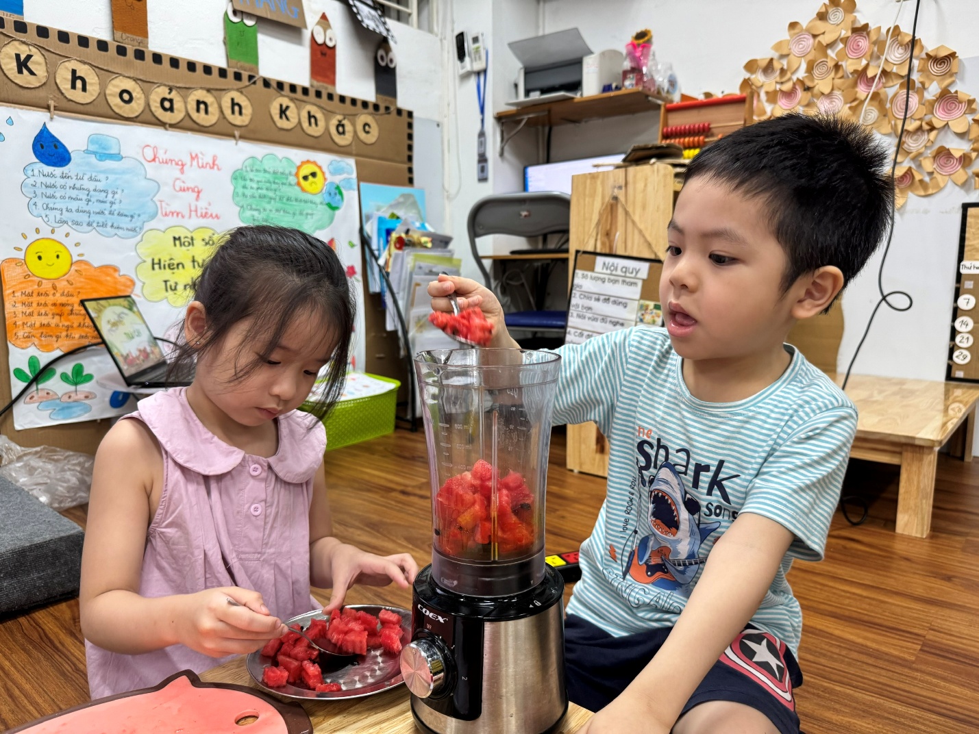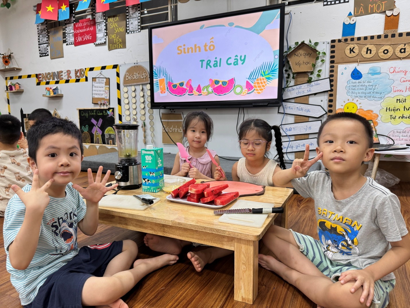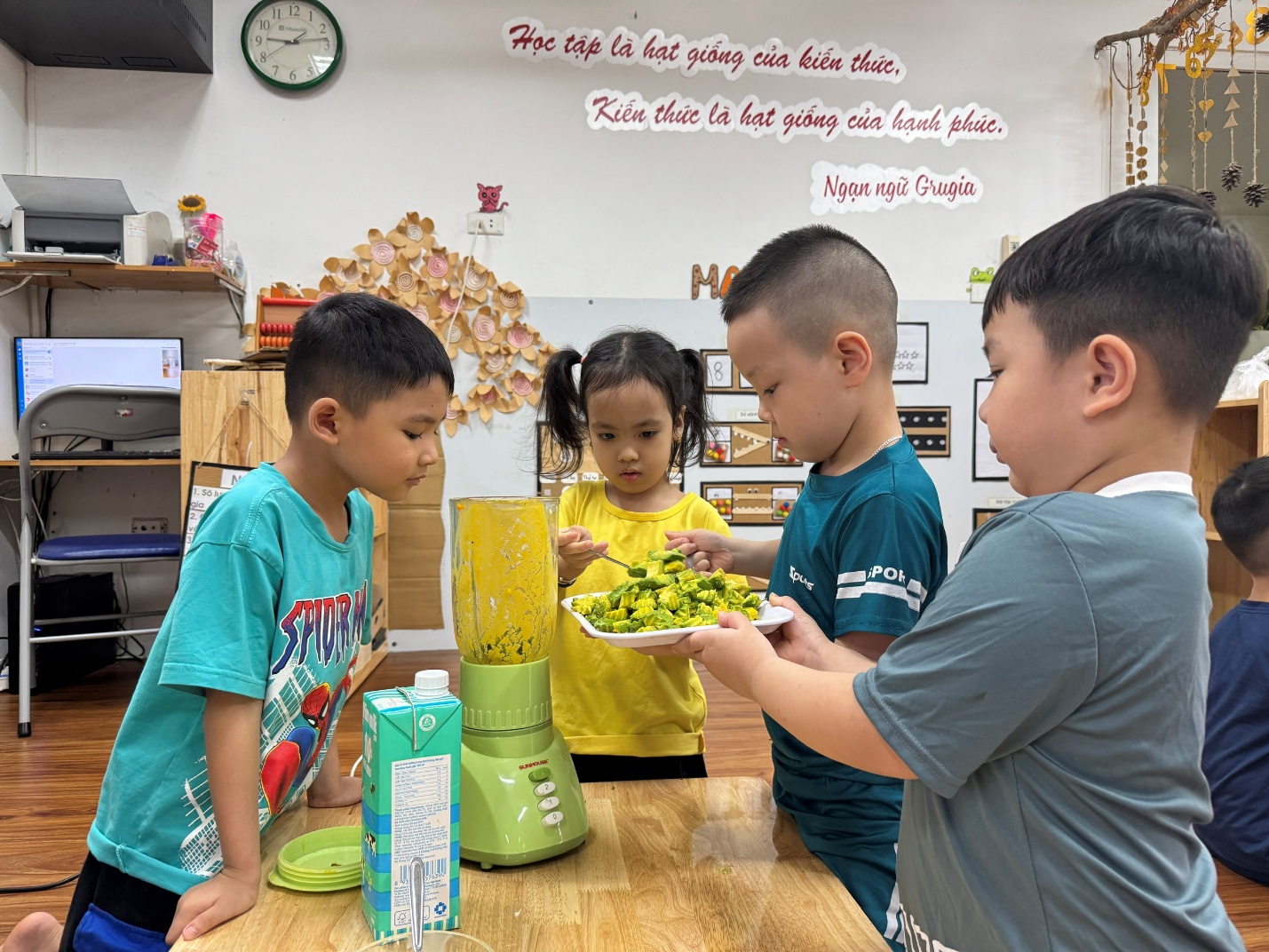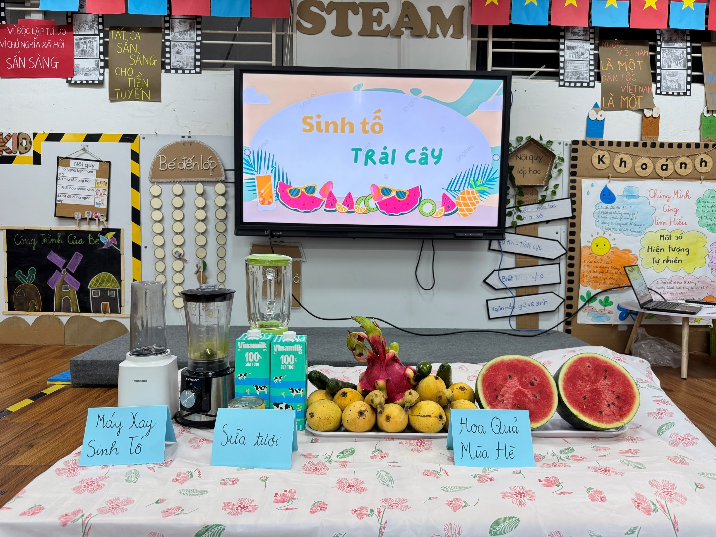 Trong không khí oi ả của mùa hè, các bạn nhỏ lớp mẫu giáo lớn A3 đã cùng nhau trải nghiệm một hoạt động vô cùng thú vị: tự tay làm sinh tố mát lạnh. Những trái cây tươi ngon như chuối, xoài, dưa hấu... được các bé rửa sạch, cắt nhỏ và cho vào máy xay cùng sữa chua, sữa tươi – tạo nên những ly sinh tố ngọt mát, đầy màu sắc.