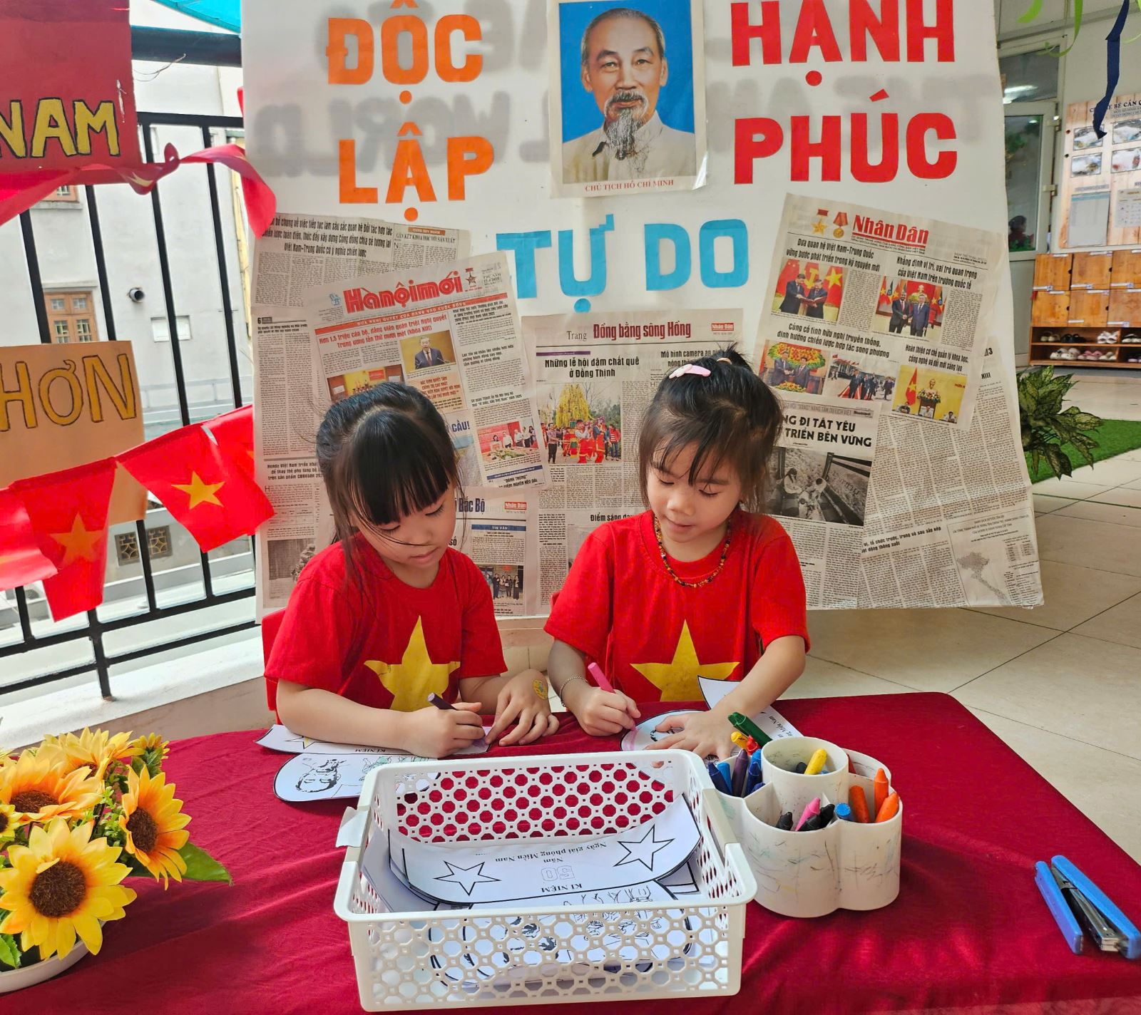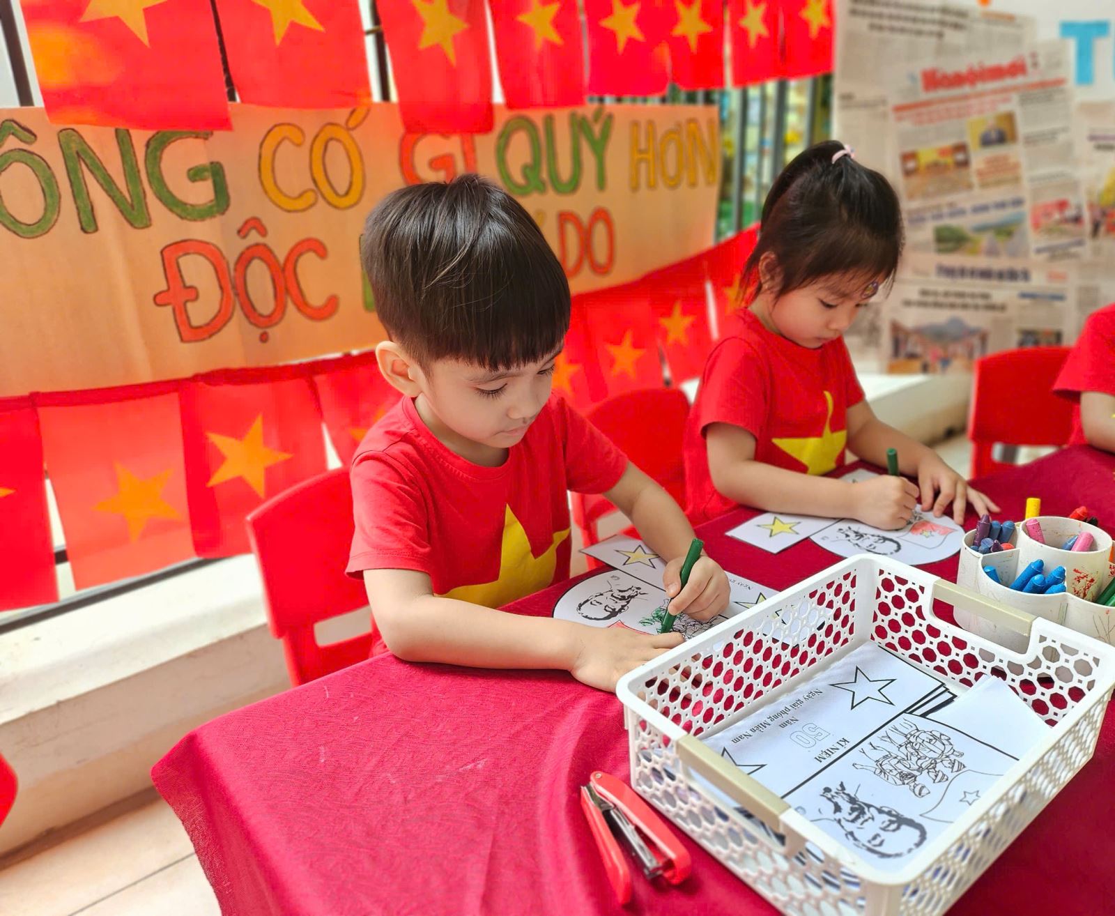 Các bé vô cùng háo hức và say mê với hoạt động này. Với hình ảnh ngôi sao vàng, cờ đỏ thắm nổi bật, mỗi chiếc mũ là một tác phẩm chứa đựng tình cảm yêu mến đối với quê hương đất nước
