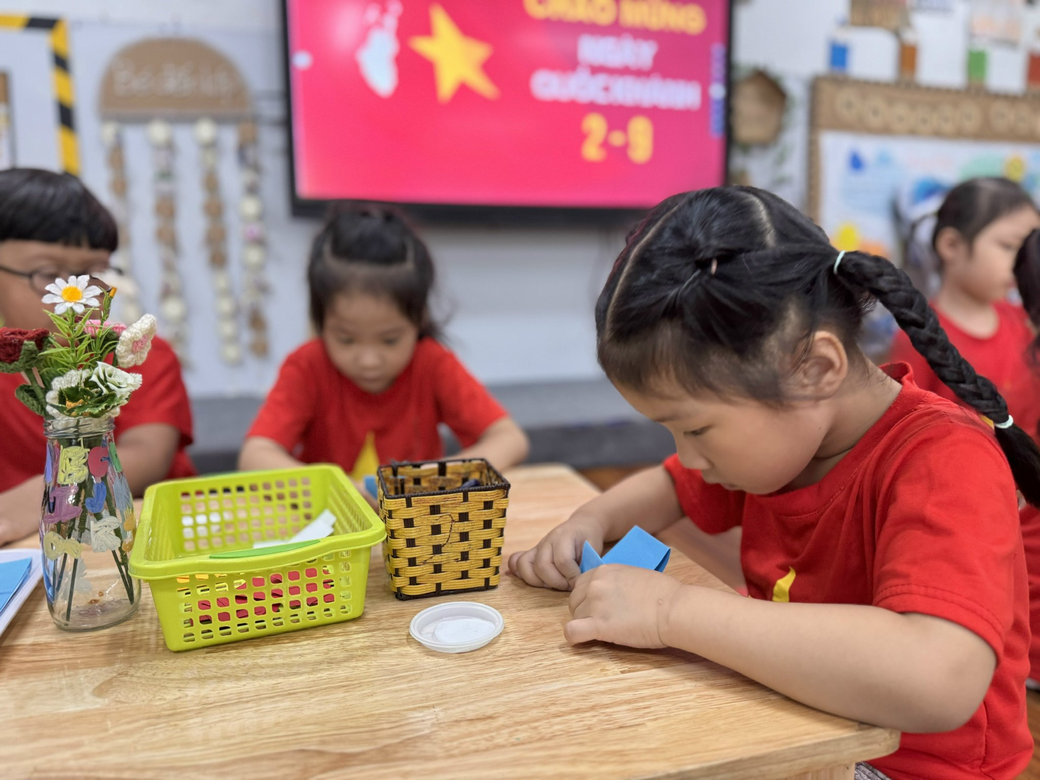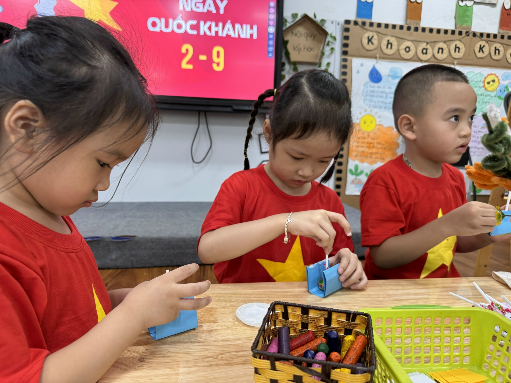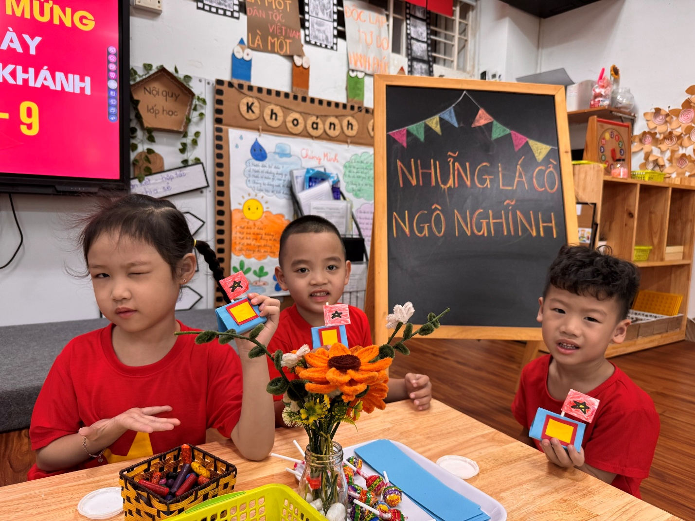Từng mảnh giấy đỏ, ngôi sao vàng được cắt, tô, dán bằng tất cả sự khéo léo và háo hức của đôi bàn tay nhỏ bé. Khi những lá cờ hoàn thành không gian như rực sáng bởi sắc đỏ vàng thân thương.
