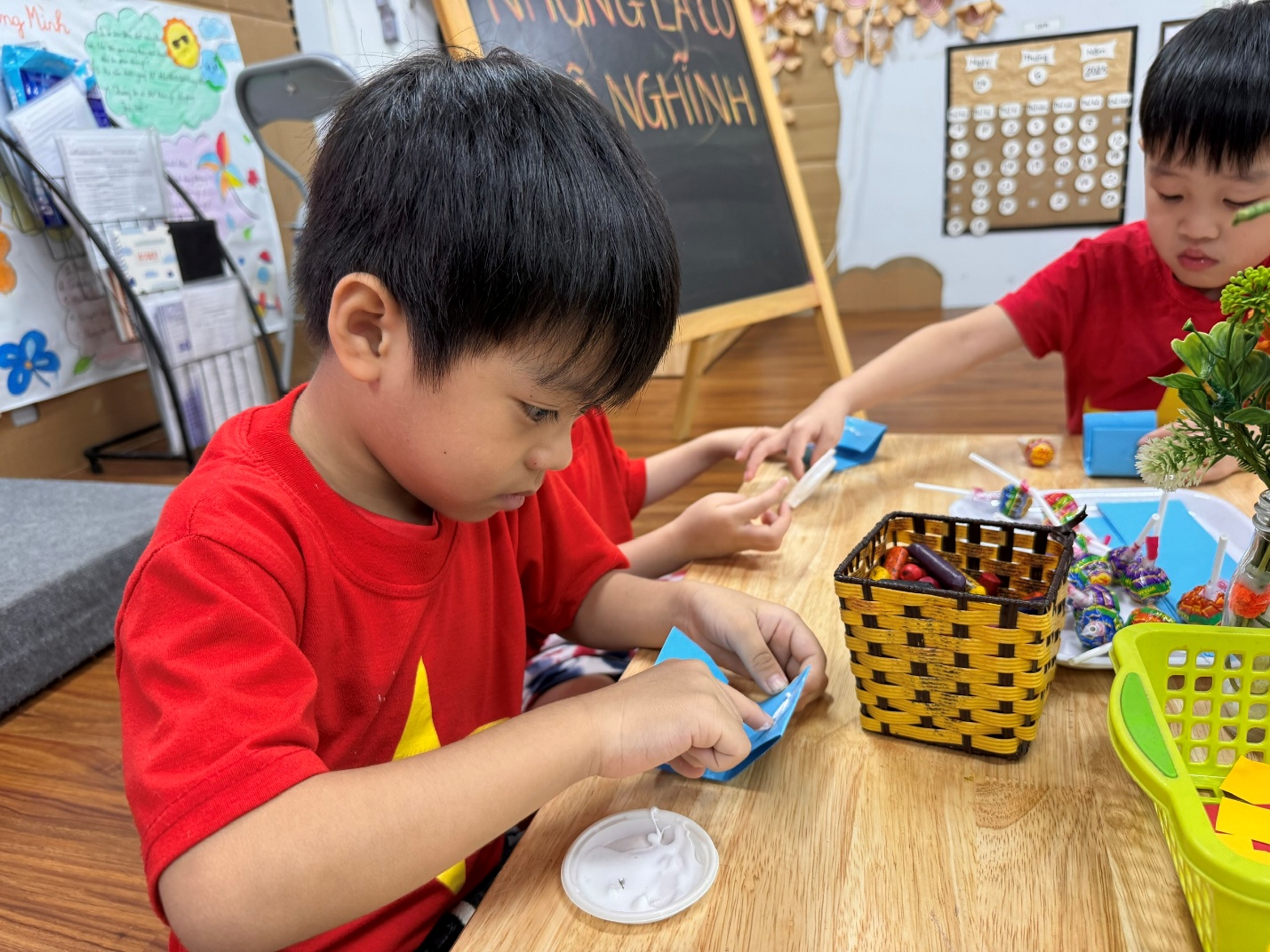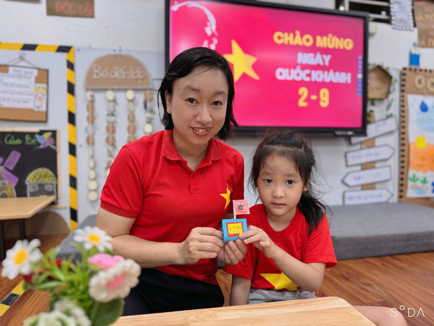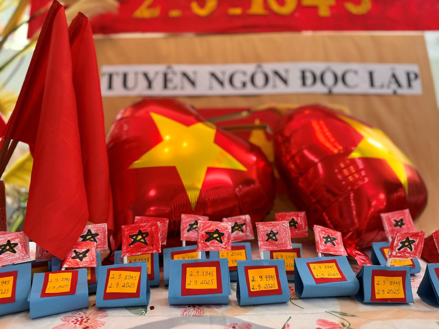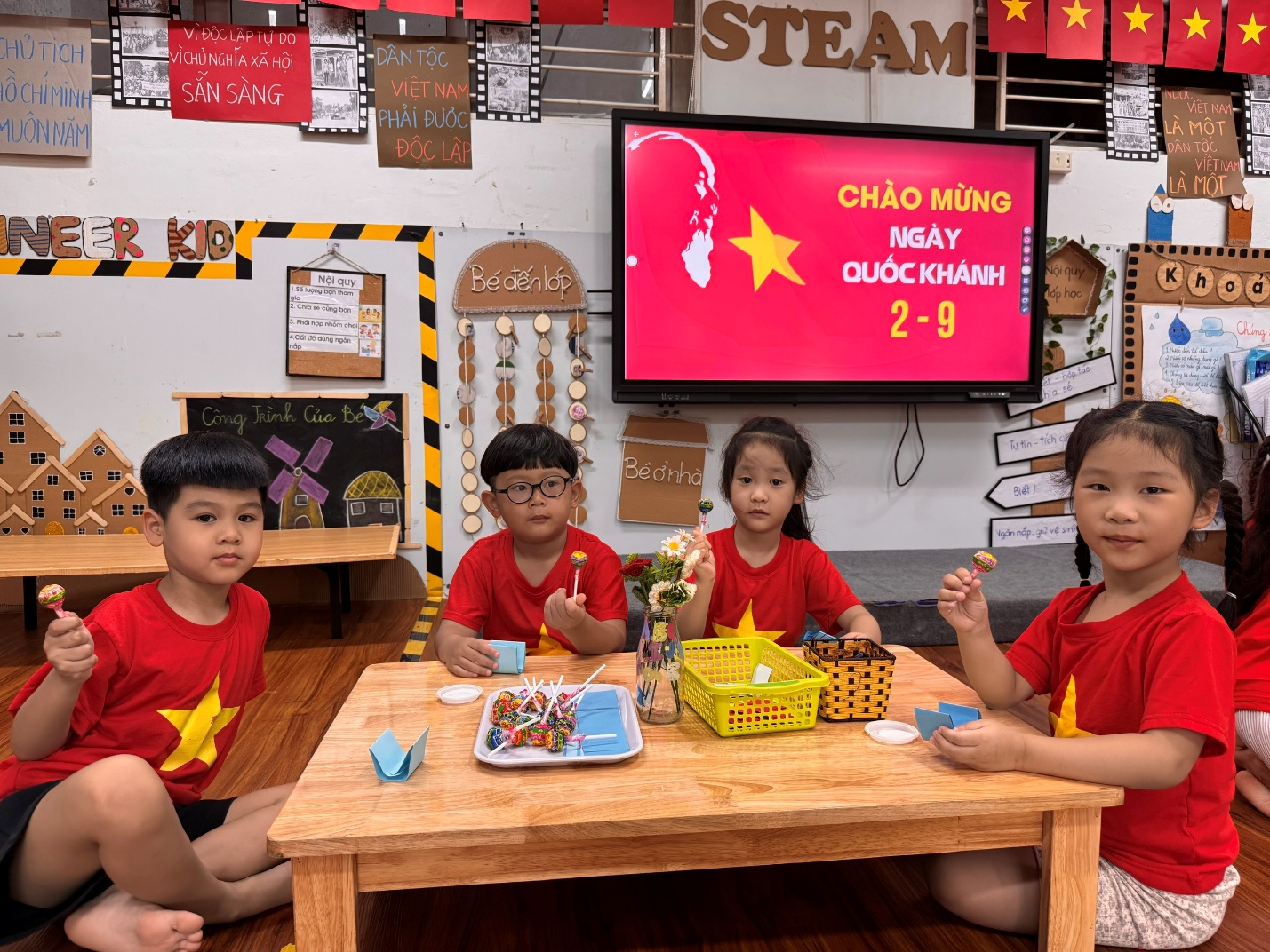Từng mảnh giấy đỏ, ngôi sao vàng được cắt, tô, dán bằng tất cả sự khéo léo và háo hức của đôi bàn tay nhỏ bé. Khi những lá cờ hoàn thành không gian như rực sáng bởi sắc đỏ vàng thân thương.