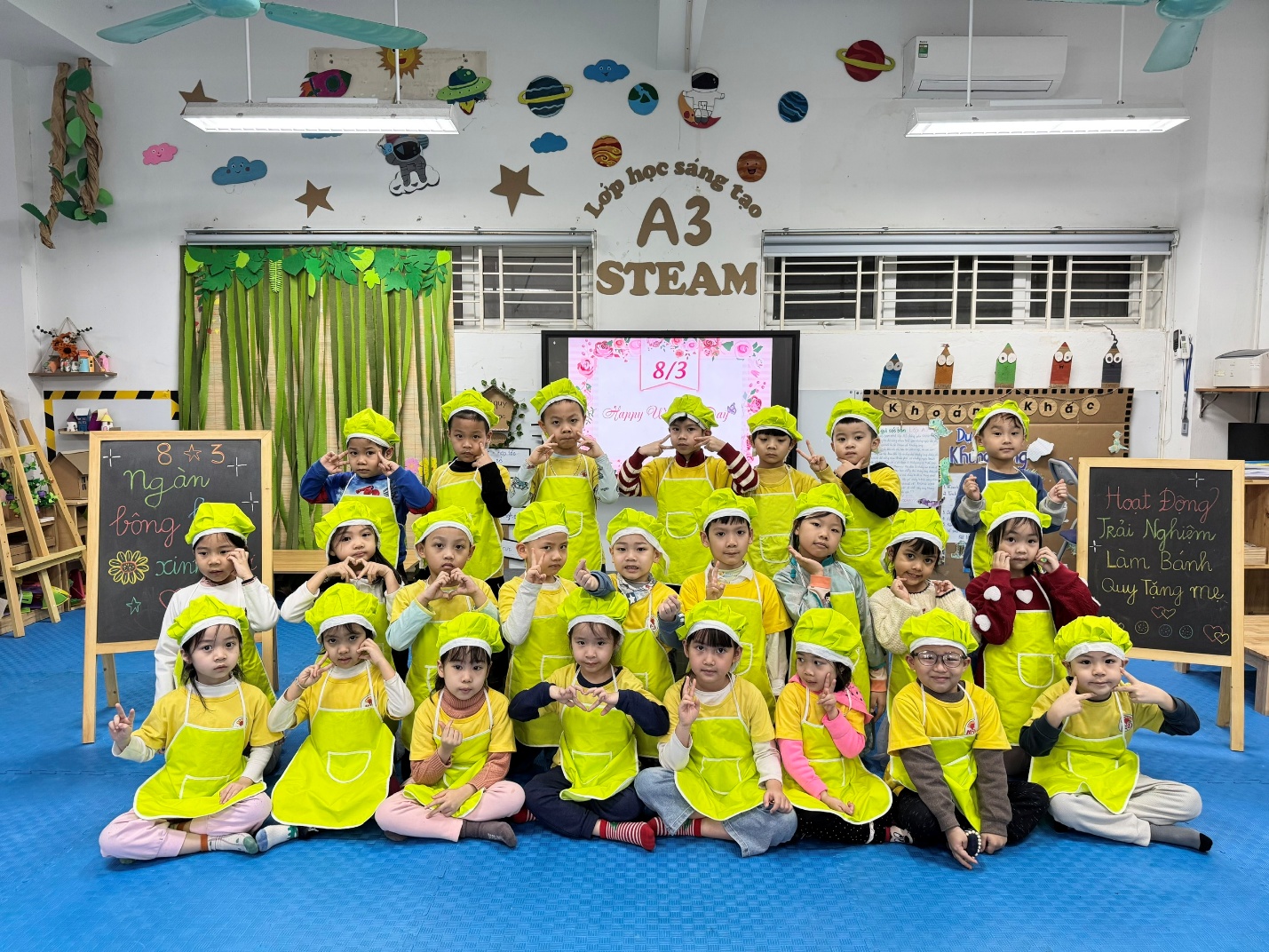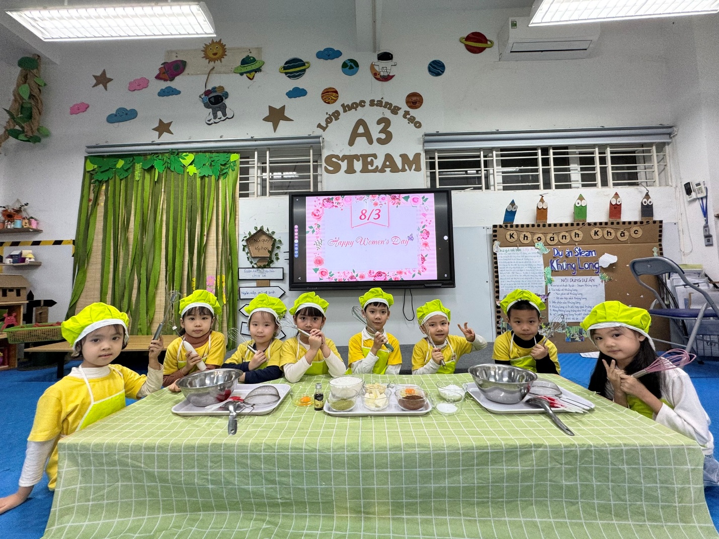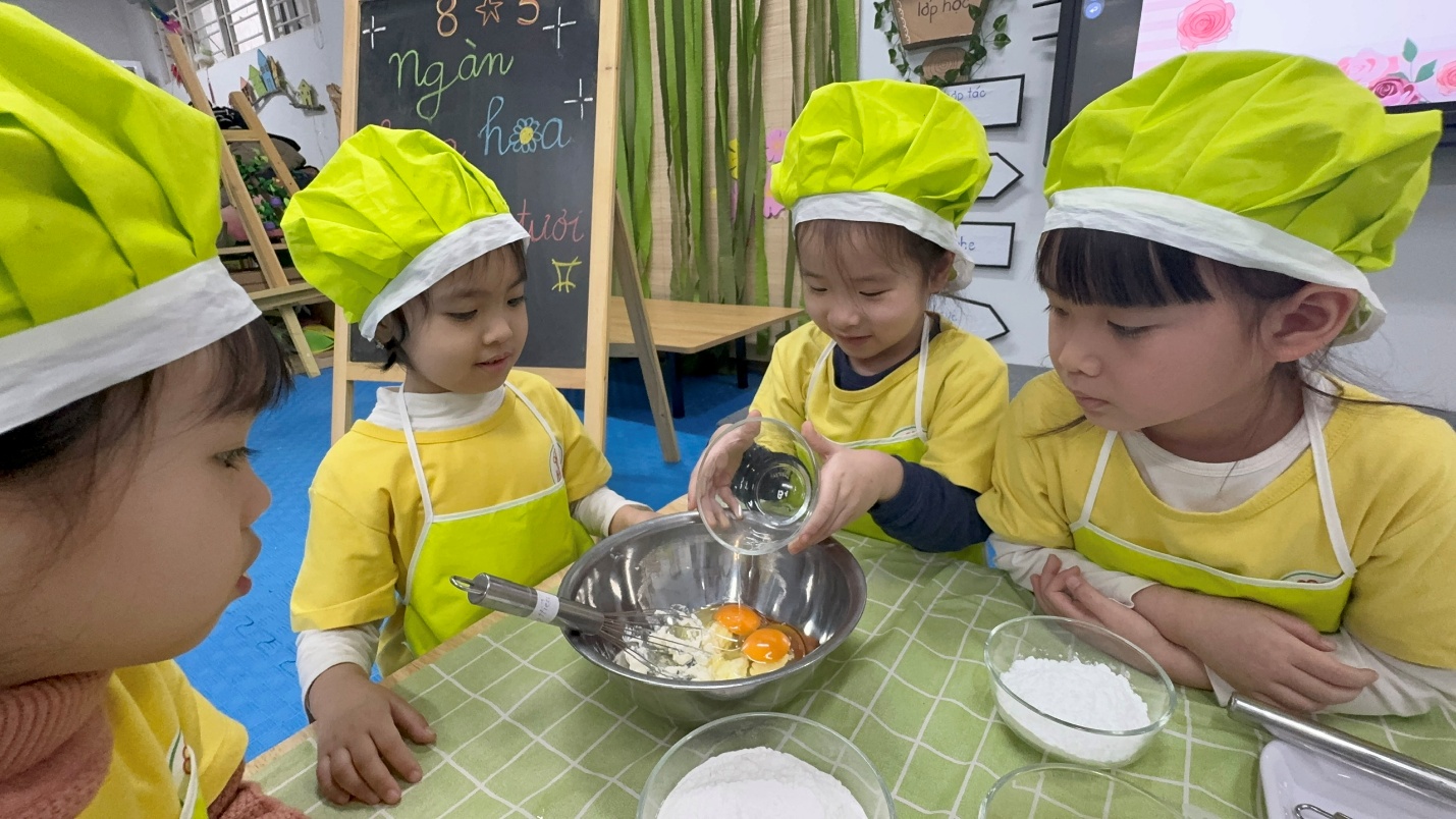 Dưới sự hướng dẫn của cô giáo, các bé hào hứng tham gia làm bánh từ những bước đơn giản như nhào bột, tạo hình, trang trí….Không khí lớp học ngập tràn tiếng cười và niềm vui khi các bé mong chờ sản phẩm của mình được hoàn thành.