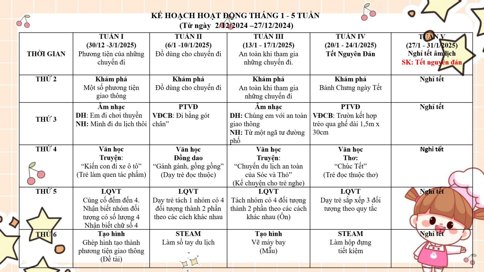 Kê hoạch giáo dục tháng 1- Lớp MGN B1 - Chủ đề: Giao thông