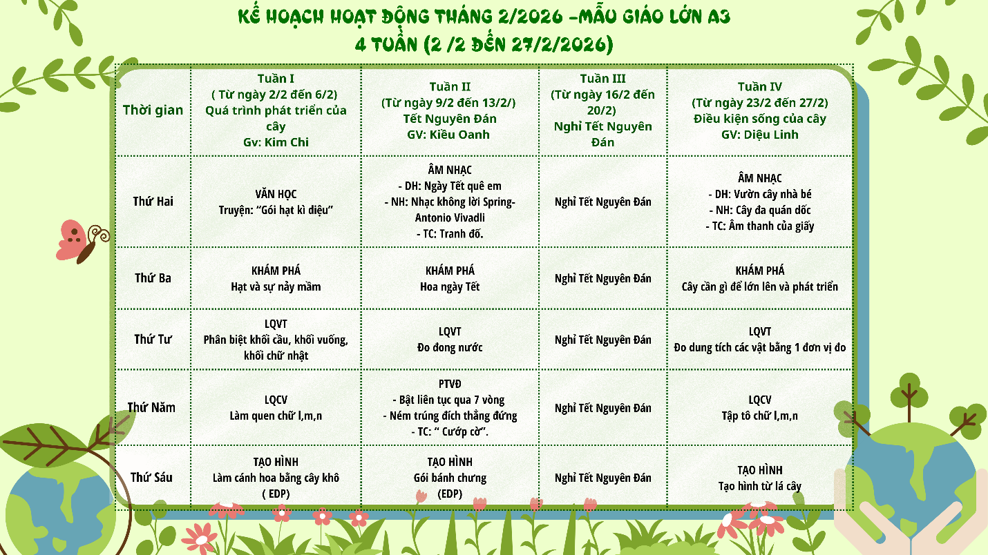 Kế hoạch hoạt động tháng 2/2026 Chủ đề: Thực vật