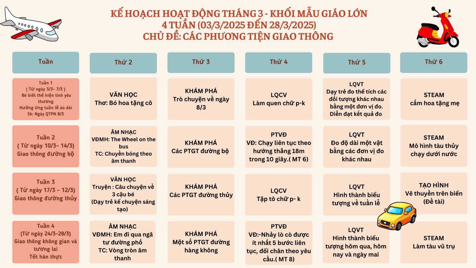 Kế hoạch hoạt động giáo dục tháng 3 lớp Mẫu giáo lớn A2 - Chủ đề: Các phương tiện giao thông