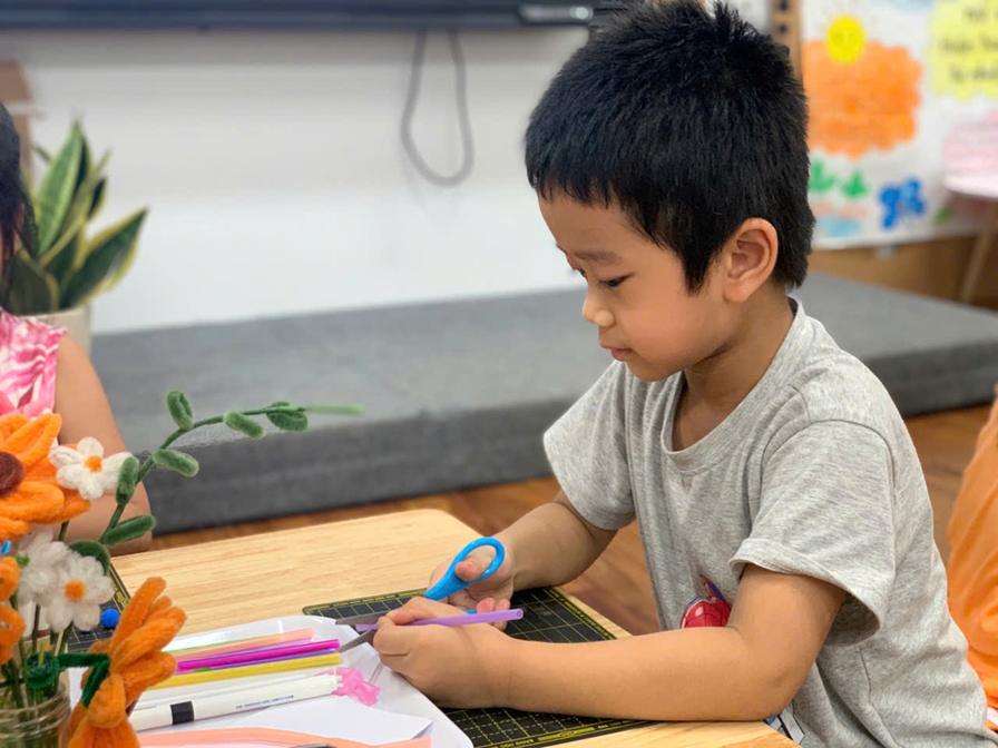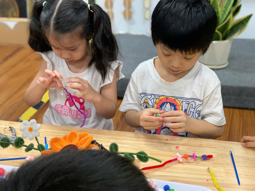 Tại buổi học, các bé đã được tự tay lựa chọn những vật liệu rất gần gũi và đa dạng an toàn như: dây kẽm mềm để tạo khung trang sức, đất nặn tự khô để nặn hình mặt trời, con sò, cá biển… và ống hút nhiều màu để cắt thành hạt trang trí.