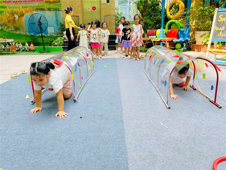 Không khí ngày hội càng thêm sôi động với các trò chơi vận động như truyền bóng, siêu nhân vượt địa hình, ném bóng siêu đỉnh, gió thầm thôi tháp…Những trò chơi này không chỉ rèn luyện sự khéo léo, nhanh nhẹn, tinh thần đồng đội mà còn giúp các con hiểu hơn về sức mạnh của hơi thở. Tiếng cười giòn tan khi có bạn làm rơi bóng, và những tiếng reo hò cổ vũ khi cả đội thành công, thật vui biết bao.