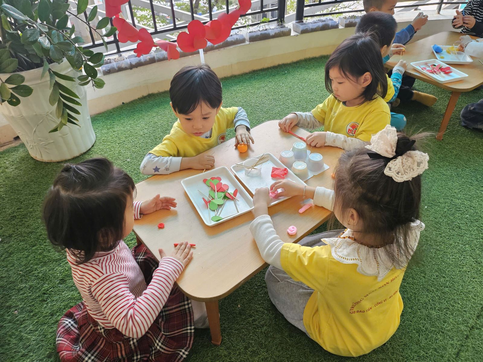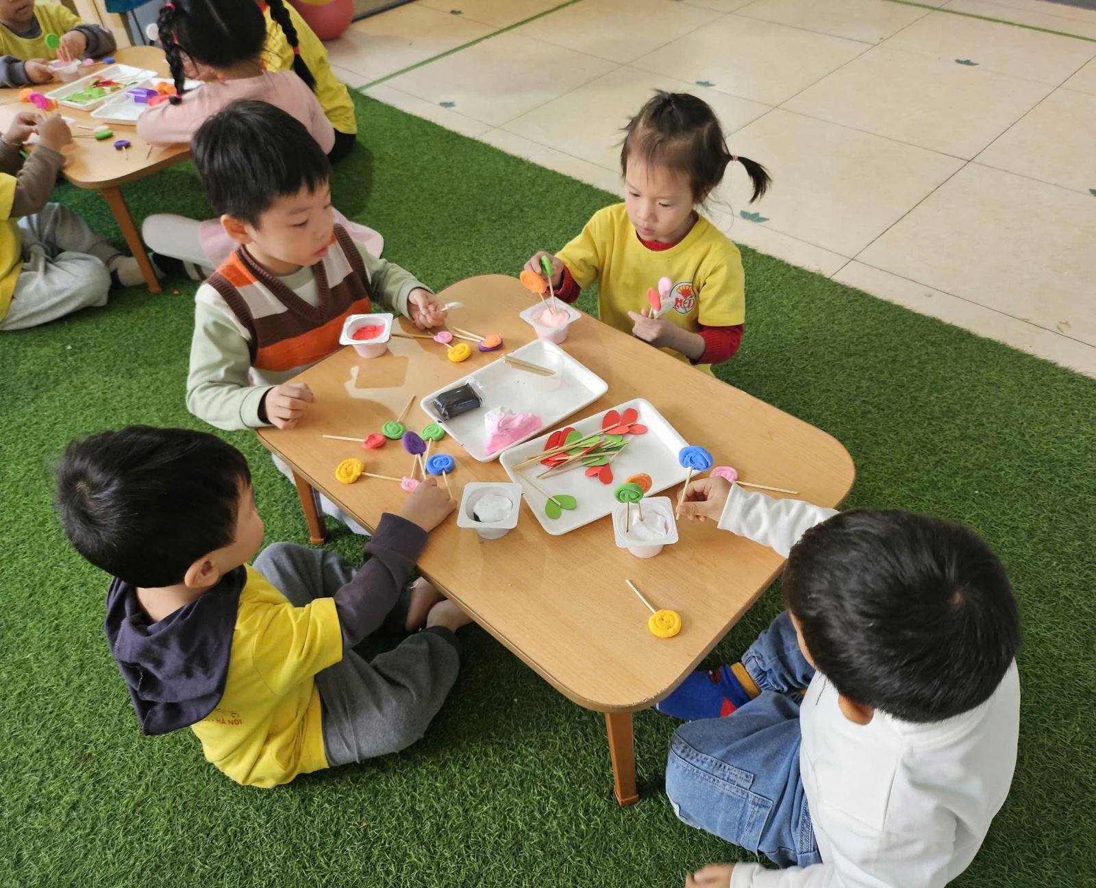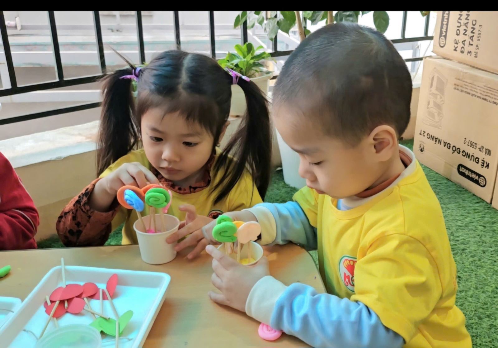 Với đôi bàn tay khéo léo và óc sáng tạo, các bé đã cùng nhau tự tay nặn, uốn, làm những chiếc kẹp xinh xắn từ đất màu, và các nguyên liệu tái chế. Hoạt động không chỉ giúp các bé rèn luyện kỹ năng thủ công mà còn mang đến niềm vui khi được góp phần trang trí lớp học thêm rực rỡ sắc xuân. Niềm vui hiện rõ trên gương mặt các bé khi nhìn thành phẩm của mình được trưng bày trong góc trang trí Tết của lớp.