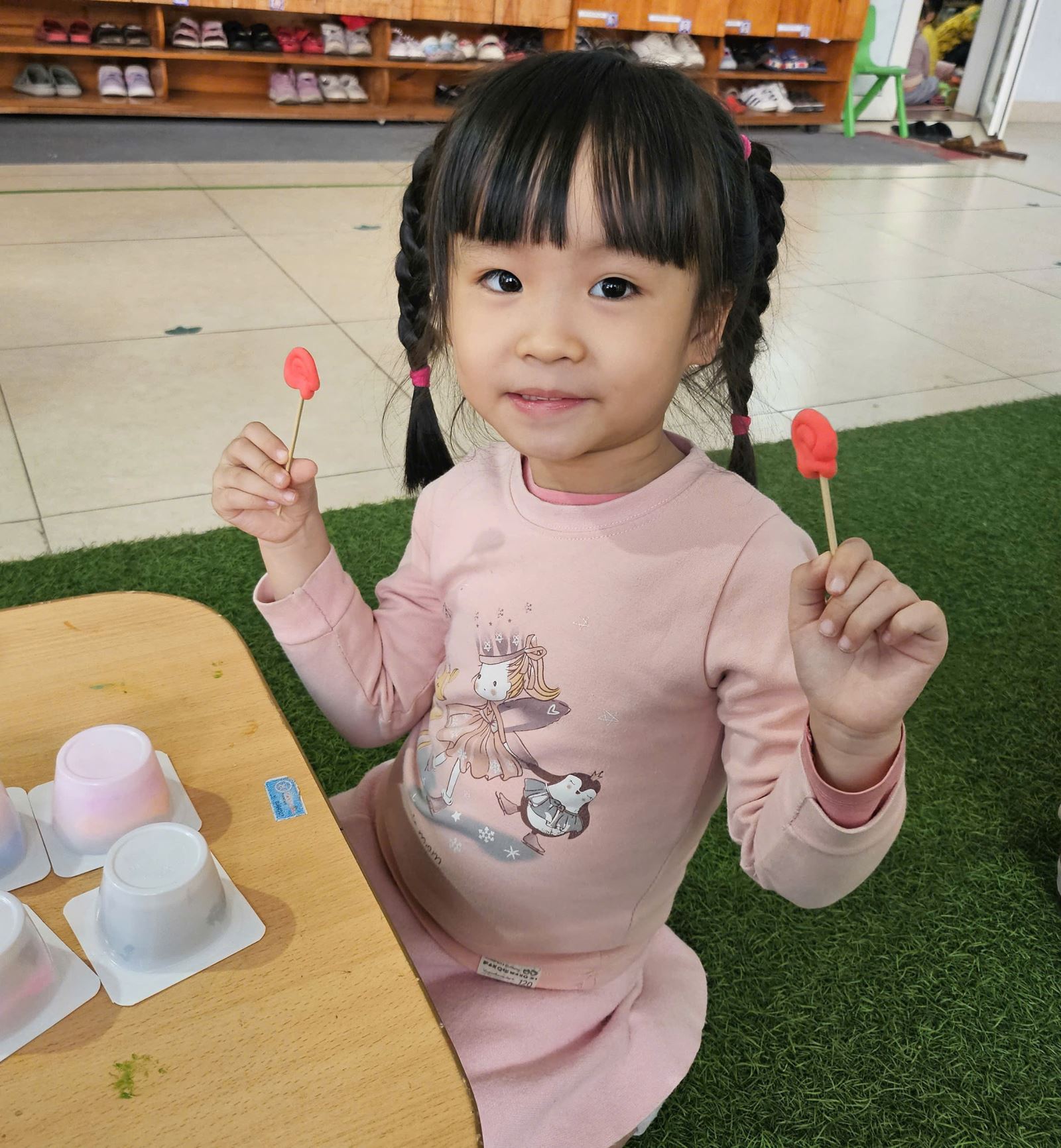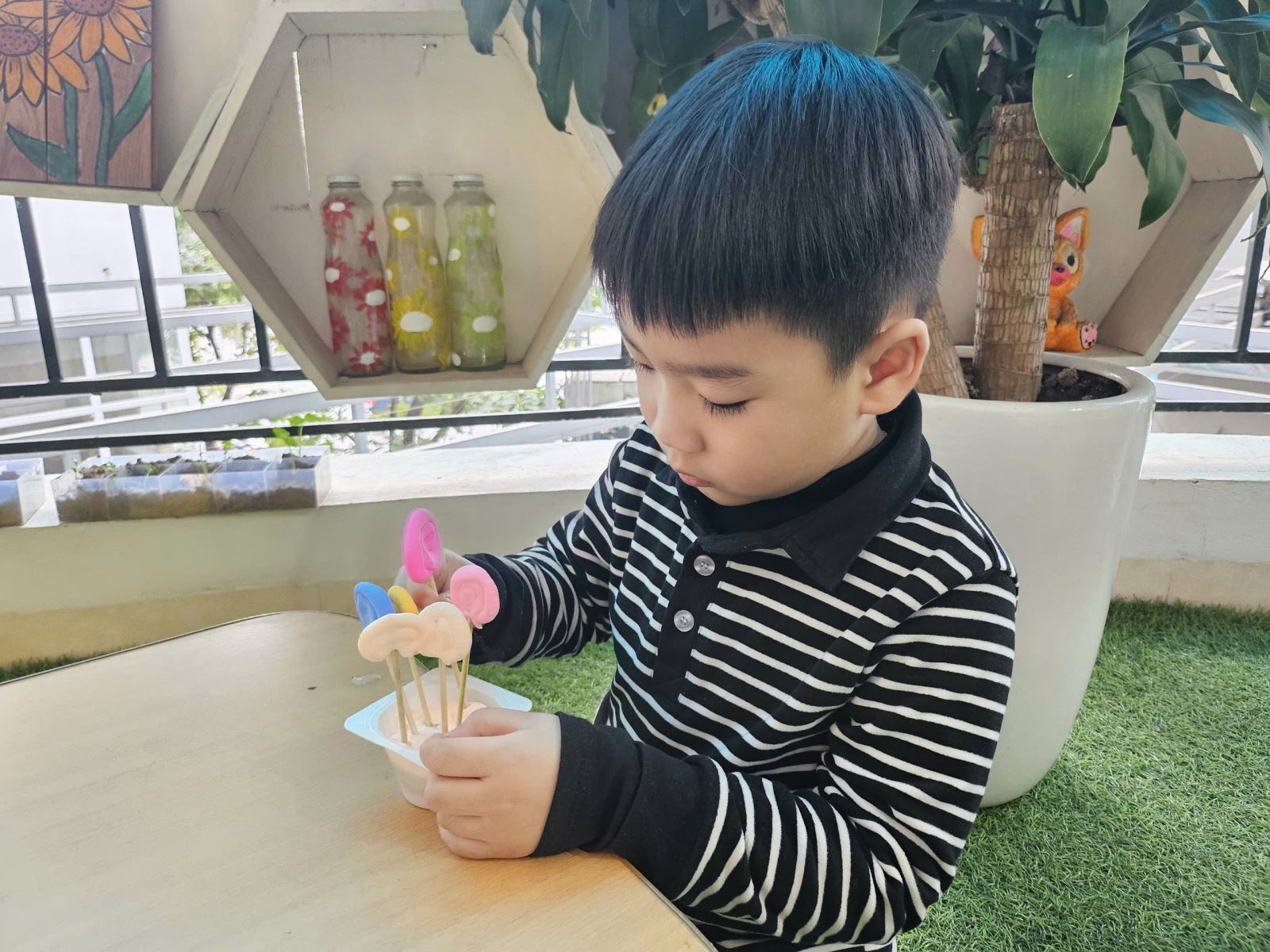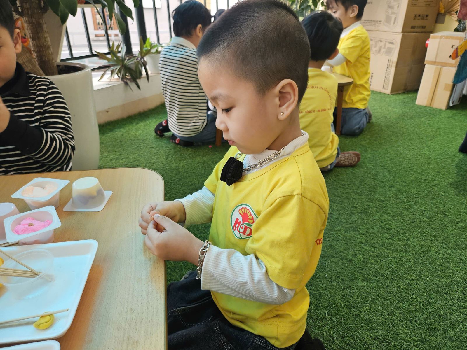 Với đôi bàn tay khéo léo và óc sáng tạo, các bé đã cùng nhau tự tay nặn, uốn, làm những chiếc kẹp xinh xắn từ đất màu, và các nguyên liệu tái chế. Hoạt động không chỉ giúp các bé rèn luyện kỹ năng thủ công mà còn mang đến niềm vui khi được góp phần trang trí lớp học thêm rực rỡ sắc xuân. Niềm vui hiện rõ trên gương mặt các bé khi nhìn thành phẩm của mình được trưng bày trong góc trang trí Tết của lớp.