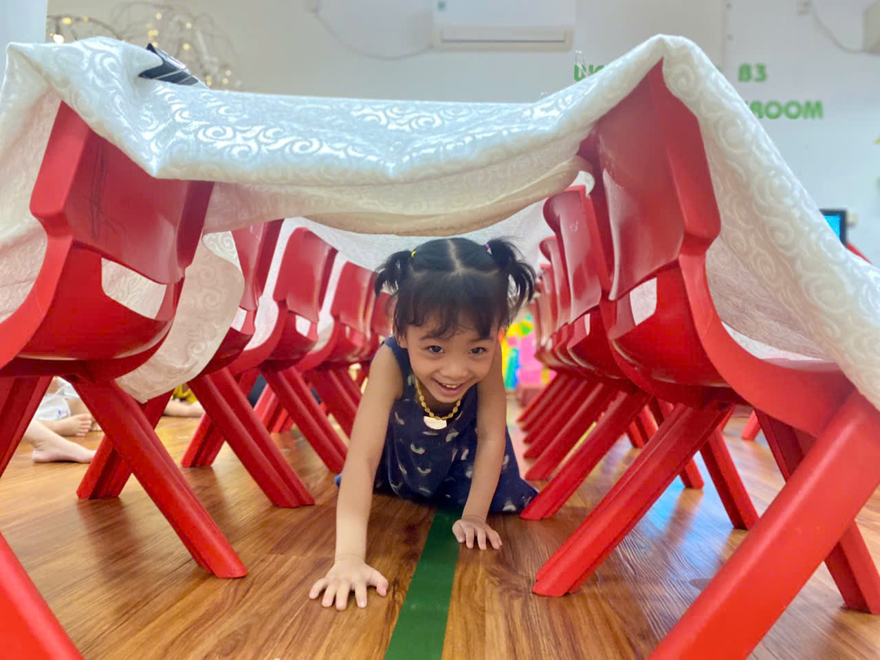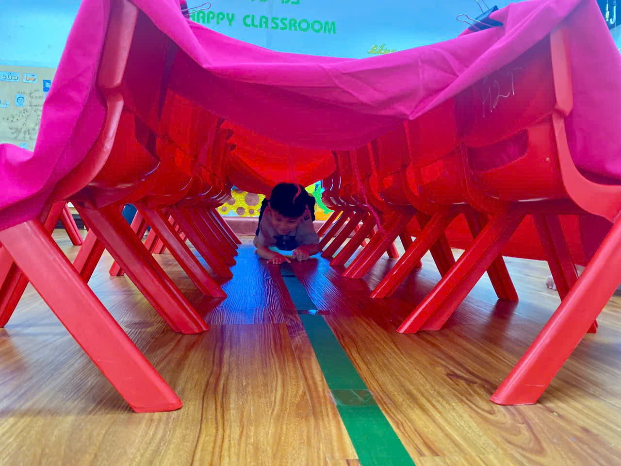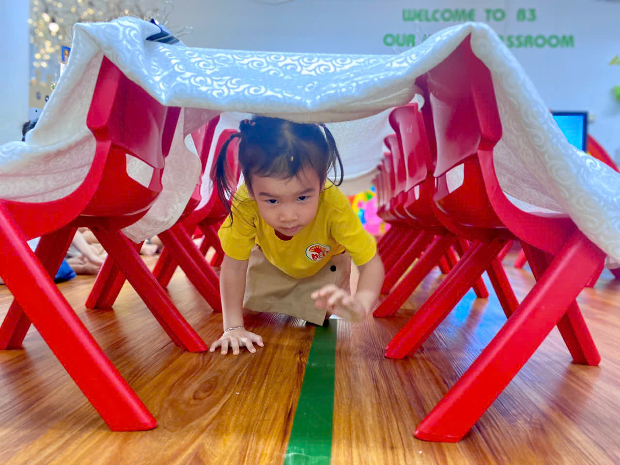 Những chiếc ghế trong lớp được xếp thành hàng, kết hợp cùng khăn trải bàn tạo thành một “đường hầm bí mật” vô cùng thú vị. Các bé thích thú khi được khom người, bò và chui qua, vừa vận động cơ thể dẻo dai vừa rèn sự phối hợp linh hoạt giữa các giác quan.