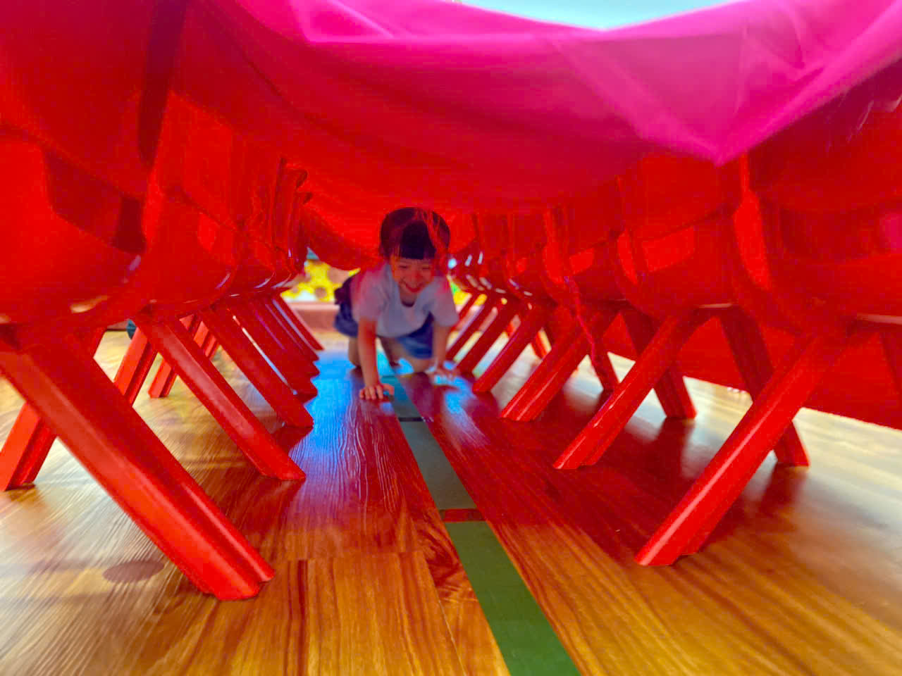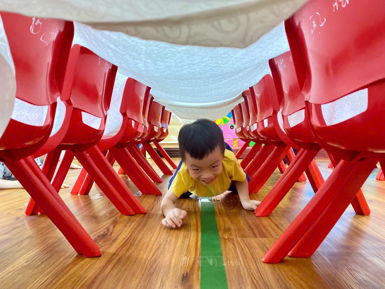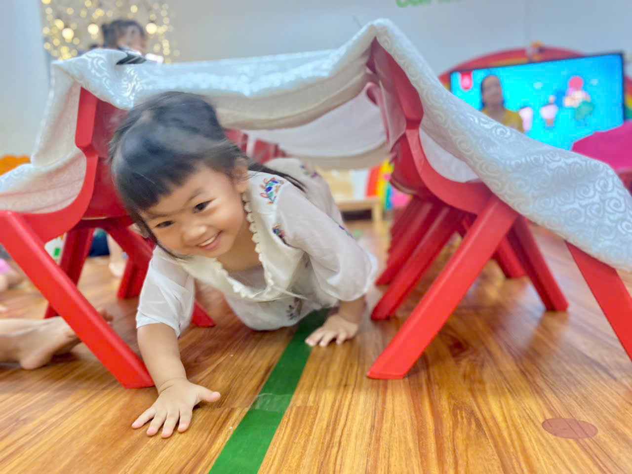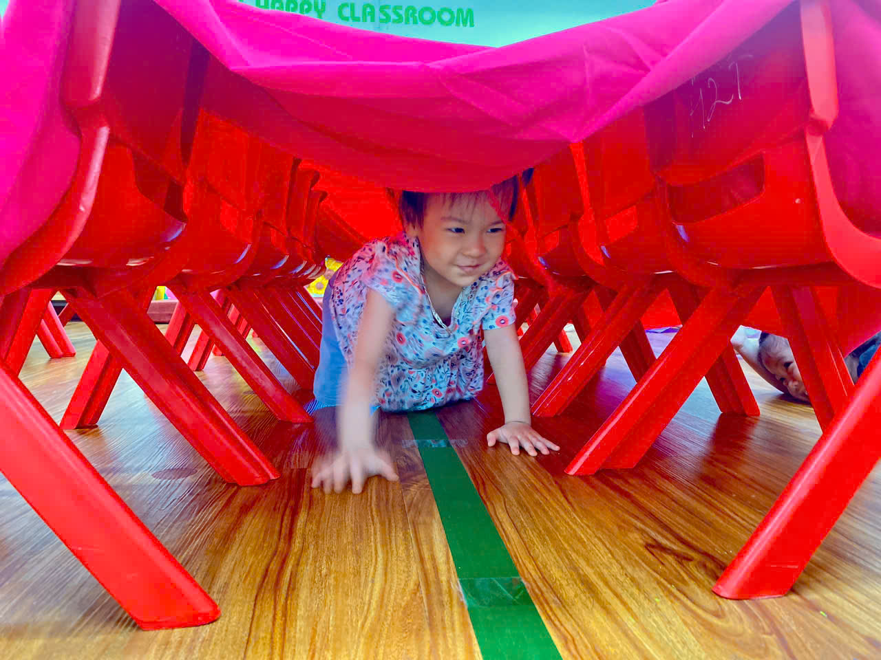 Những chiếc ghế trong lớp được xếp thành hàng, kết hợp cùng khăn trải bàn tạo thành một “đường hầm bí mật” vô cùng thú vị. Các bé thích thú khi được khom người, bò và chui qua, vừa vận động cơ thể dẻo dai vừa rèn sự phối hợp linh hoạt giữa các giác quan.