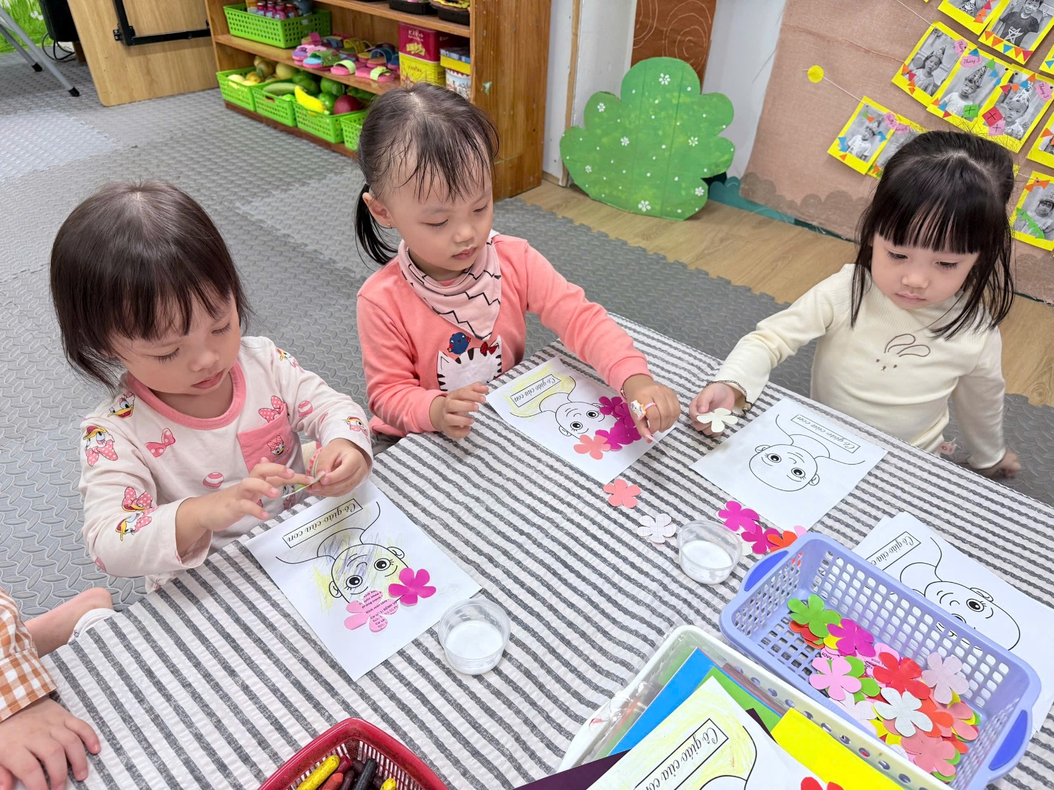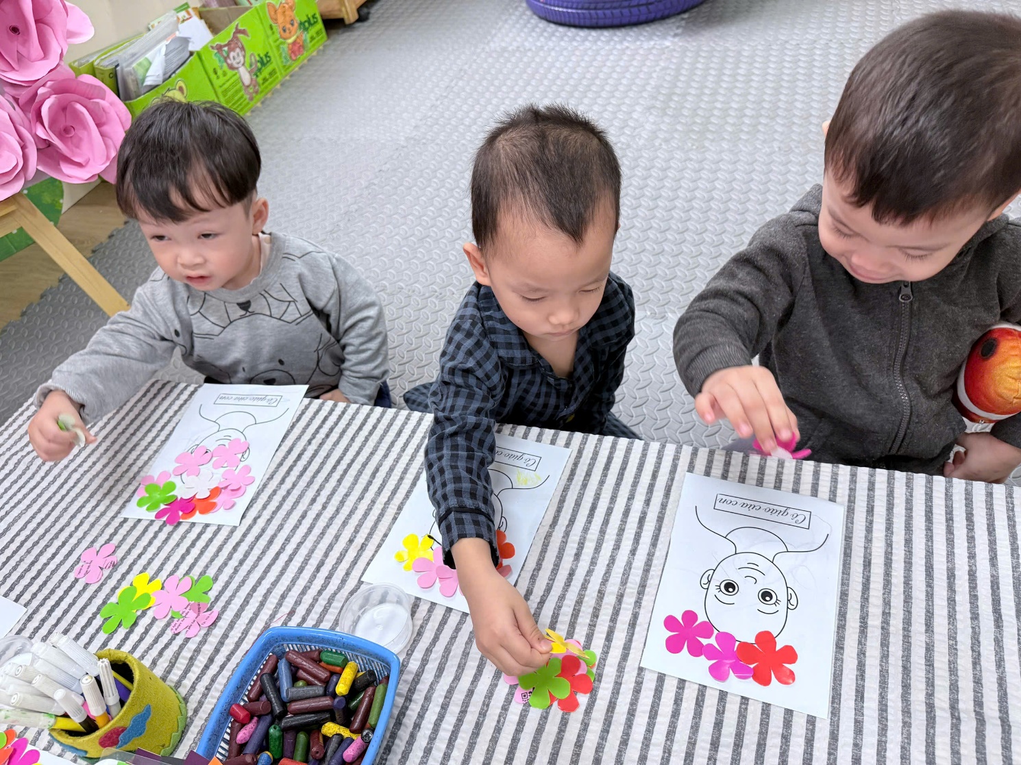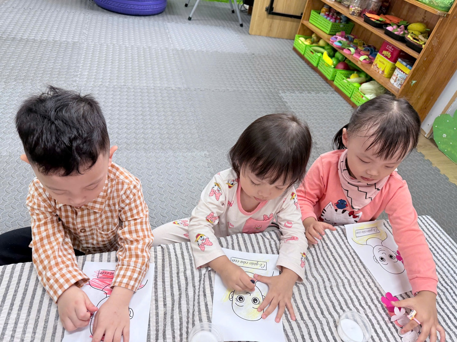 Trong hoạt động này, các con được tô màu gương mặt cô, cắt những bông hoa giấy, rồi khéo léo dán tóc, trang trí cho bức tranh thật rực rỡ. Dù đôi tay nhỏ còn vụng về, thao tác cắt – dán đôi lúc chưa thật tròn trịa, nhưng từng sản phẩm đều chứa đựng tình cảm trong trẻo và sự cố gắng đáng trân quý của các con.