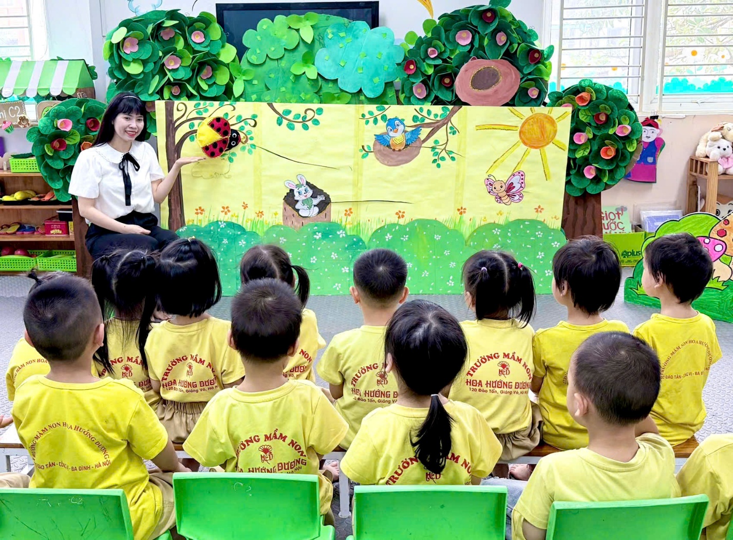 Trong hoạt động, các con được cô giáo giới thiệu nội dung câu chuyện, cùng nhau đàm thoại, trả lời câu hỏi và bày tỏ suy nghĩ về các nhân vật đáng yêu như thỏ con, chim con, bọ rùa và bướm hồng. Qua đó, trẻ không chỉ hiểu nội dung câu chuyện mà còn biết lắng nghe, mạnh dạn chia sẻ ý kiến của mình.