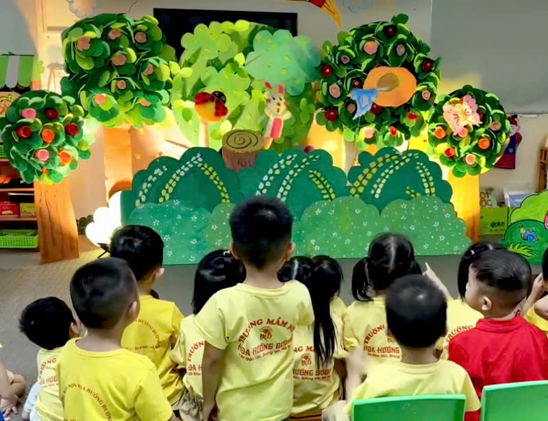 Không chỉ dừng lại ở việc quan sát, các con còn được trực tiếp tham gia trải nghiệm với các con rối, nhập vai nhân vật và cùng nhau sáng tạo nên những “câu chuyện nhỏ” của riêng mình. Từng ánh mắt chăm chú, từng nụ cười rạng rỡ chính là minh chứng cho sự thích thú và niềm vui mà hoạt động mang lại.