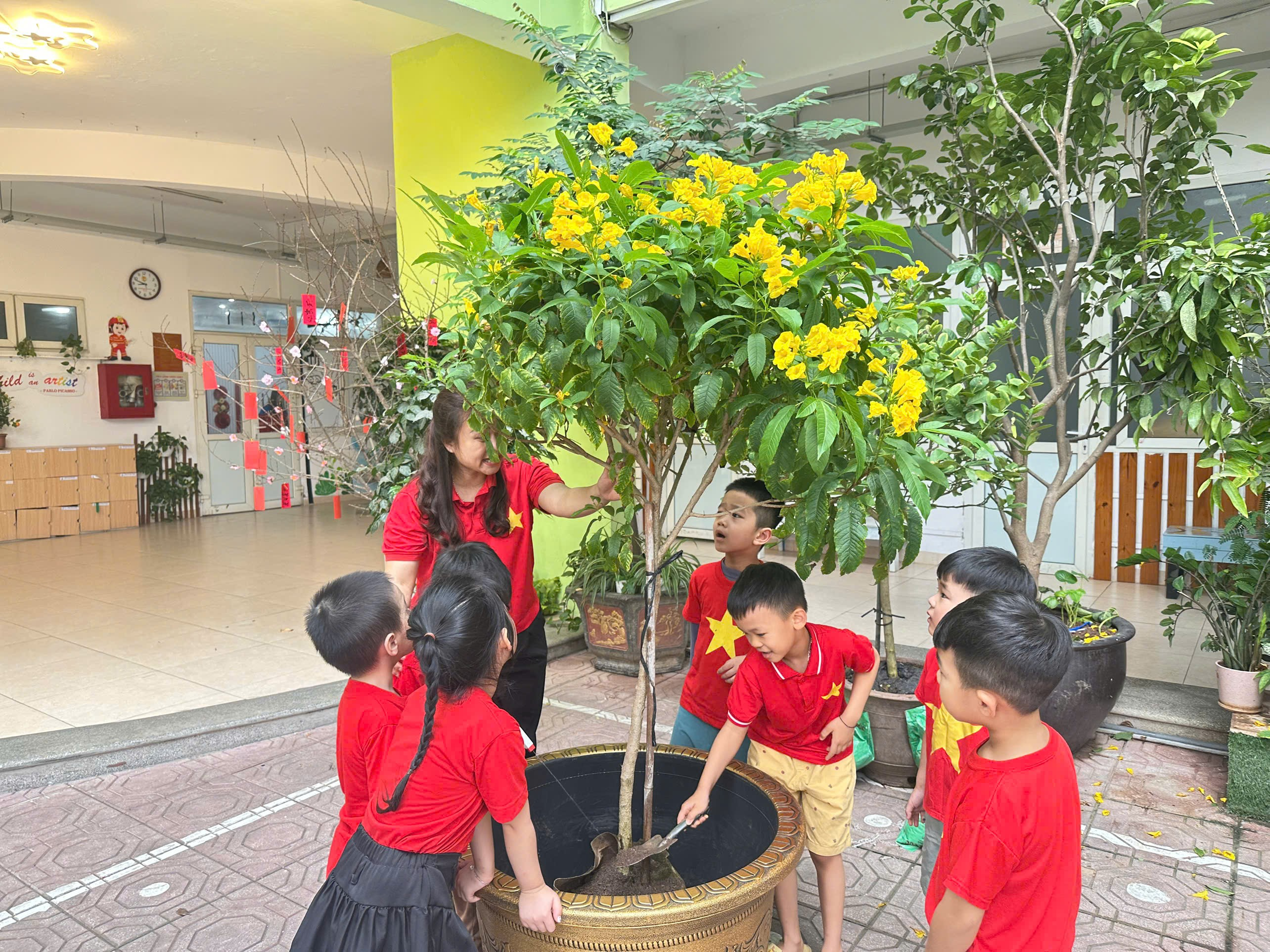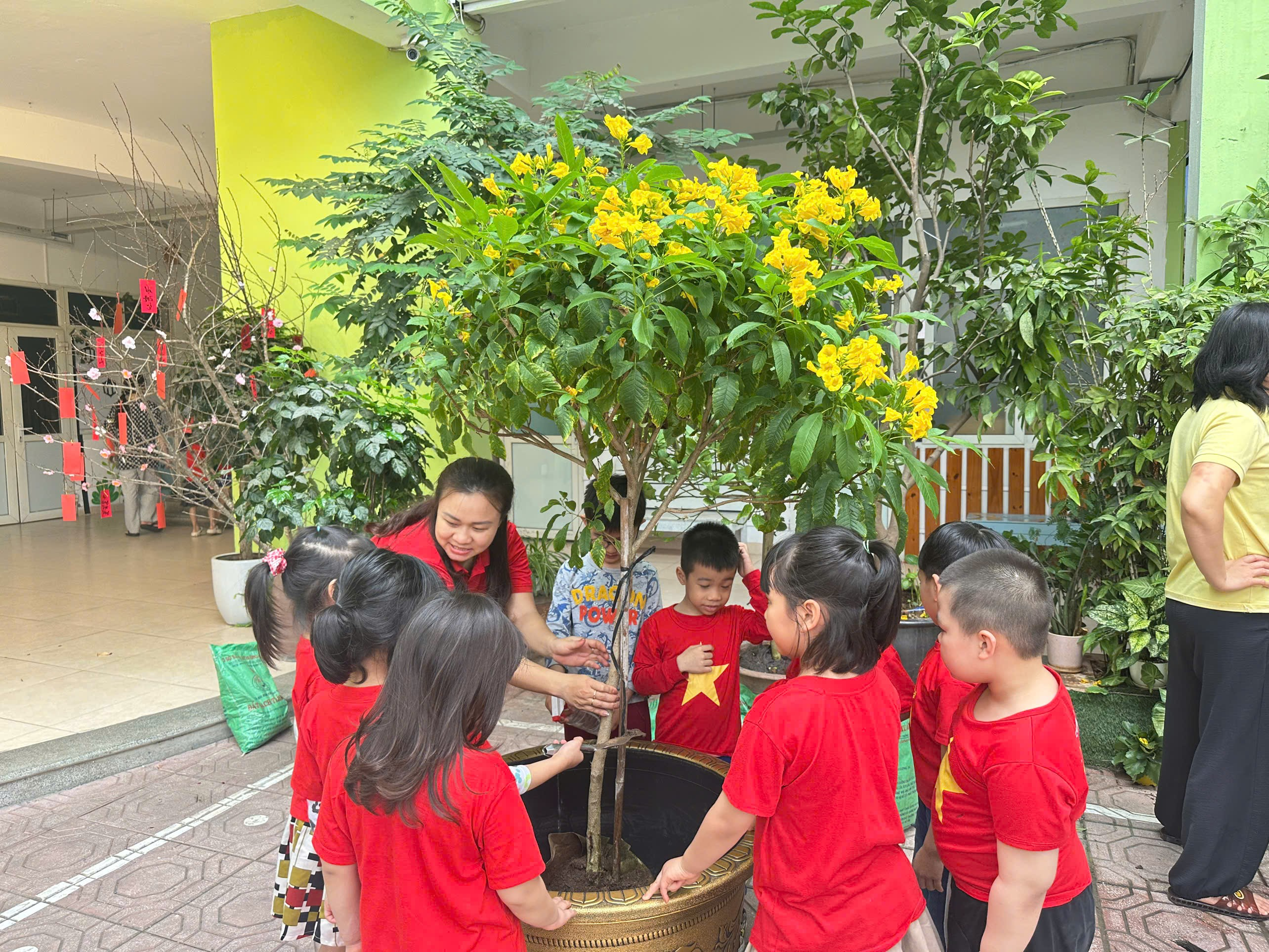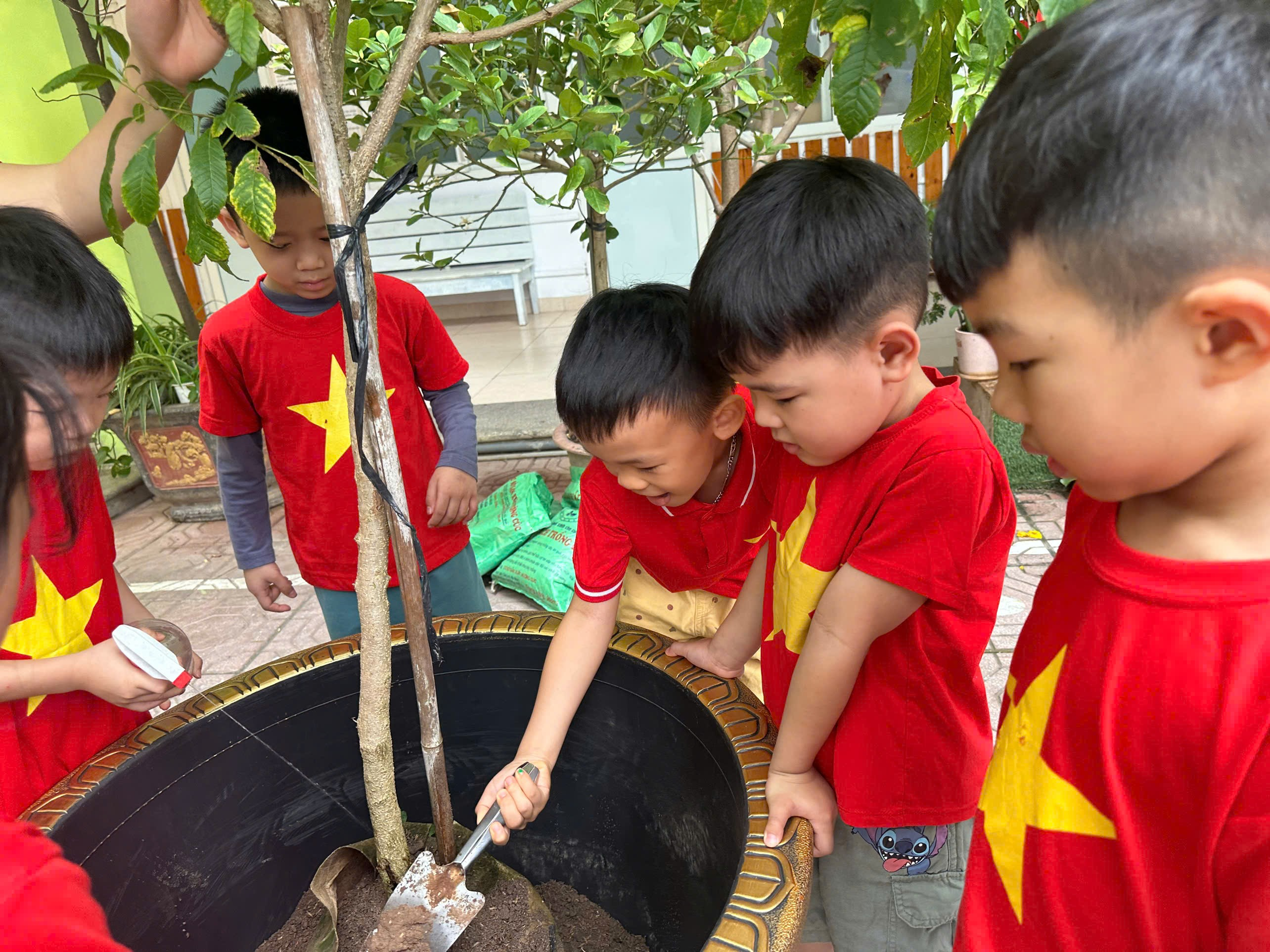 Hưởng ứng phong trào “Tết trồng cây”, các bé lớp Mẫu giáo lớn A1 đã có một buổi trải nghiệm vô cùng ý nghĩa tại sân trường. Dưới sự hướng dẫn của cô giáo, các con được tự tay xúc đất, đặt cây giống vào hố và nhẹ nhàng vun đất xung quanh. Những đôi bàn tay nhỏ xinh cẩn thận tưới từng gáo nước mát cho cây non. Khu vườn nhỏ của lớp vì thế trở nên rộn ràng tiếng cười và tràn đầy sức sống. Sau đây xin mời bố mẹ cùng ngắm những hình ảnh đáng yêu của các con: