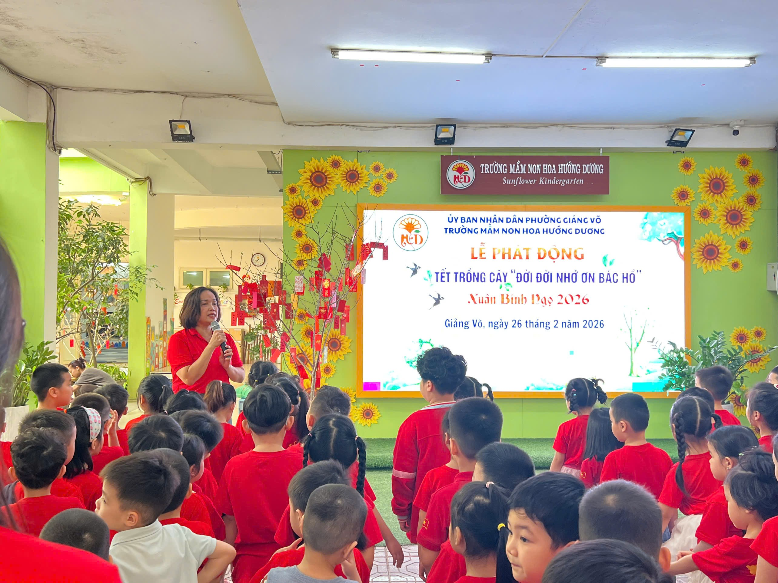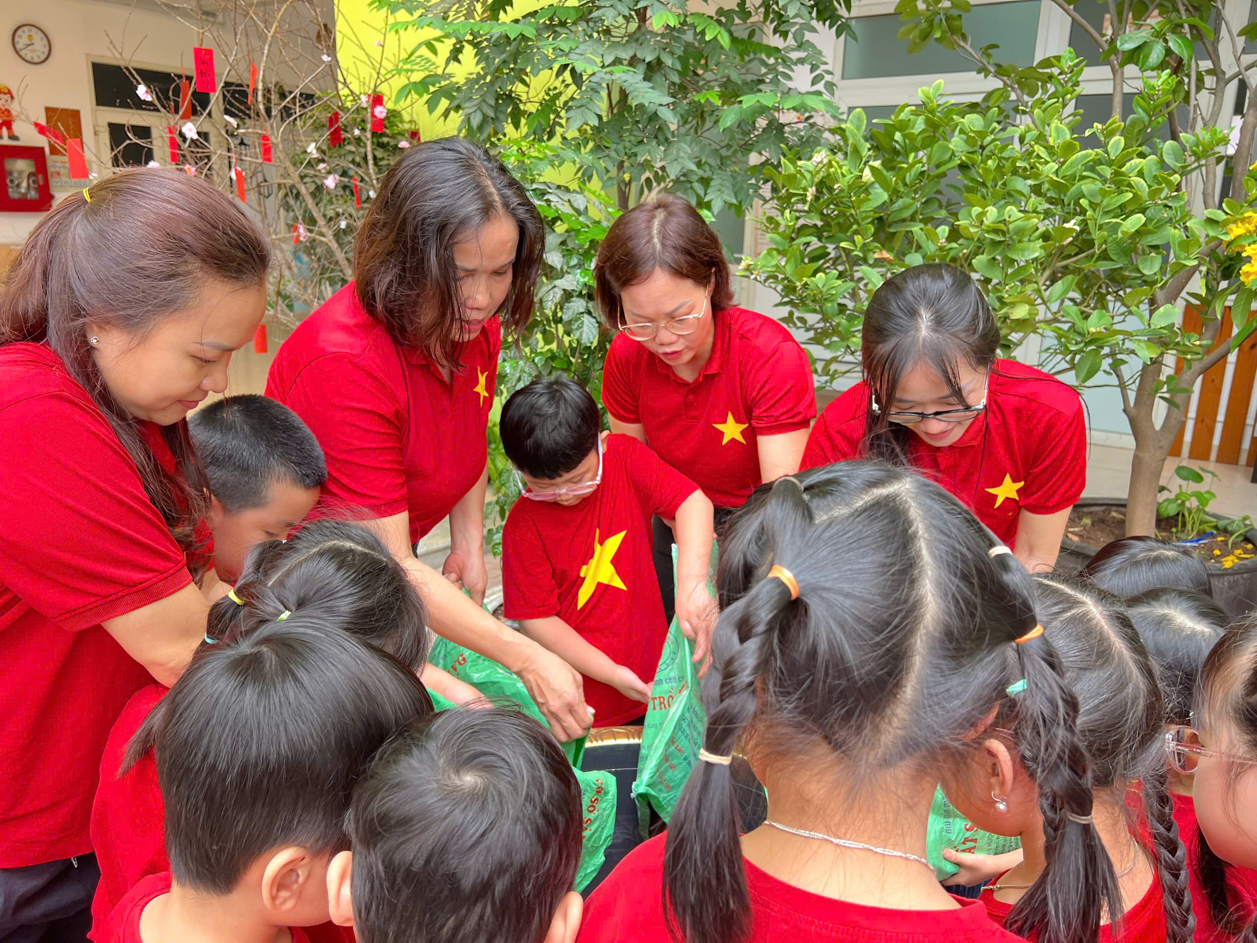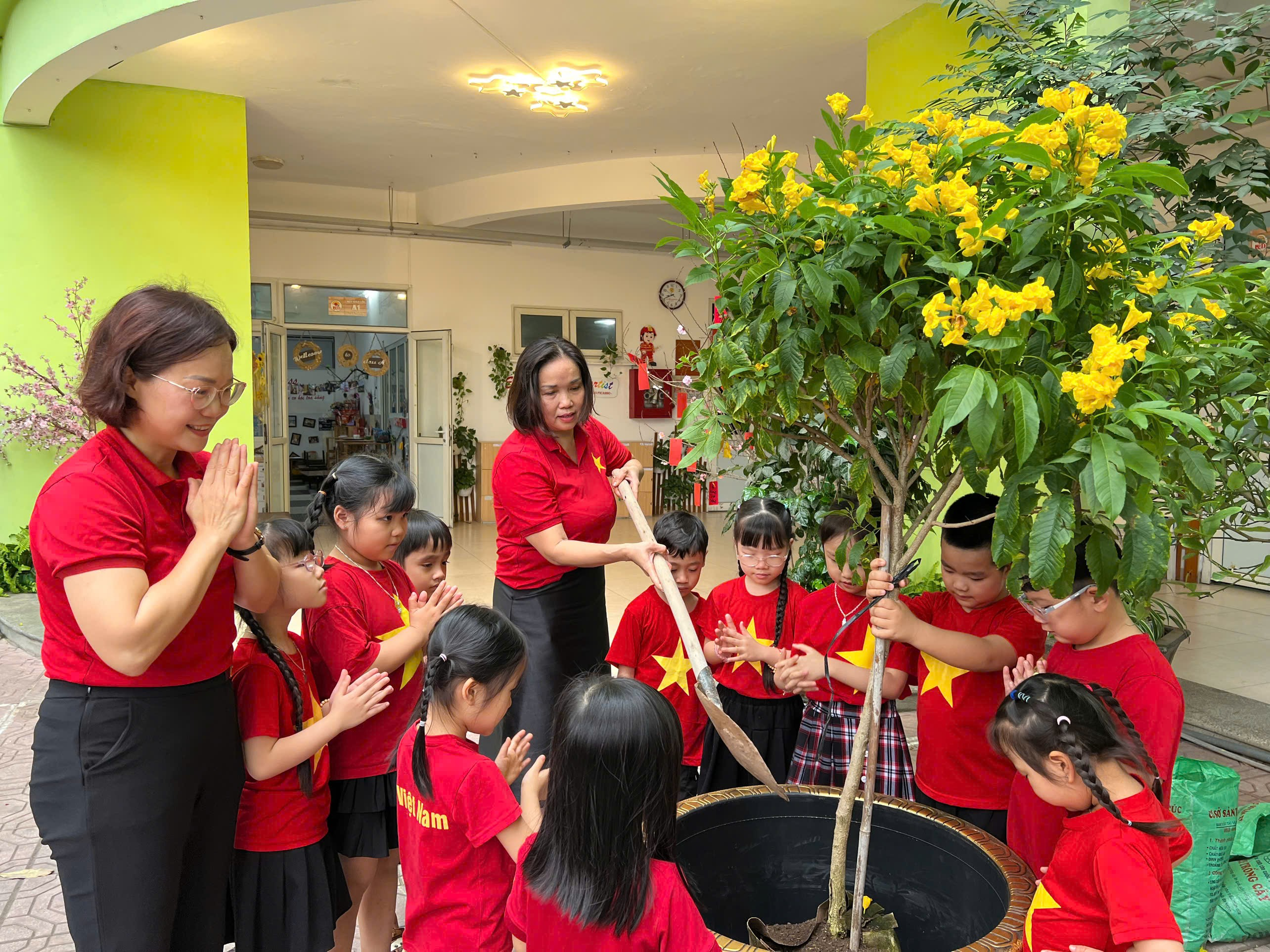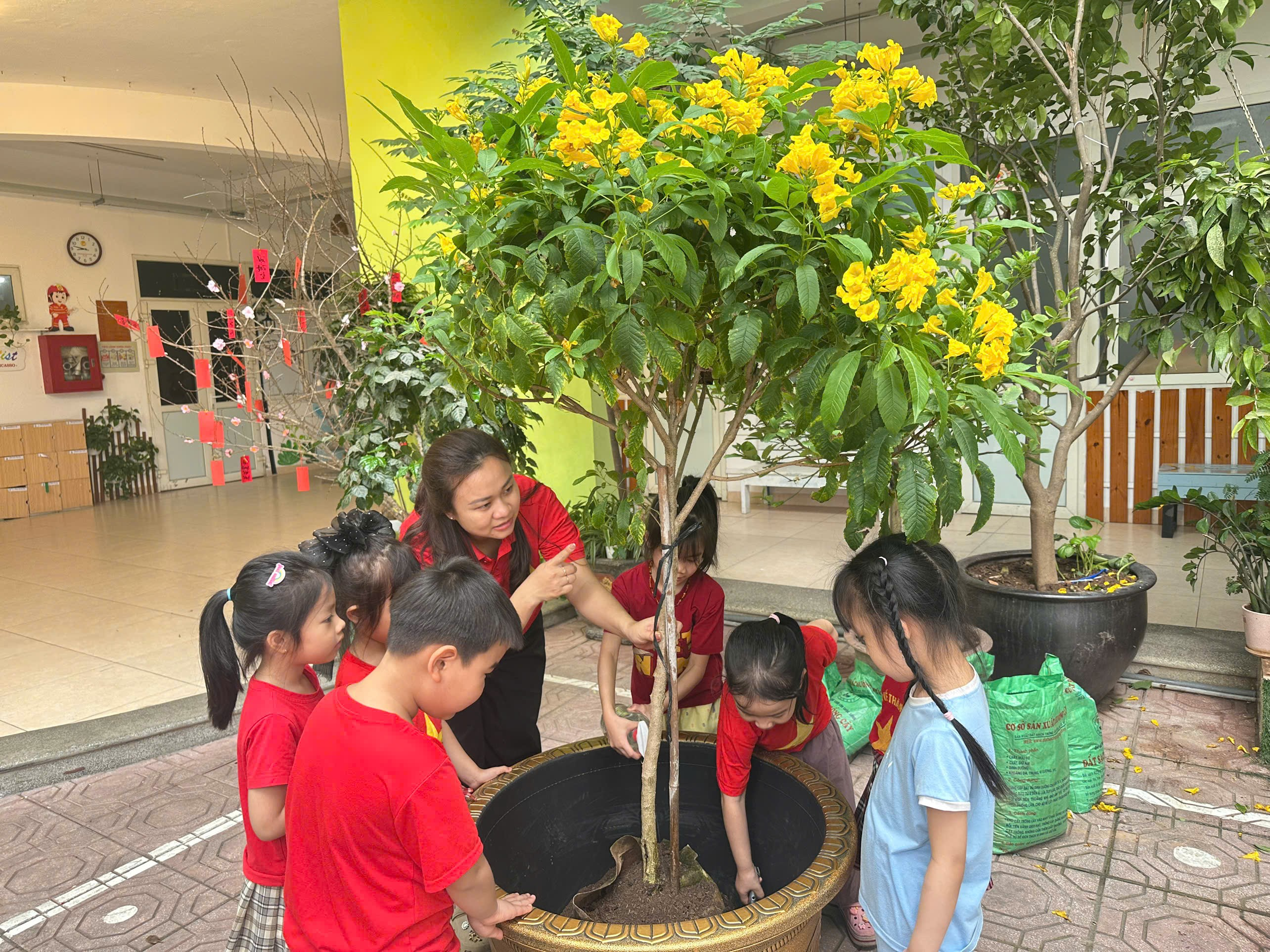 Hưởng ứng phong trào “Tết trồng cây”, các bé lớp Mẫu giáo lớn A1 đã có một buổi trải nghiệm vô cùng ý nghĩa tại sân trường. Dưới sự hướng dẫn của cô giáo, các con được tự tay xúc đất, đặt cây giống vào hố và nhẹ nhàng vun đất xung quanh. Những đôi bàn tay nhỏ xinh cẩn thận tưới từng gáo nước mát cho cây non. Khu vườn nhỏ của lớp vì thế trở nên rộn ràng tiếng cười và tràn đầy sức sống. Sau đây xin mời bố mẹ cùng ngắm những hình ảnh đáng yêu của các con: