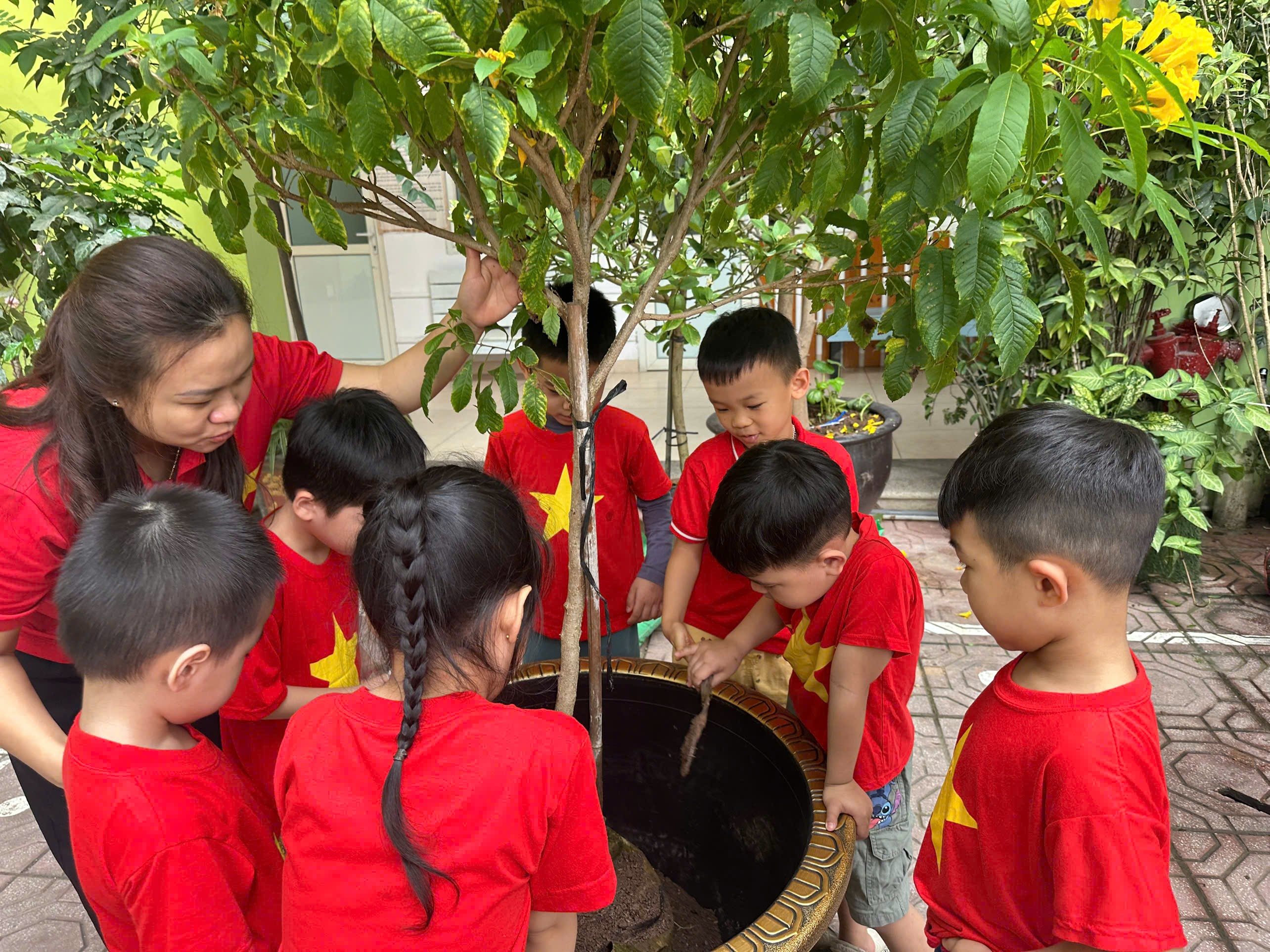Các bé lớp Mẫu giáo lớn A1 hào hứng tham gia hoạt động trồng và tưới cây, lan tỏa thông điệp yêu thiên nhiên và bảo vệ môi trường.