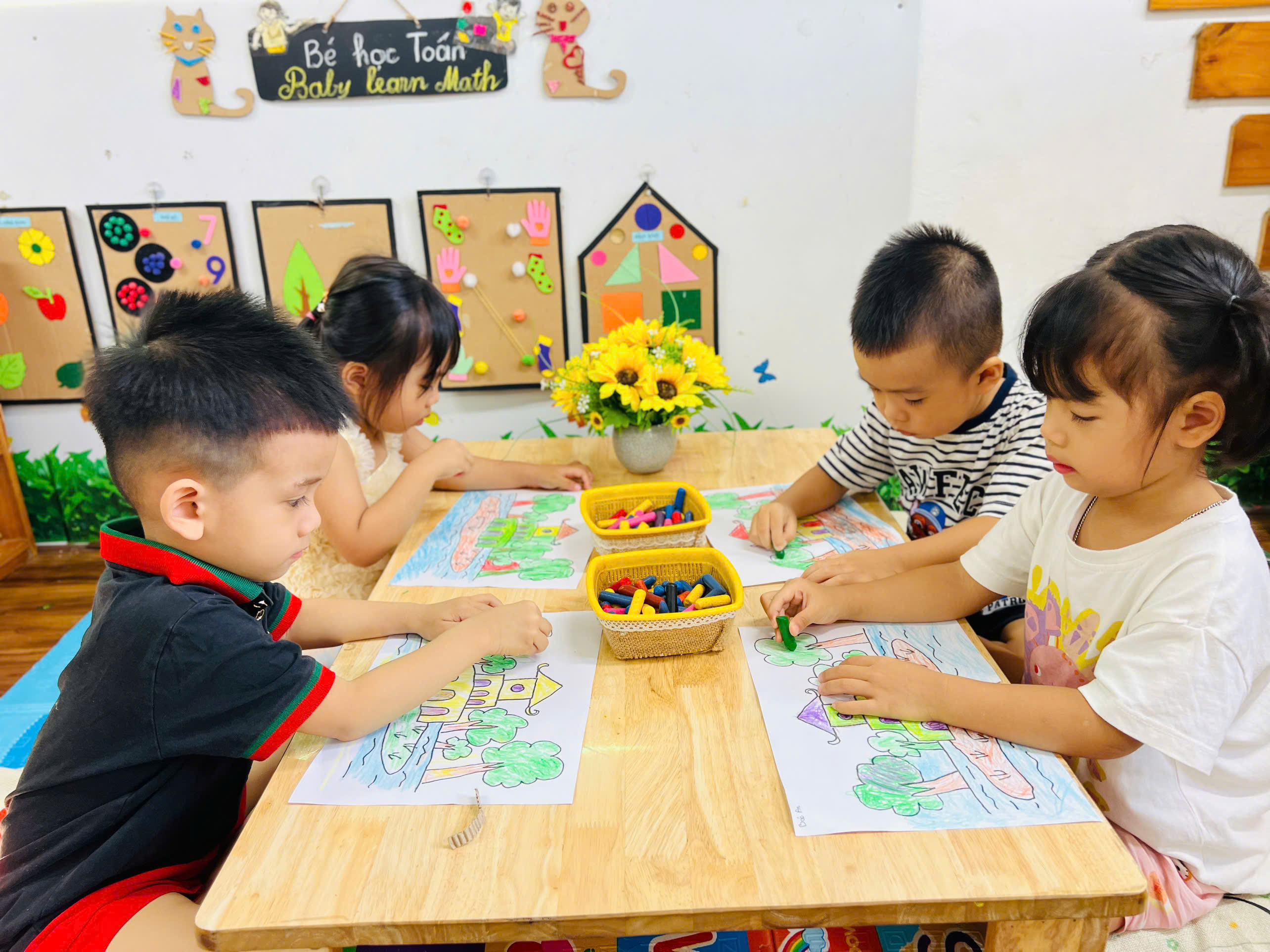 Sau phần trò chuyện, các bé tham gia hoạt động tạo hình chủ đề “Hà Nội trong mắt em”, các bé cùng nhau tham gia hoạt động tô màu những bức tranh thật đẹp: Tháp Rùa, hoa sen, lá cờ Tổ quốc, … Mỗi bức tranh là một cảm xúc, thể hiện tình yêu và niềm tự hào về Hà Nội thân yêu. Bé nào cũng chăm chú, tỉ mỉ, gương mặt rạng rỡ và đầy hứng khởi.