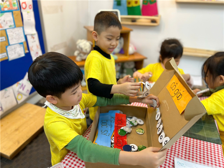 Chúng tớ đang cùng nhau chơi các trò chơi chữ cái và góc làm quen văn học