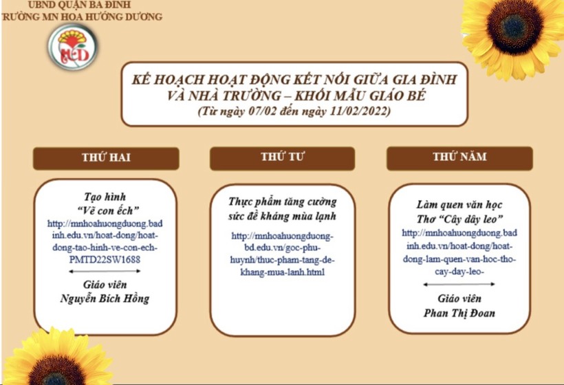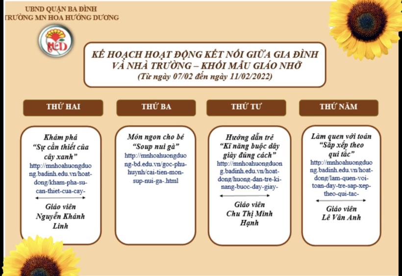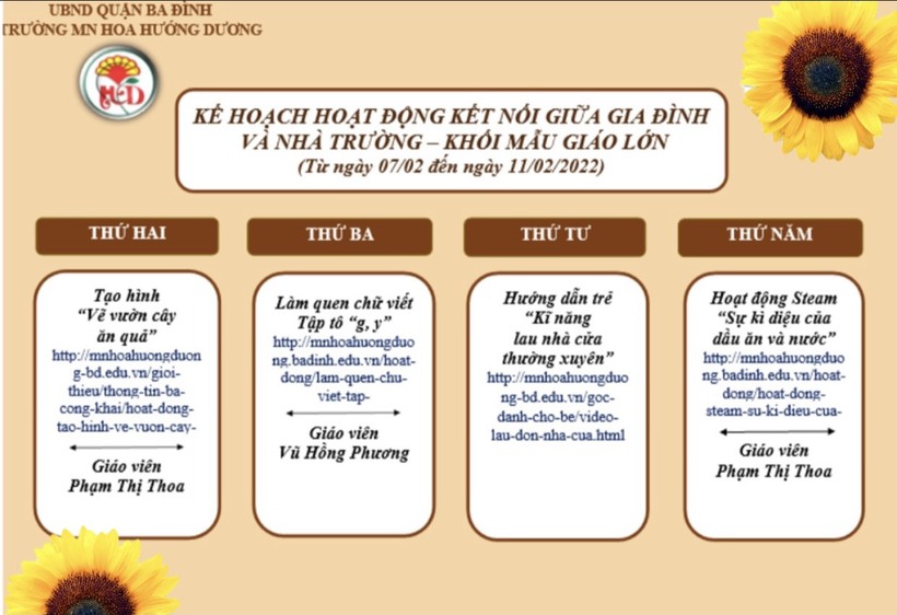 Trường Mầm non Hoa Hướng Dương xây dựng kế hoạch hoạt động kết nối với gia đình, trẻ em trong thời gian tạm dừng đến trường do dịch Covid 19 thời gian từ ngày 07/02 -11