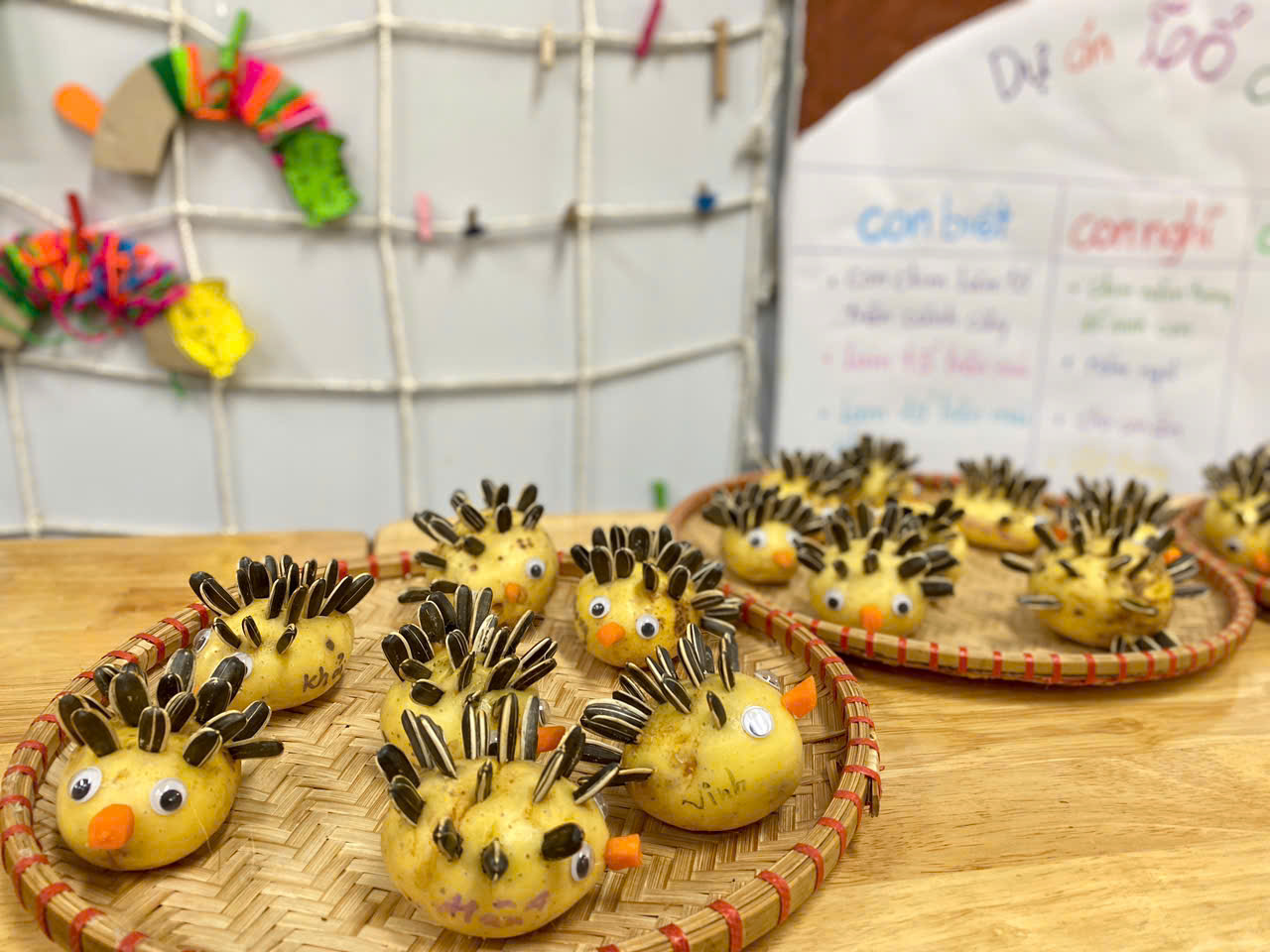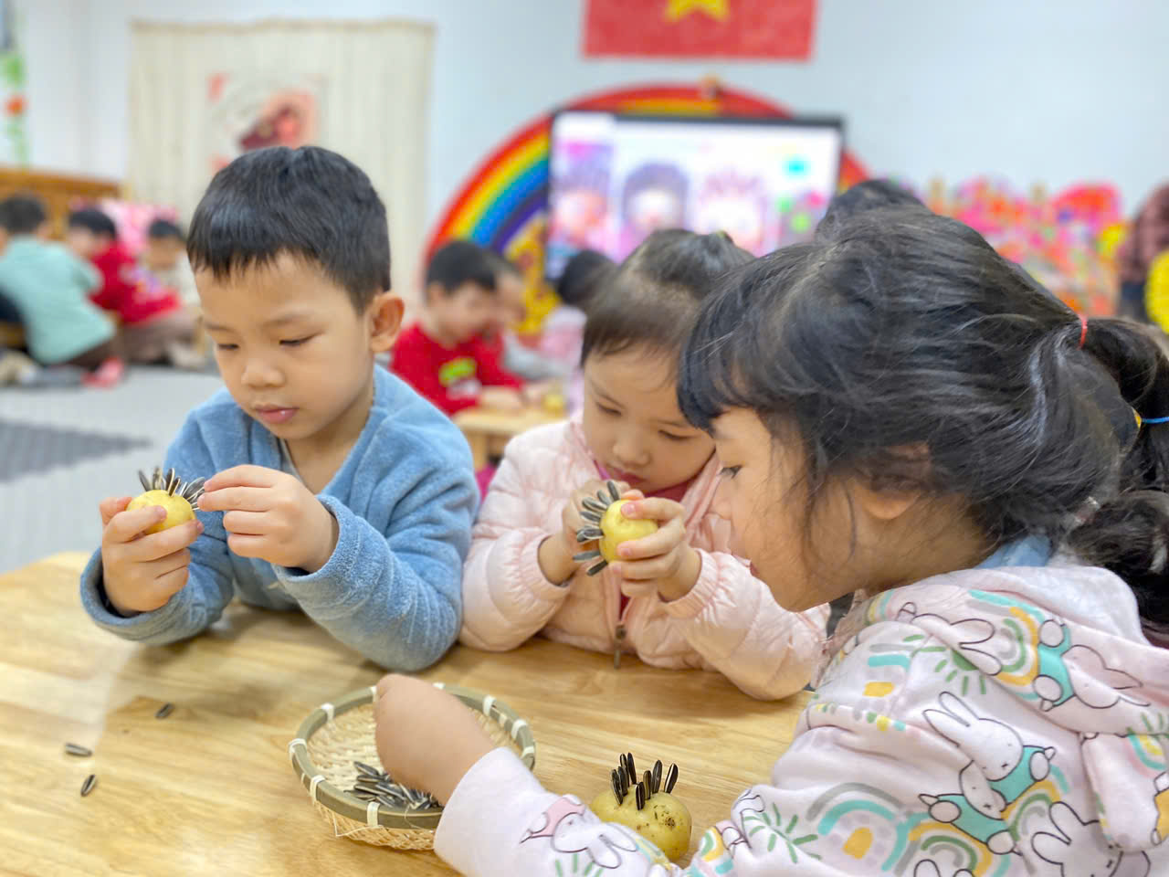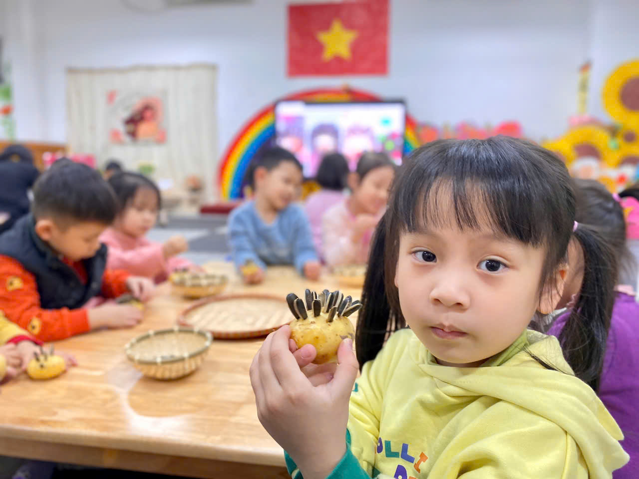 Tiếng cười rộn rã vang khắp lớp Mẫu giáo nhỡ B3 khi những chú nhím khoai tây dần xuất hiện. Các bé say sưa gắn từng chiếc gai hướng dương, tỉ mỉ vẽ mắt mũi cho "người bạn" của mình. Niềm vui và sự sáng tạo của các bé đã tạo nên một buổi học thật đặc biệt!"