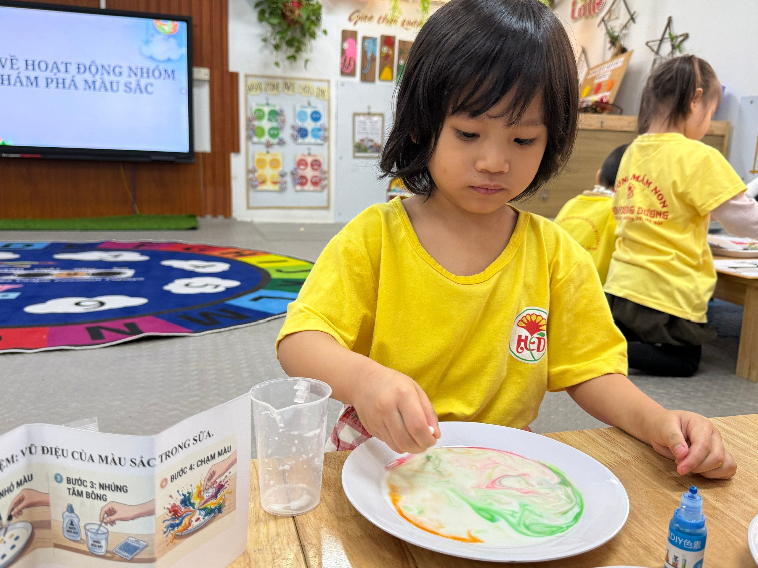 Không chỉ dừng lại ở việc quan sát, các bé còn được tham gia những thí nghiệm khoa học nhỏ đầy bất ngờ. Thí nghiệm “Cơn mưa sắc màu” khiến các bé vô cùng thích thú khi những giọt màu từ từ lan tỏa như cơn mưa rực rỡ. Đặc biệt, thí nghiệm “Sự chuyển động của dải lụa màu sắc trong sữa” khi chấm nước rửa chén vào đã tạo nên những chuyển động màu sắc kỳ diệu, khiến cả lớp không khỏi trầm trồ và hào hứng.