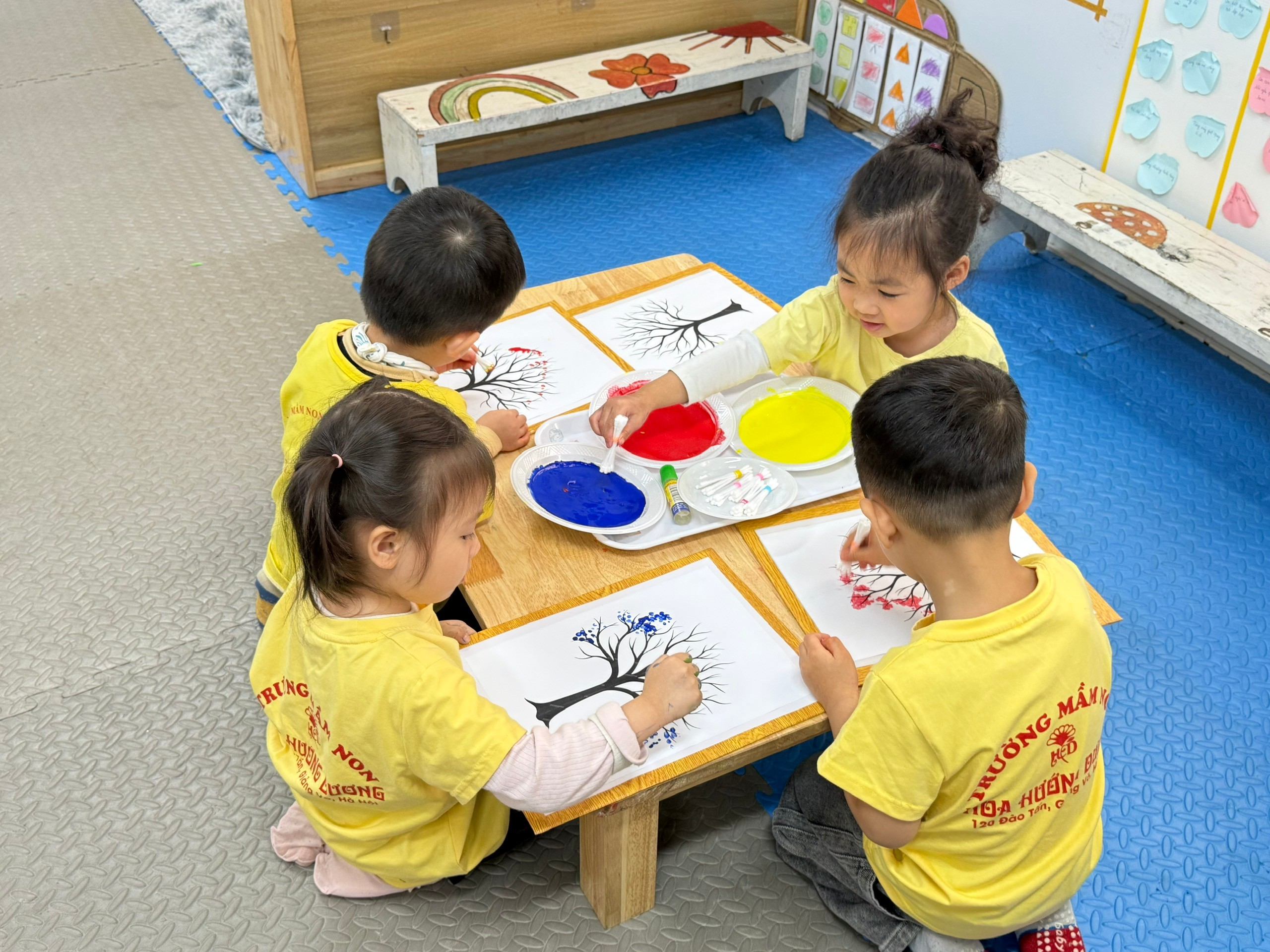 Sau phần khám phá, các bé còn được tham gia hoạt động tạo hình chấm hoa cho cây, sử dụng các màu sắc vừa học để trang trí nên những bông hoa rực rỡ. Qua đó, trẻ không chỉ phát huy khả năng sáng tạo mà còn rèn luyện sự khéo léo của đôi tay.