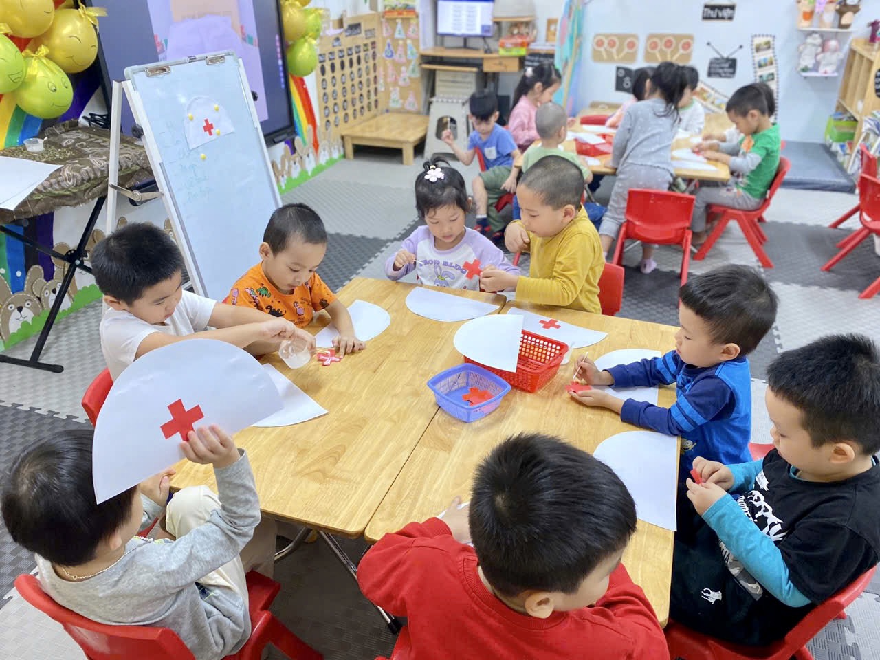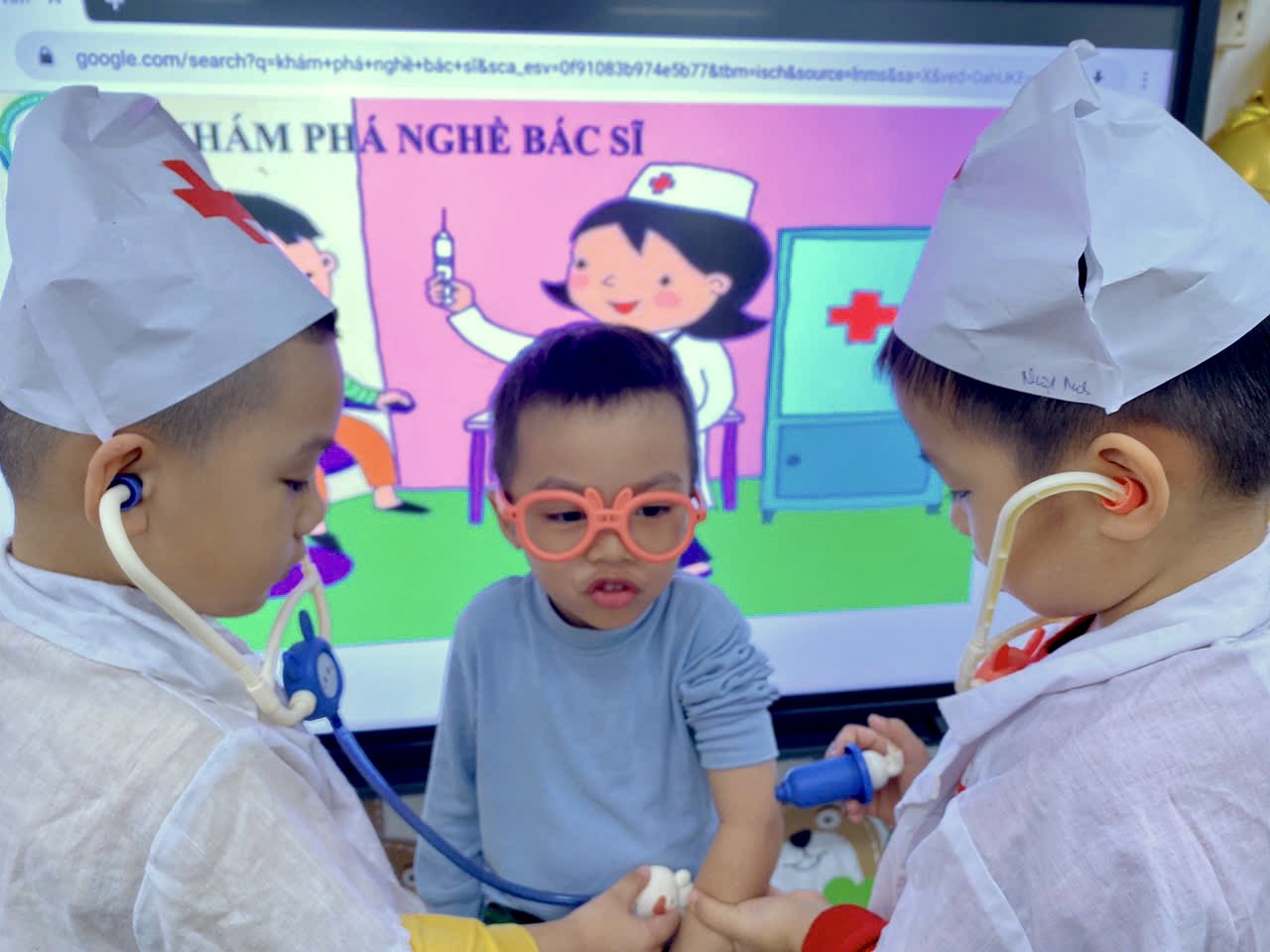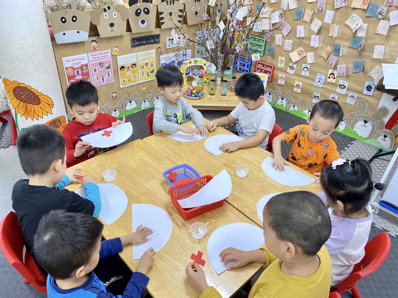 Dưới sự hướng dẫn của cô giáo, các bé đã cùng nhau quan sát mẫu mũ bác sĩ, trò chuyện về công việc của bác sĩ và bắt tay vào tự tay tạo nên những chiếc mũ đáng yêu của riêng mình. Với những tờ giấy trắng, kéo, hồ dán và chút khéo léo, đôi bàn tay nhỏ xinh của các bé đã biến những vật liệu đơn giản trở thành những chiếc mũ bác sĩ xinh xắn, có hình dấu thập đỏ nổi bật ở giữa. Bé nào cũng hào hứng, chăm chú cắt, dán, trang trí cho chiếc mũ của mình thật đẹp. Không chỉ giúp trẻ rèn luyện sự khéo léo và khả năng tập trung, hoạt động còn mang đến cho các bé niềm vui được hóa thân thành “bác sĩ nhí”, biết yêu quý và trân trọng nghề nghiệp cao quý – nghề chăm sóc, cứu chữa người bệnh.